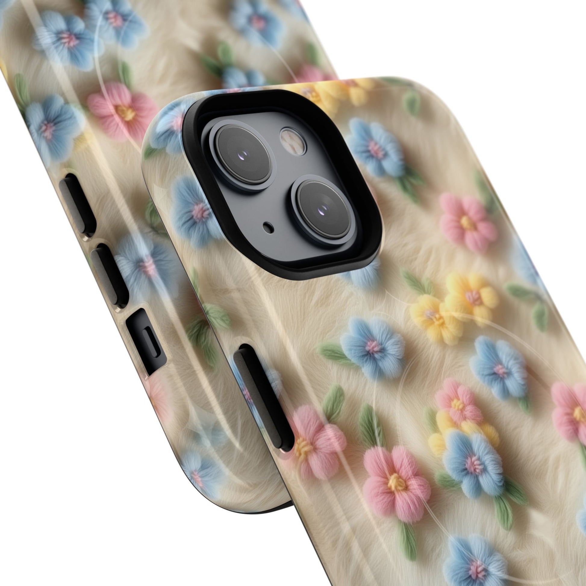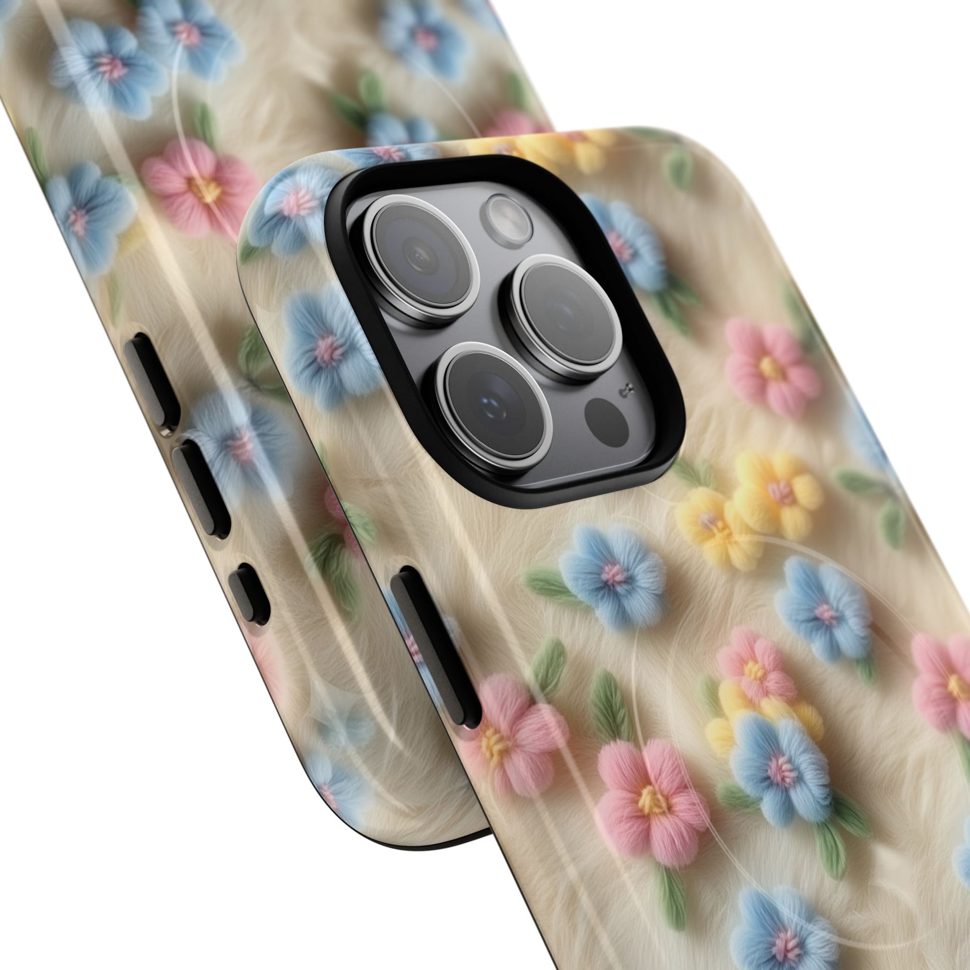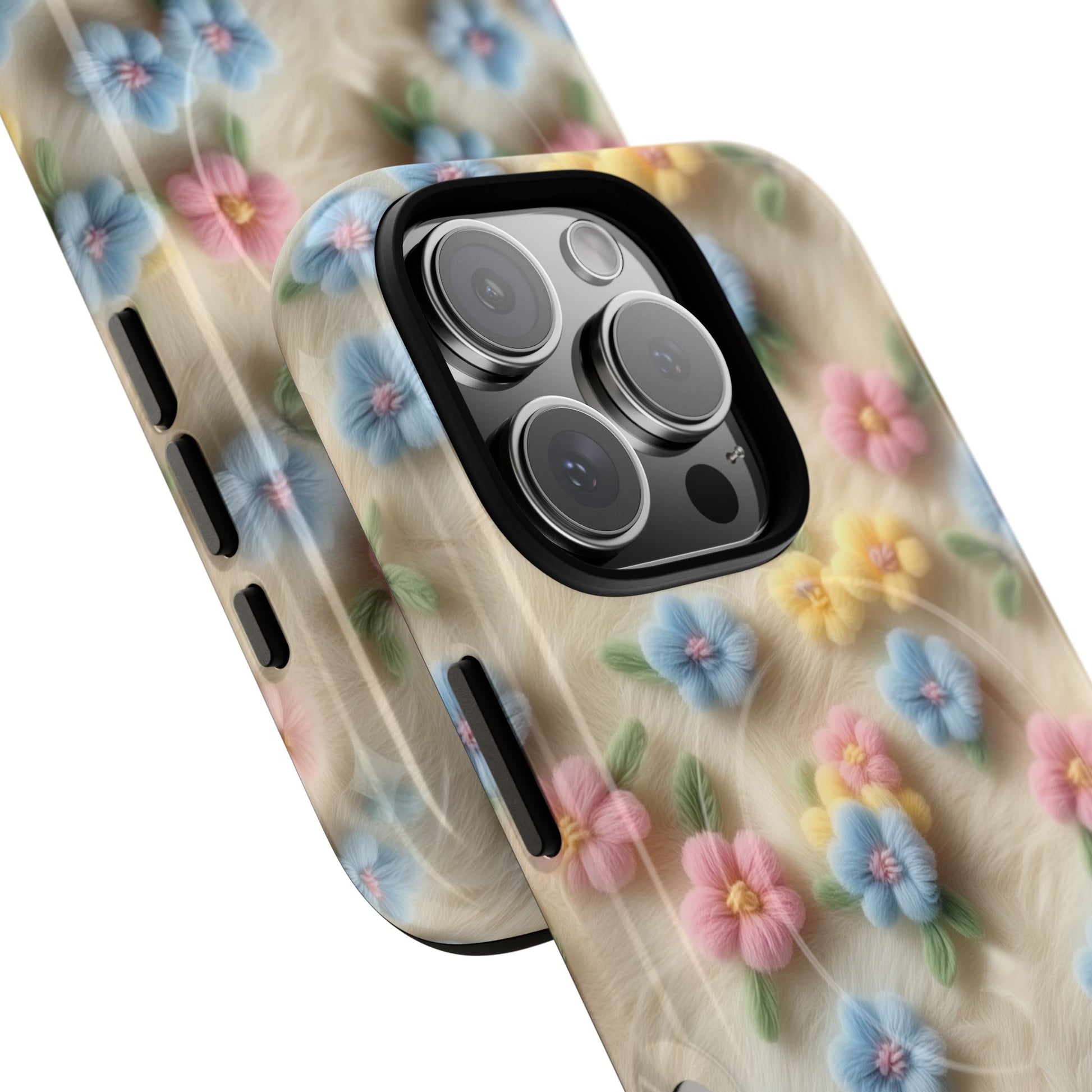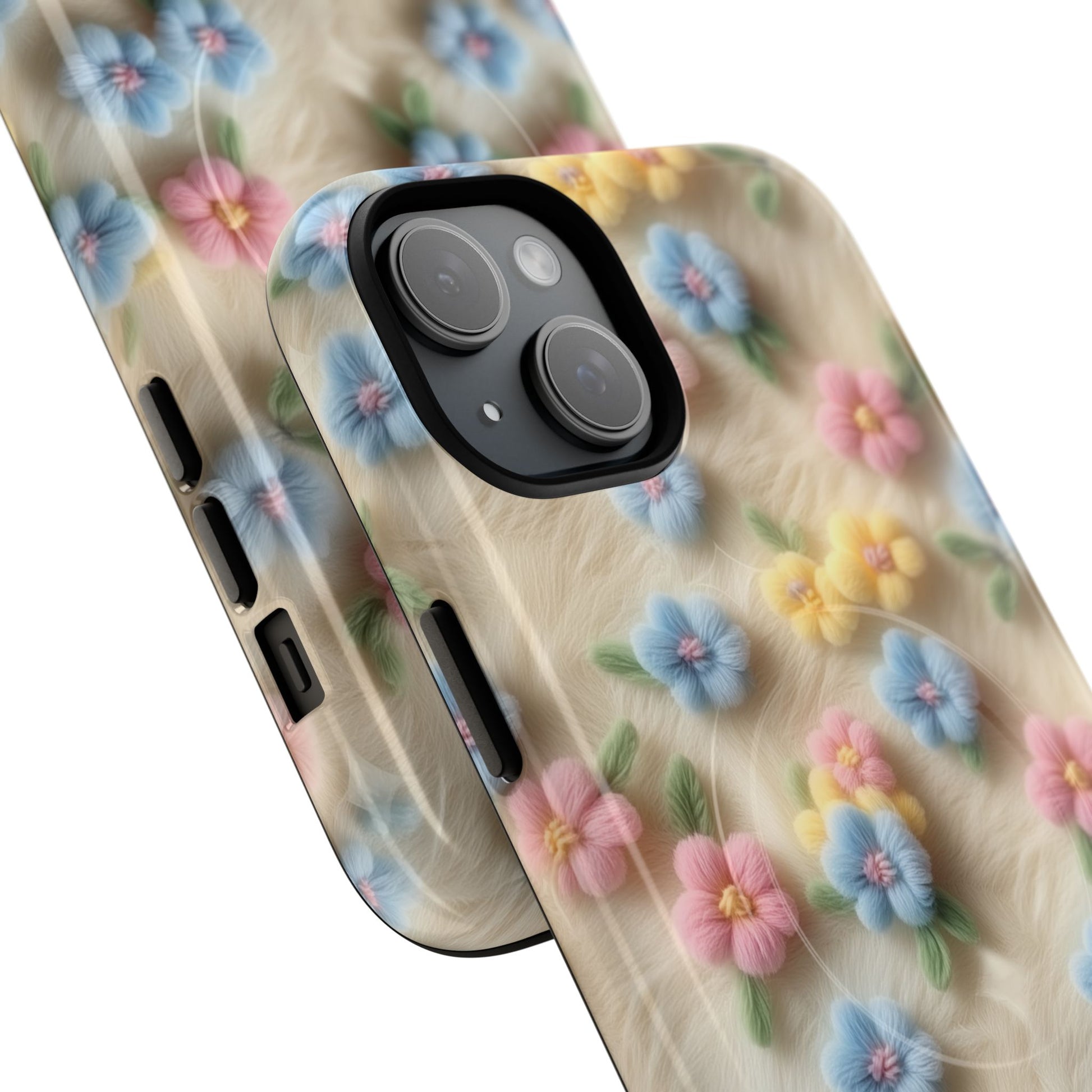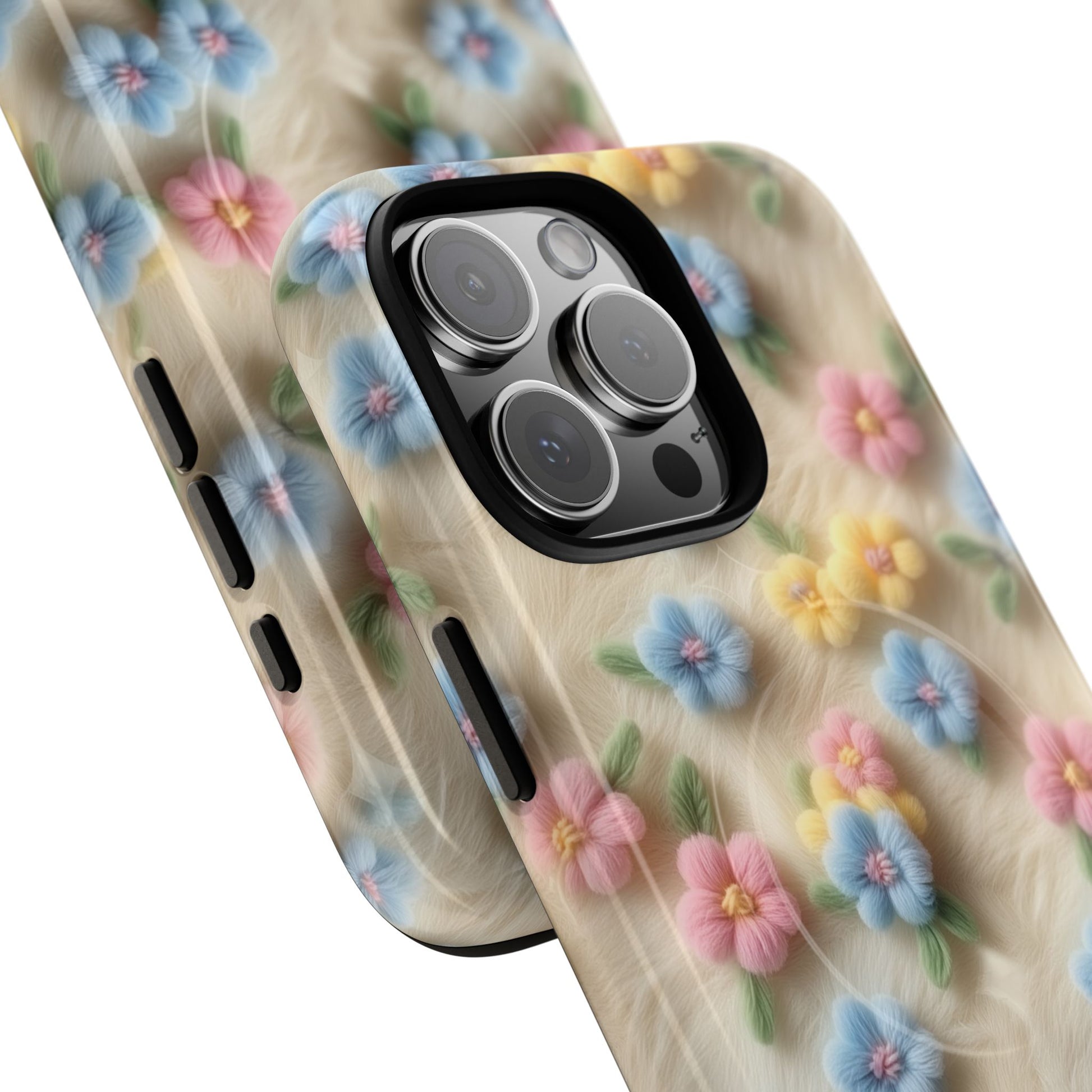 A slim, protective phone case featuring a soft embroidered floral pattern that blends delicate detail with a cozy, elegant aesthetic. Tiny blossoms in shades of pink, red, yellow, white, and light blue appear scattered across a creamy background, each flower connected by slender green stems that give the design a light, garden-inspired feel. The embroidered look adds subtle texture and charm while maintaining a clean, modern finish. Available in glossy or matte, the pattern remains crisp and vibrant while feeling smooth in hand. Built with a dual-layer shell and a shock-absorbing TPU liner, it helps protect your phone from everyday drops while staying slim and comfortable to hold. MagSafe® compatibility ensures your daily routine stays effortless—chargers, wallets, and grips attach instantly without removing the case. It’s a gentle blend of floral beauty and dependable protection.
