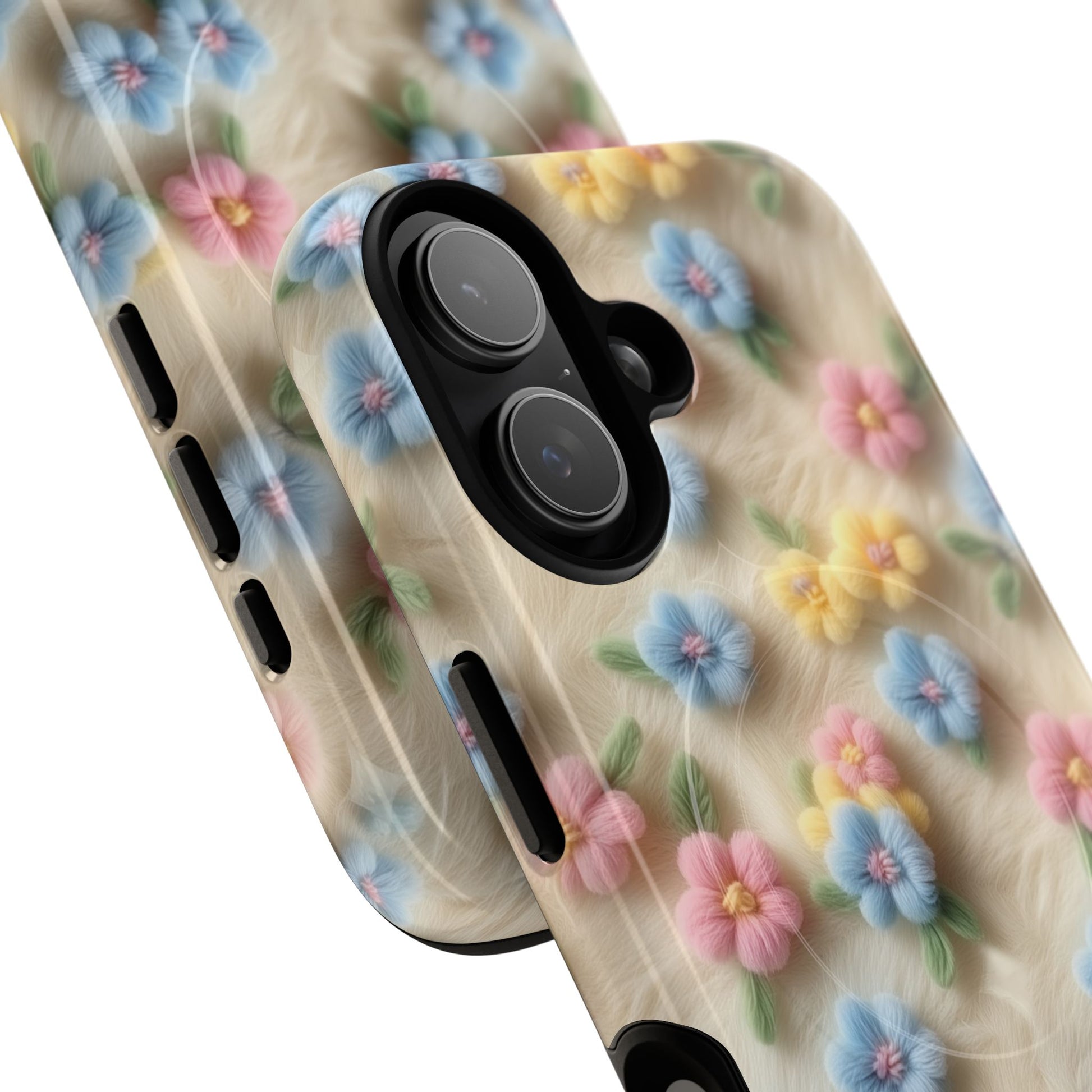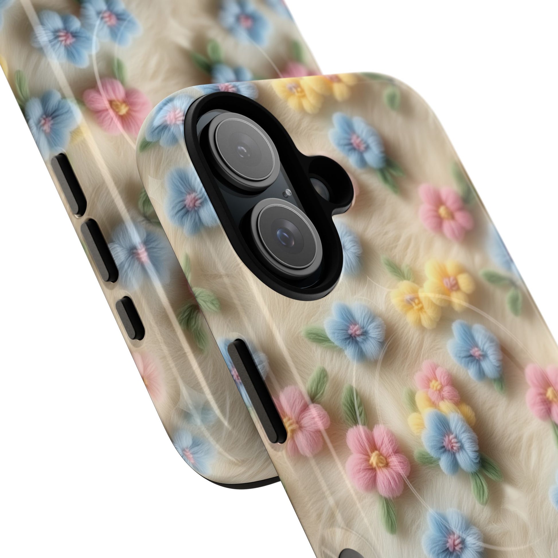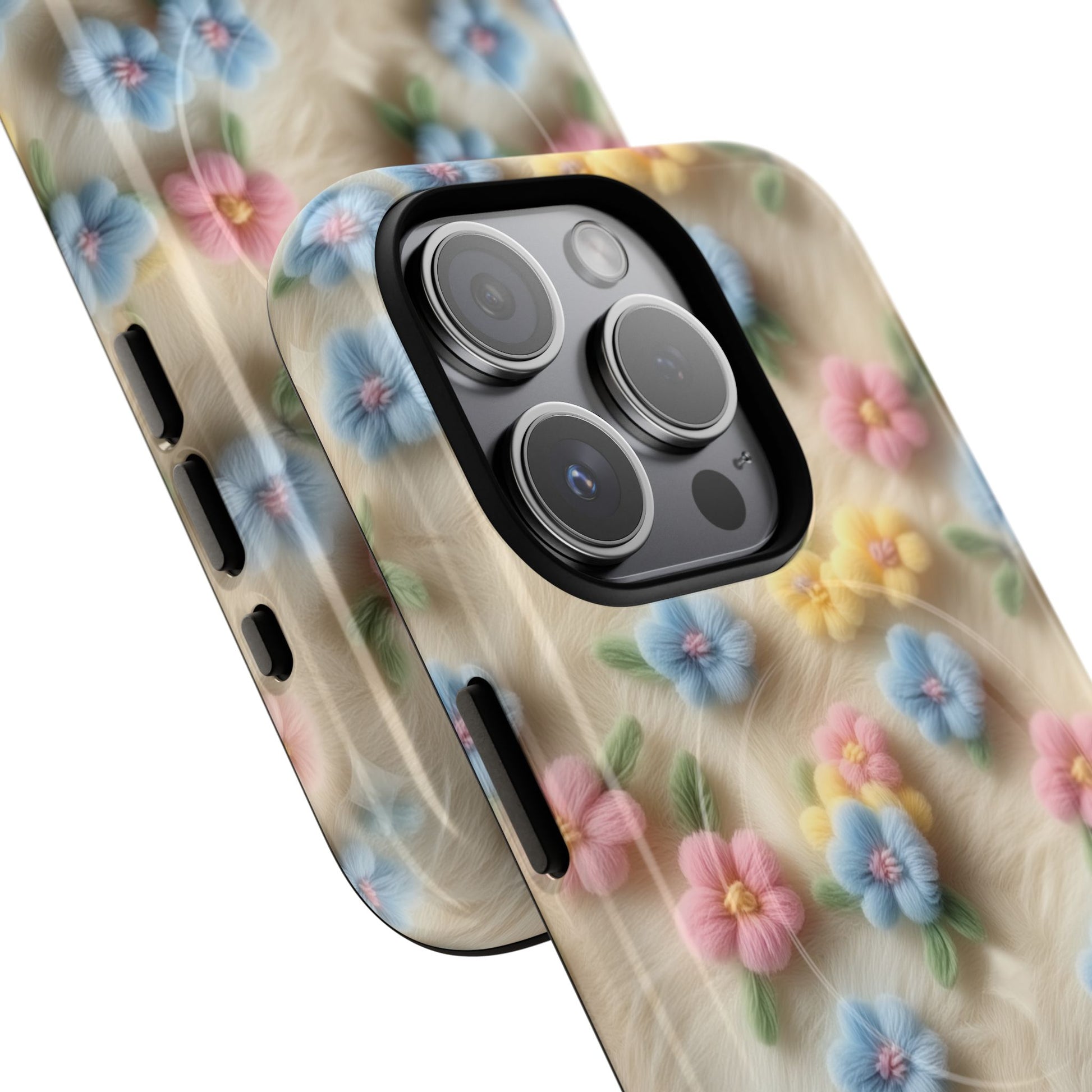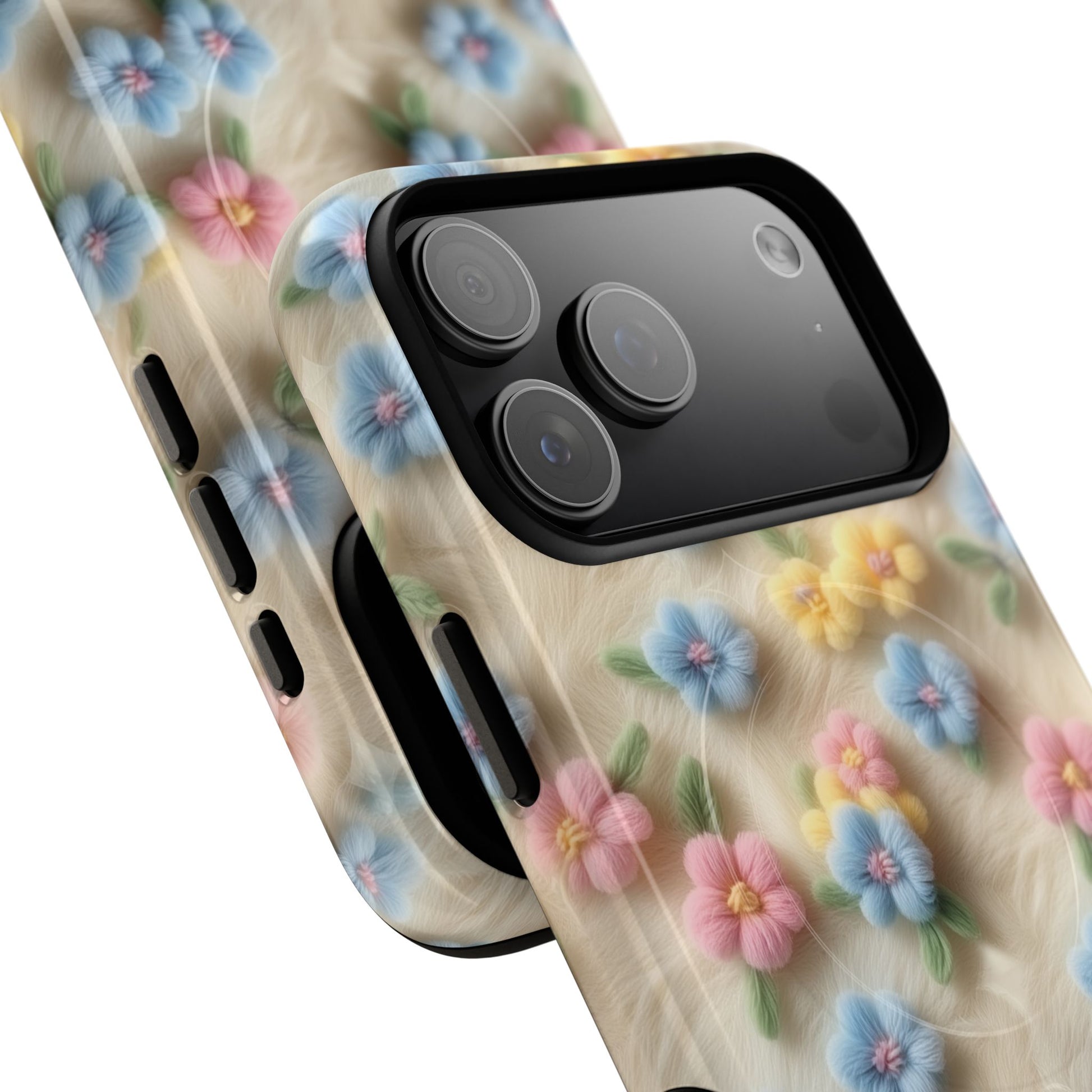 A slim, protective phone case featuring a soft embroidered floral pattern that blends delicate detail with a cozy, elegant aesthetic. Tiny blossoms in shades of pink, red, yellow, white, and light blue appear scattered across a creamy background, each flower connected by slender green stems that give the design a light, garden-inspired feel. The embroidered look adds subtle texture and charm while maintaining a clean, modern finish. Available in glossy or matte, the pattern remains crisp and vibrant while feeling smooth in hand. Built with a dual-layer shell and a shock-absorbing TPU liner, it helps protect your phone from everyday drops while staying slim and comfortable to hold. MagSafe® compatibility ensures your daily routine stays effortless—chargers, wallets, and grips attach instantly without removing the case. It’s a gentle blend of floral beauty and dependable protection.