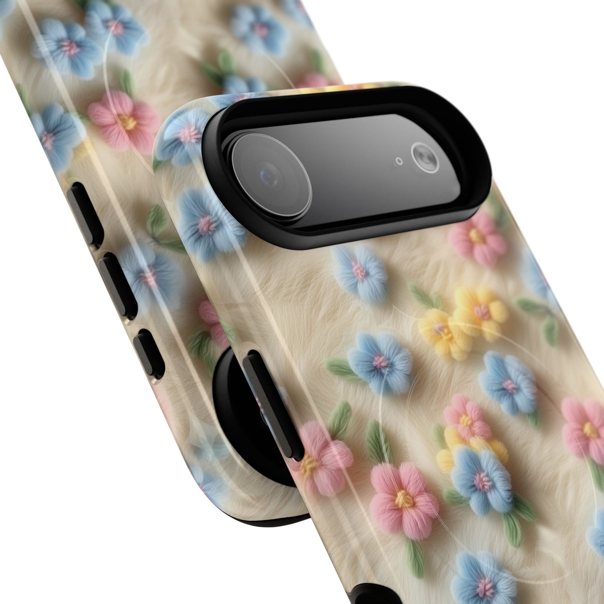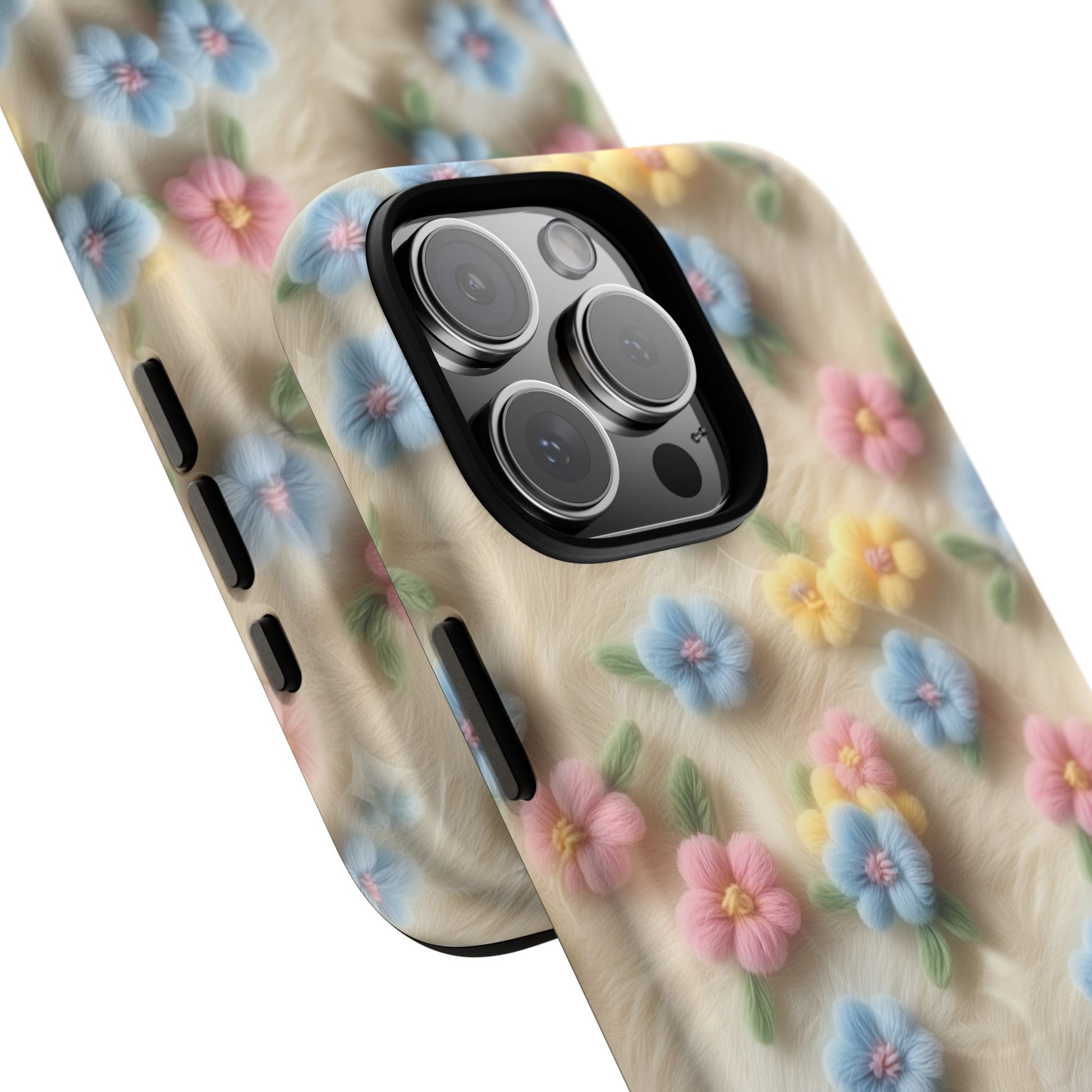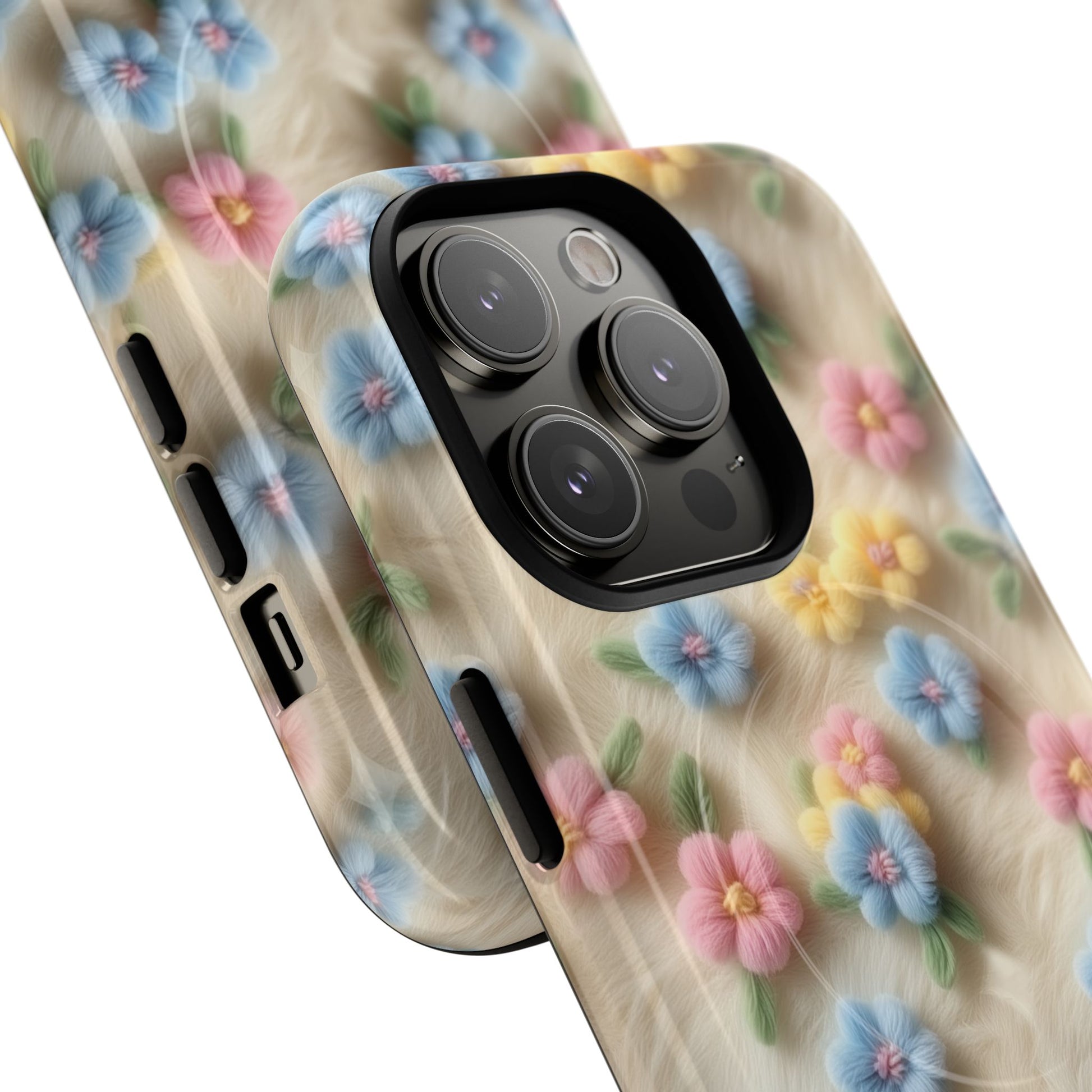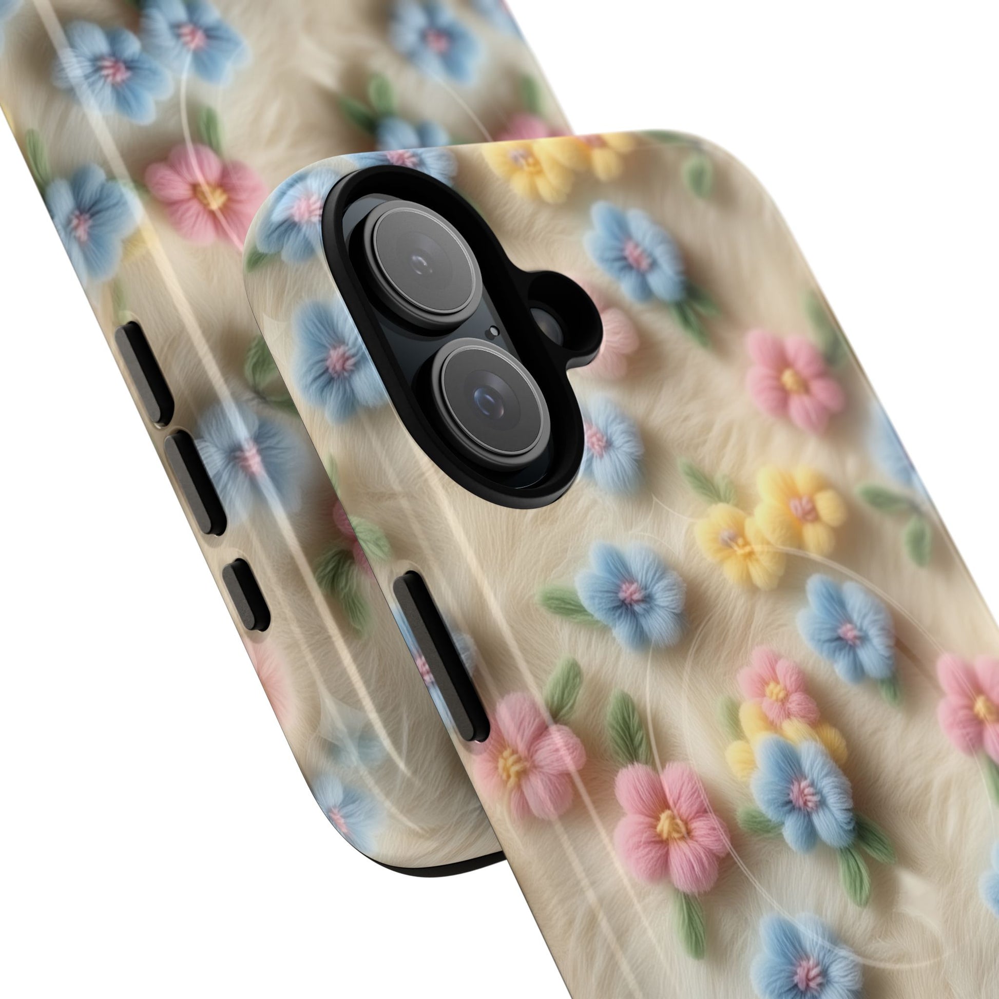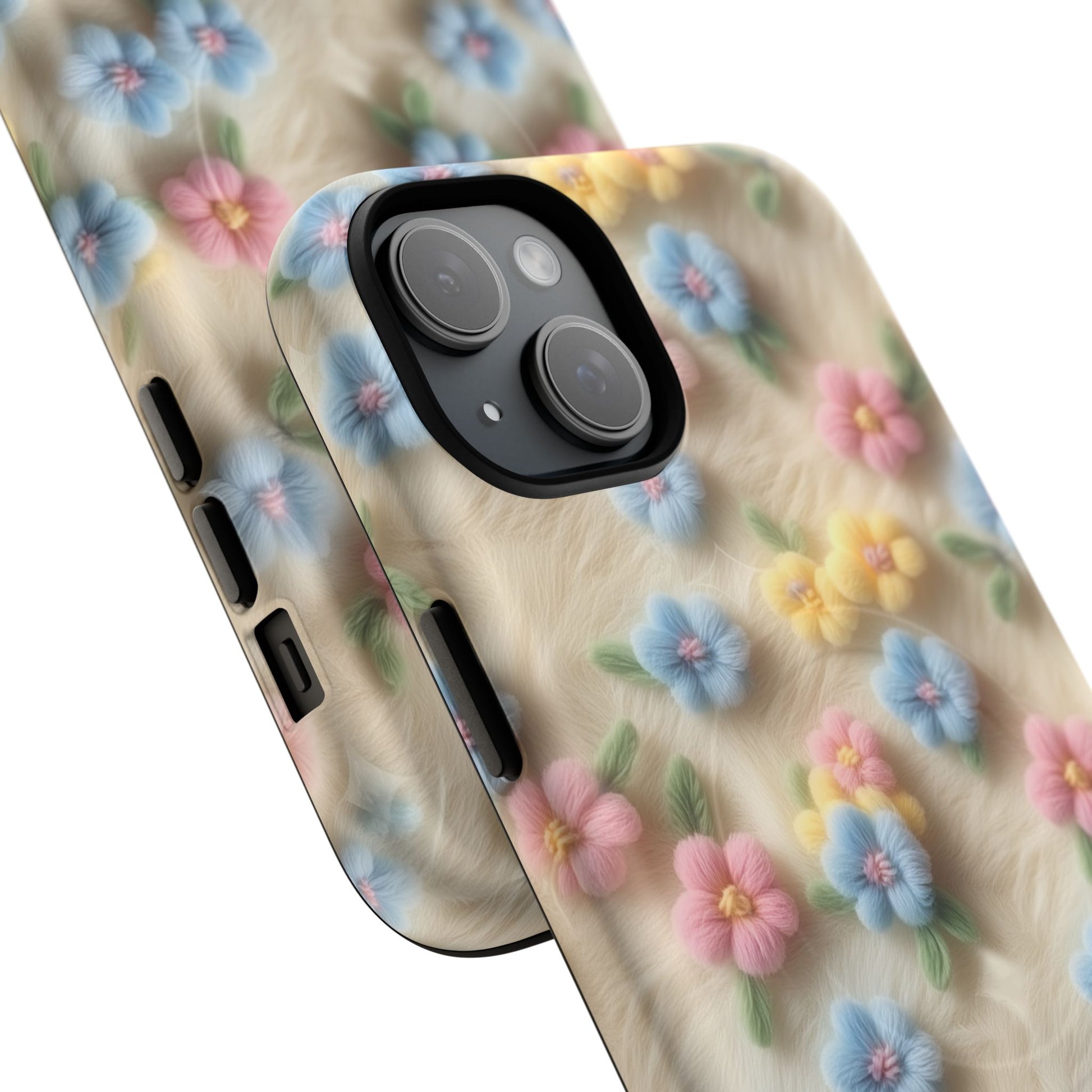 A slim, protective phone case featuring a soft embroidered floral pattern that blends delicate detail with a cozy, elegant aesthetic. Tiny blossoms in shades of pink, red, yellow, white, and light blue appear scattered across a creamy background, each flower connected by slender green stems that give the design a light, garden-inspired feel. The embroidered look adds subtle texture and charm while maintaining a clean, modern finish. Available in glossy or matte, the pattern remains crisp and vibrant while feeling smooth in hand. Built with a dual-layer shell and a shock-absorbing TPU liner, it helps protect your phone from everyday drops while staying slim and comfortable to hold. MagSafe® compatibility ensures your daily routine stays effortless—chargers, wallets, and grips attach instantly without removing the case. It’s a gentle blend of floral beauty and dependable protection.
