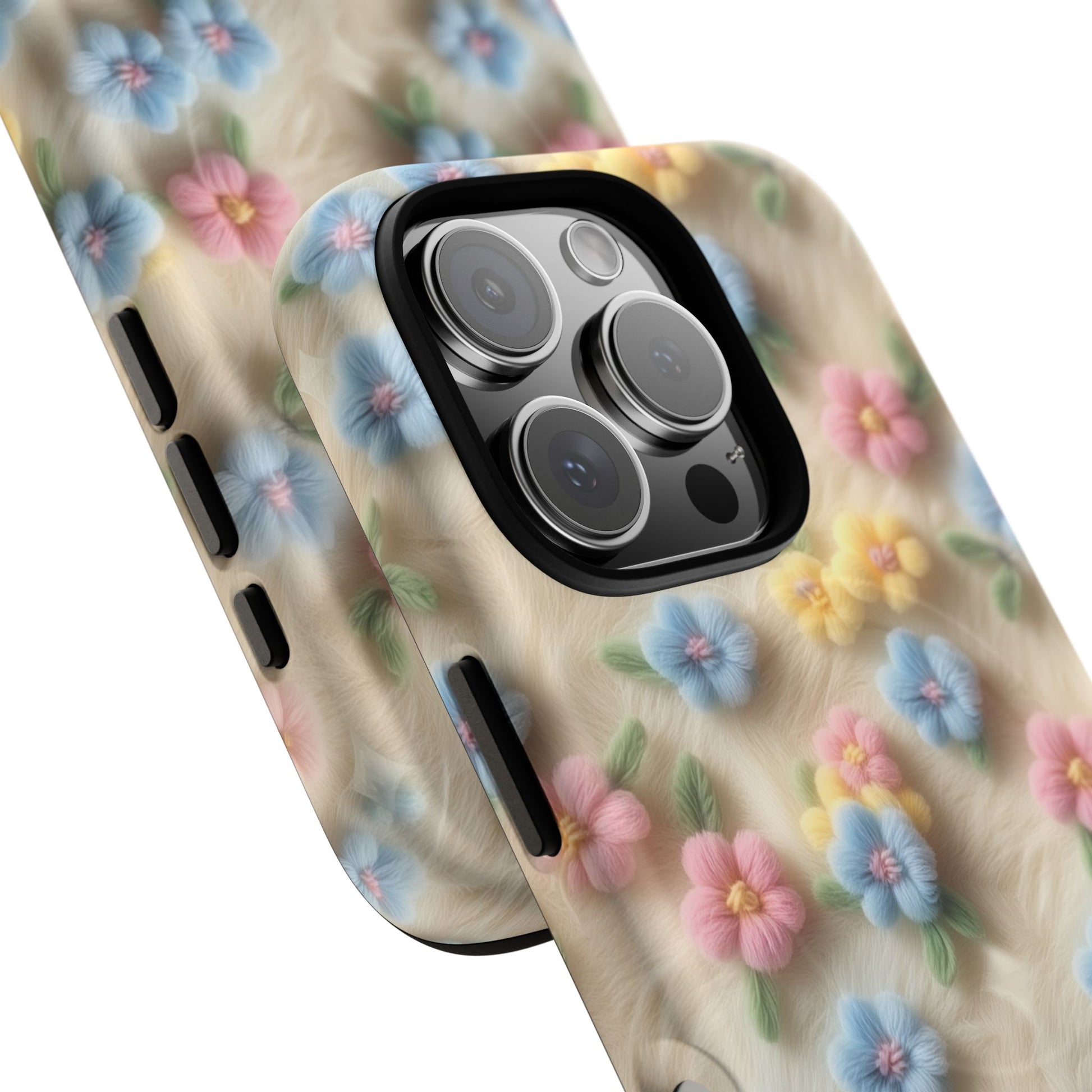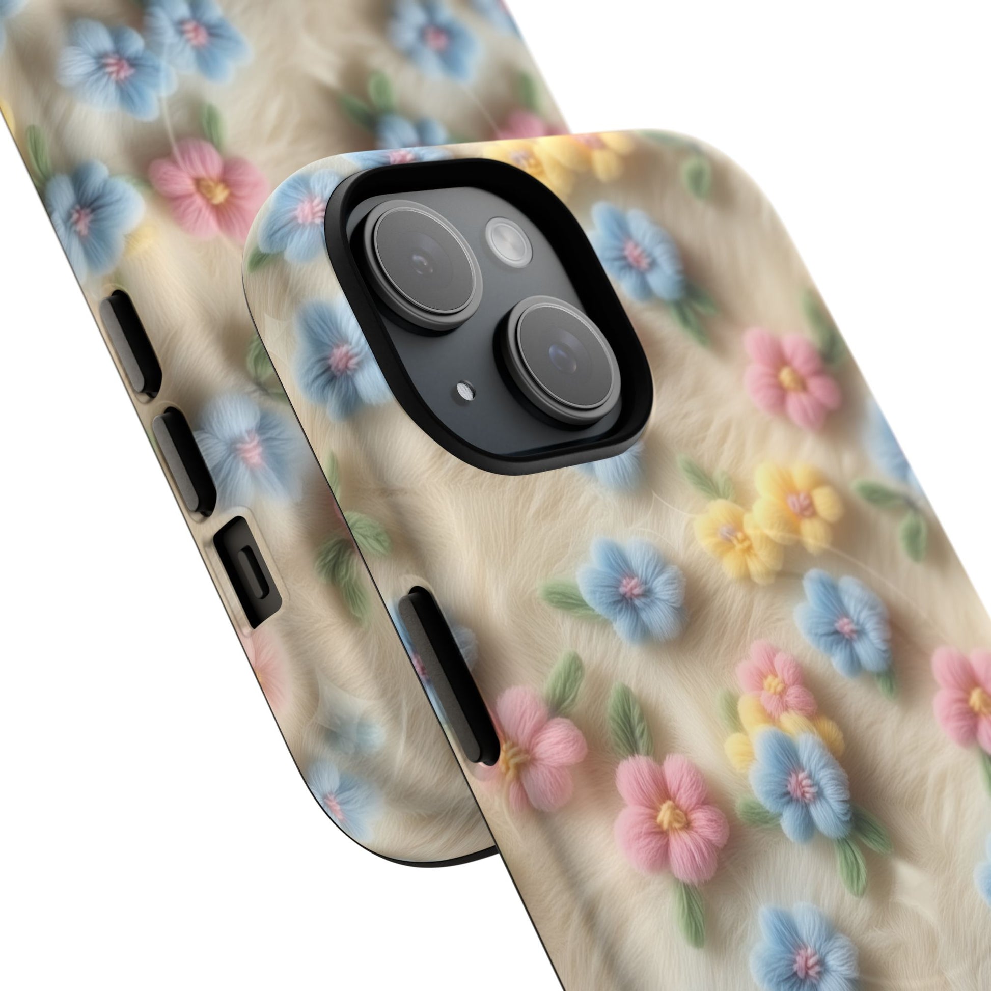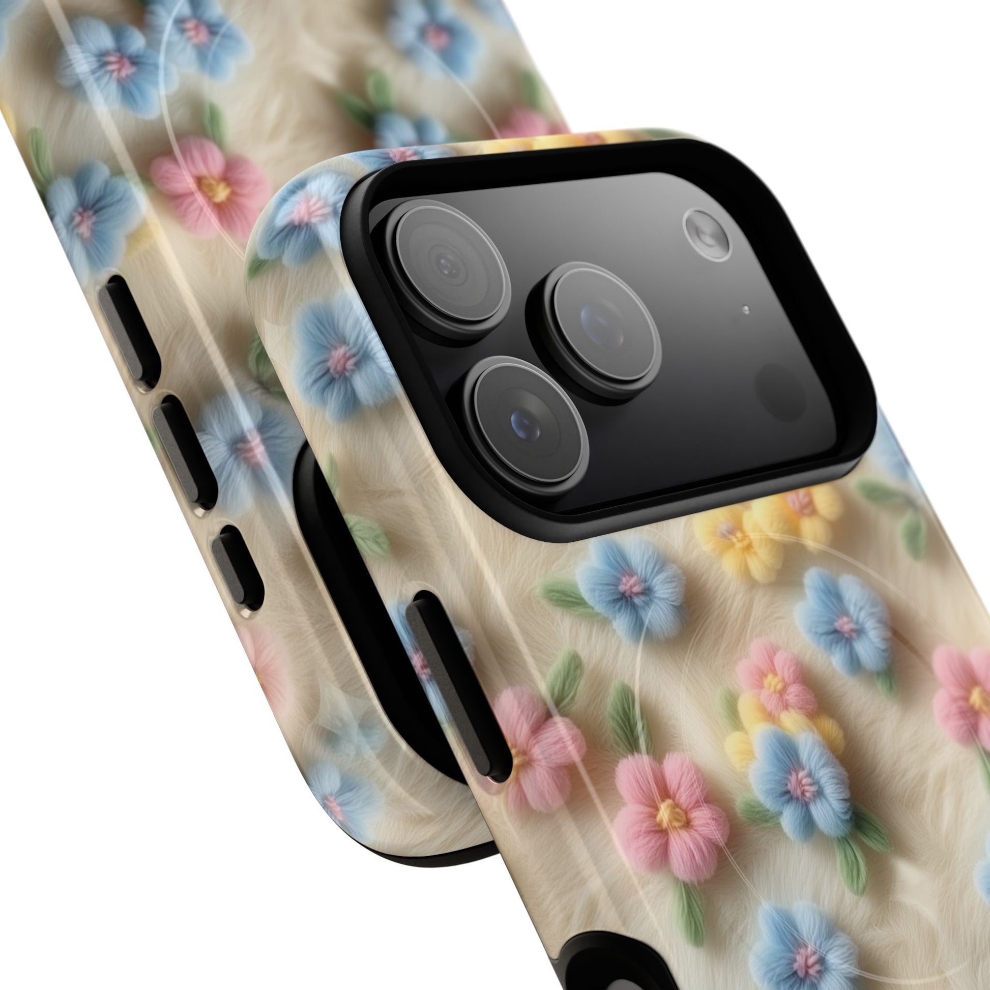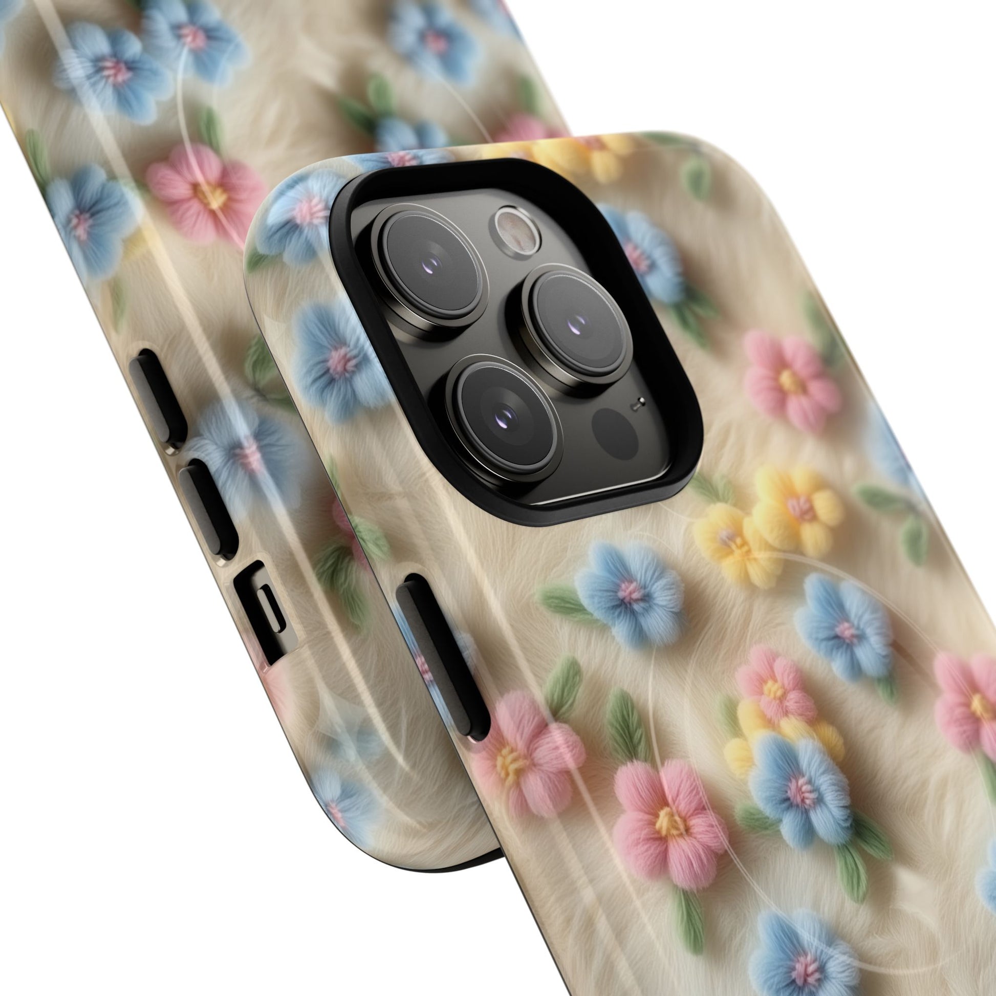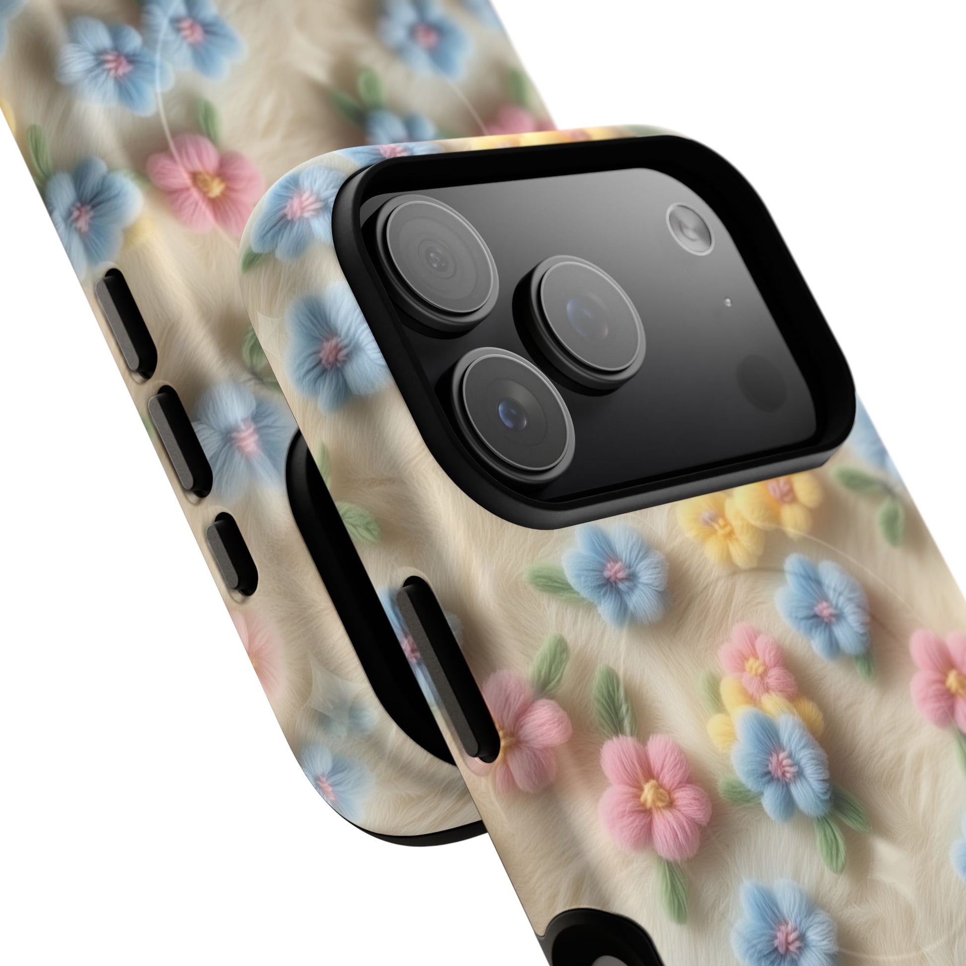 A slim, protective phone case featuring a soft embroidered floral pattern that blends delicate detail with a cozy, elegant aesthetic. Tiny blossoms in shades of pink, red, yellow, white, and light blue appear scattered across a creamy background, each flower connected by slender green stems that give the design a light, garden-inspired feel. The embroidered look adds subtle texture and charm while maintaining a clean, modern finish. Available in glossy or matte, the pattern remains crisp and vibrant while feeling smooth in hand. Built with a dual-layer shell and a shock-absorbing TPU liner, it helps protect your phone from everyday drops while staying slim and comfortable to hold. MagSafe® compatibility ensures your daily routine stays effortless—chargers, wallets, and grips attach instantly without removing the case. It’s a gentle blend of floral beauty and dependable protection.