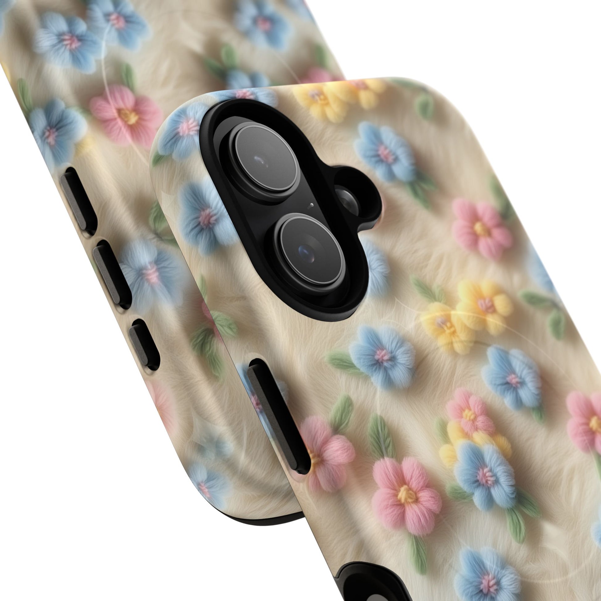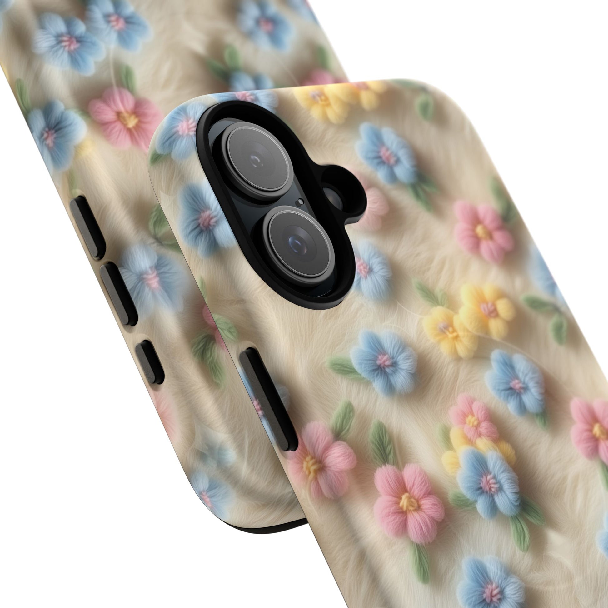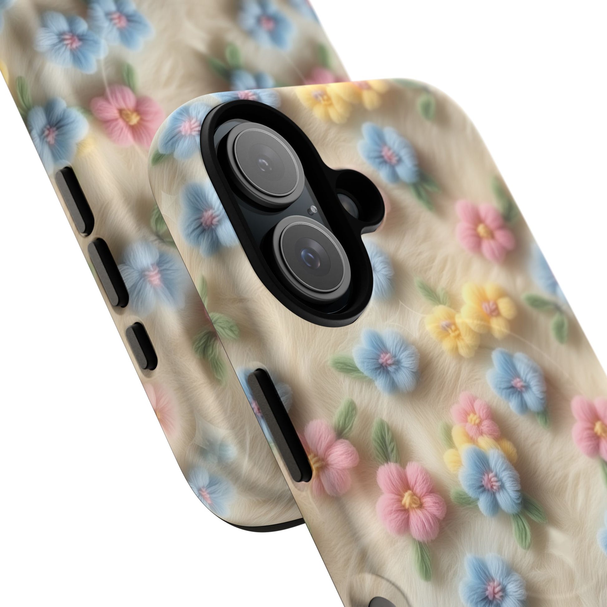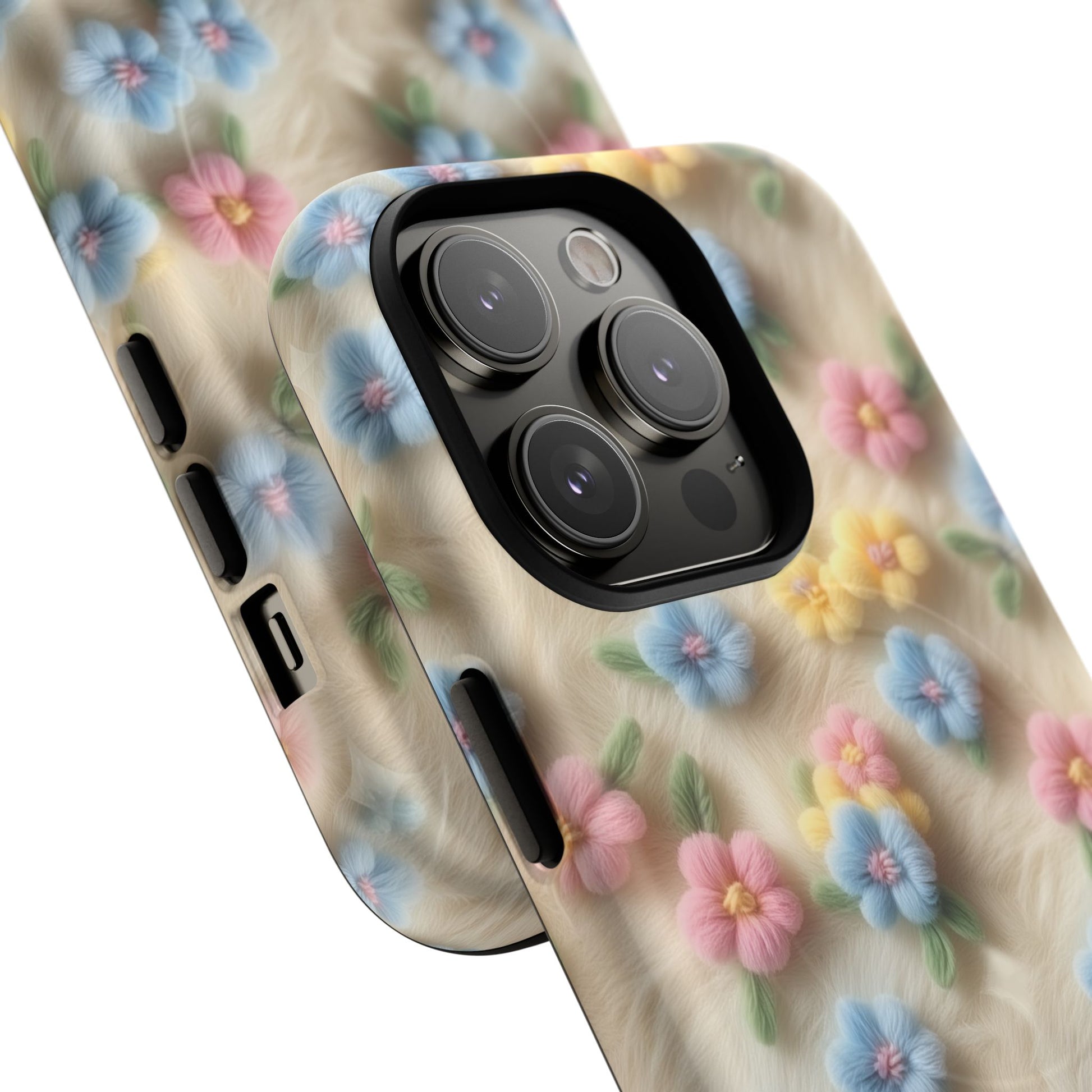 A slim, protective phone case featuring a soft embroidered floral pattern that blends delicate detail with a cozy, elegant aesthetic. Tiny blossoms in shades of pink, red, yellow, white, and light blue appear scattered across a creamy background, each flower connected by slender green stems that give the design a light, garden-inspired feel. The embroidered look adds subtle texture and charm while maintaining a clean, modern finish. Available in glossy or matte, the pattern remains crisp and vibrant while feeling smooth in hand. Built with a dual-layer shell and a shock-absorbing TPU liner, it helps protect your phone from everyday drops while staying slim and comfortable to hold. MagSafe® compatibility ensures your daily routine stays effortless—chargers, wallets, and grips attach instantly without removing the case. It’s a gentle blend of floral beauty and dependable protection.