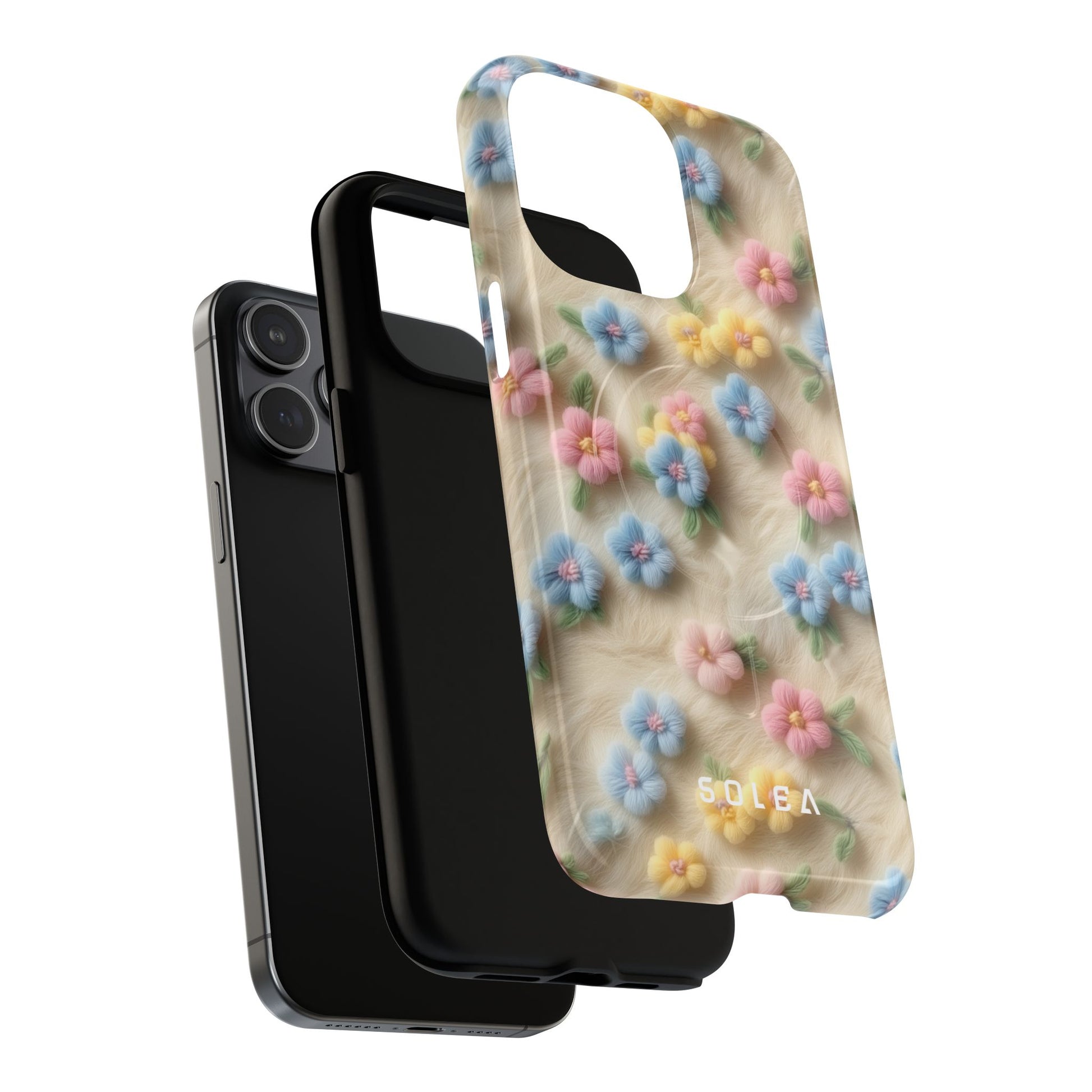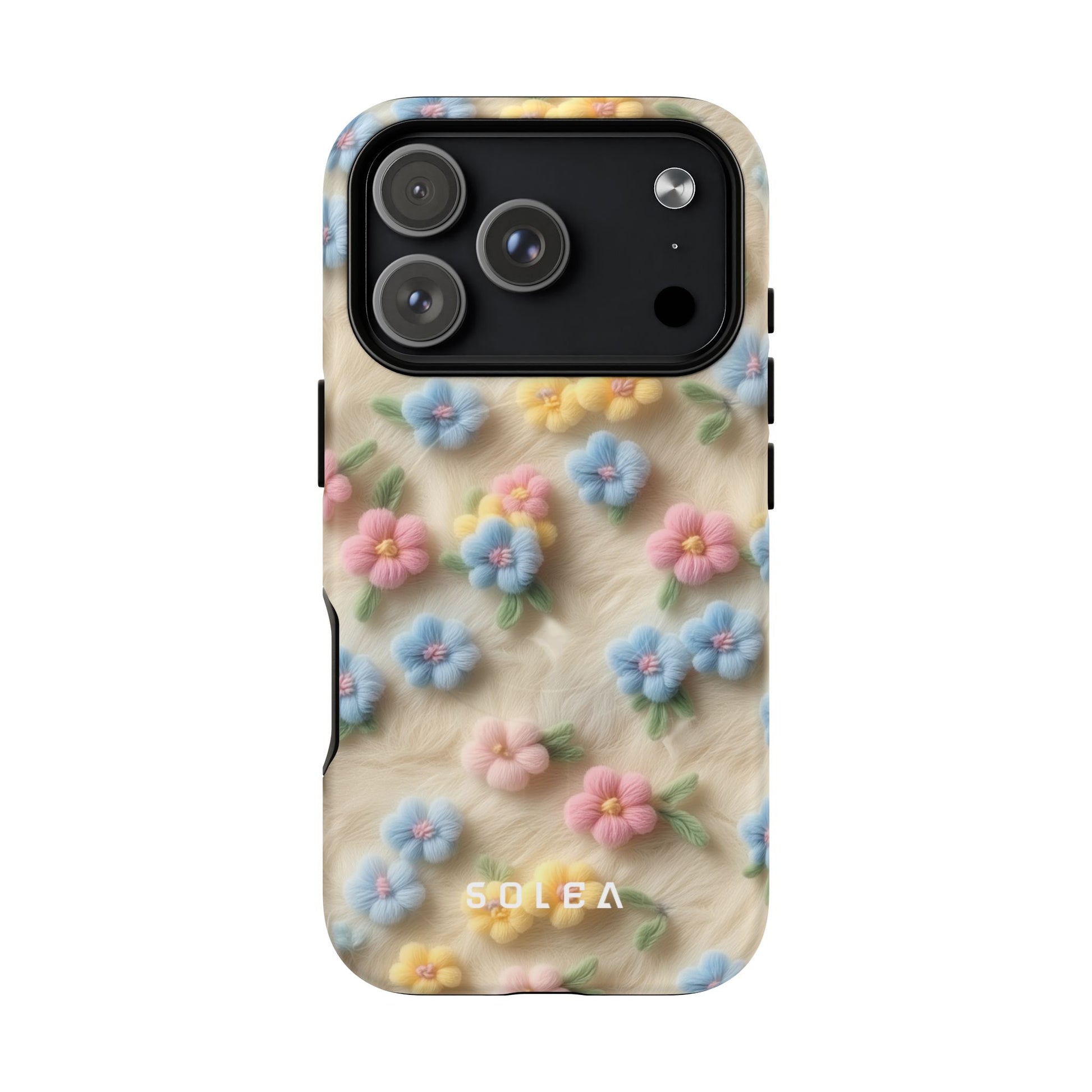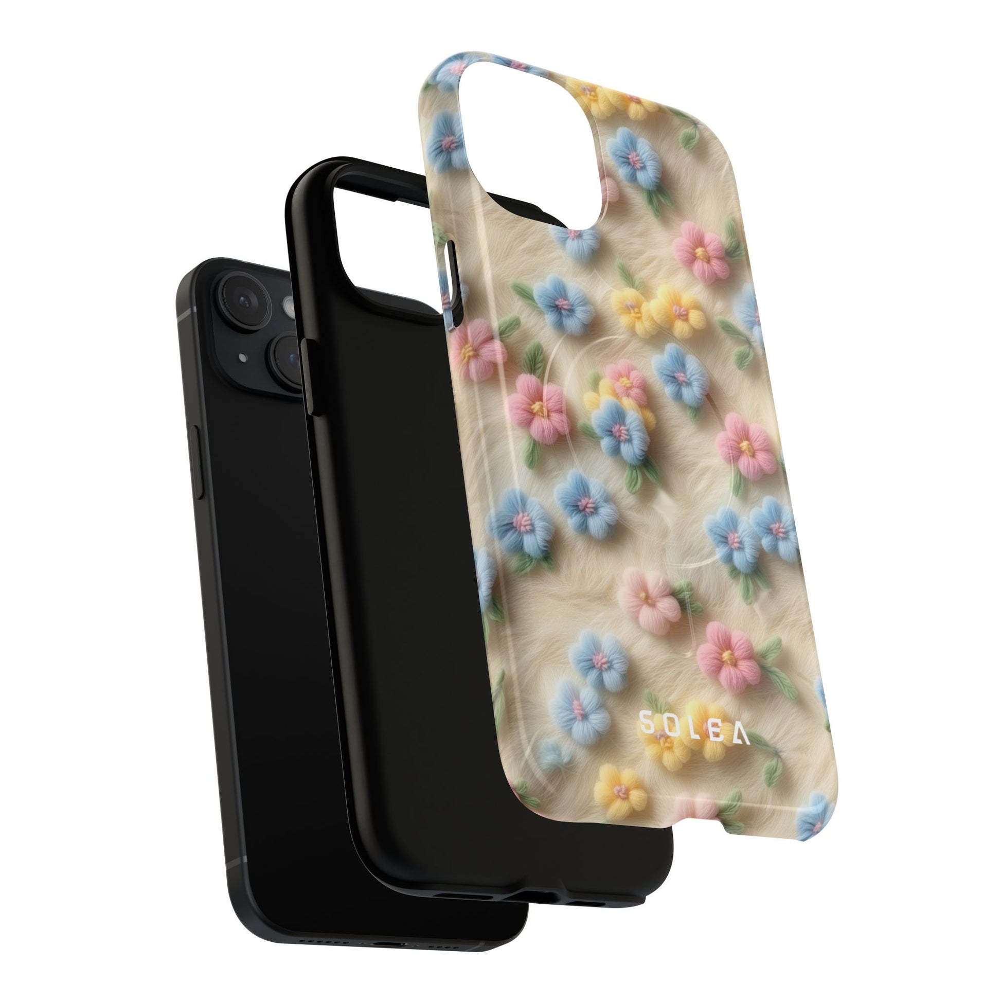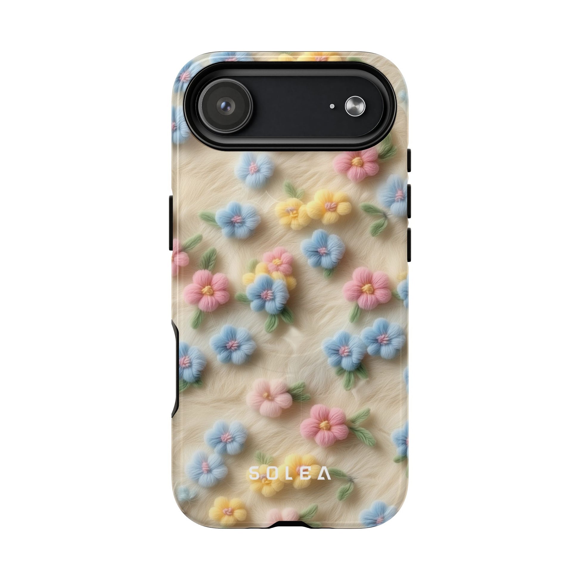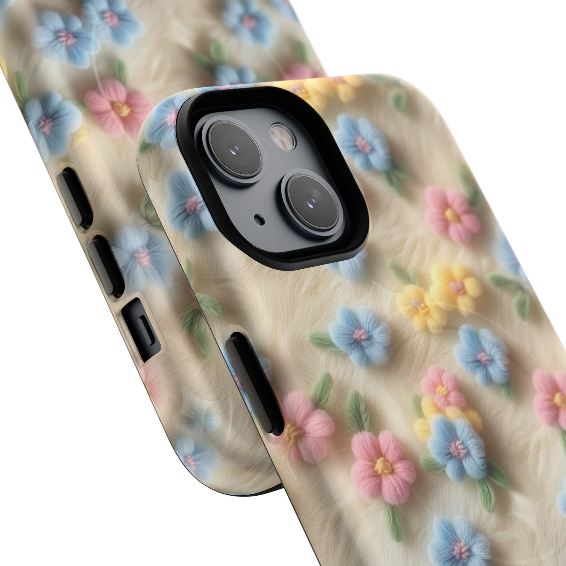 A slim, protective phone case featuring a soft embroidered floral pattern that blends delicate detail with a cozy, elegant aesthetic. Tiny blossoms in shades of pink, red, yellow, white, and light blue appear scattered across a creamy background, each flower connected by slender green stems that give the design a light, garden-inspired feel. The embroidered look adds subtle texture and charm while maintaining a clean, modern finish. Available in glossy or matte, the pattern remains crisp and vibrant while feeling smooth in hand. Built with a dual-layer shell and a shock-absorbing TPU liner, it helps protect your phone from everyday drops while staying slim and comfortable to hold. MagSafe® compatibility ensures your daily routine stays effortless—chargers, wallets, and grips attach instantly without removing the case. It’s a gentle blend of floral beauty and dependable protection.