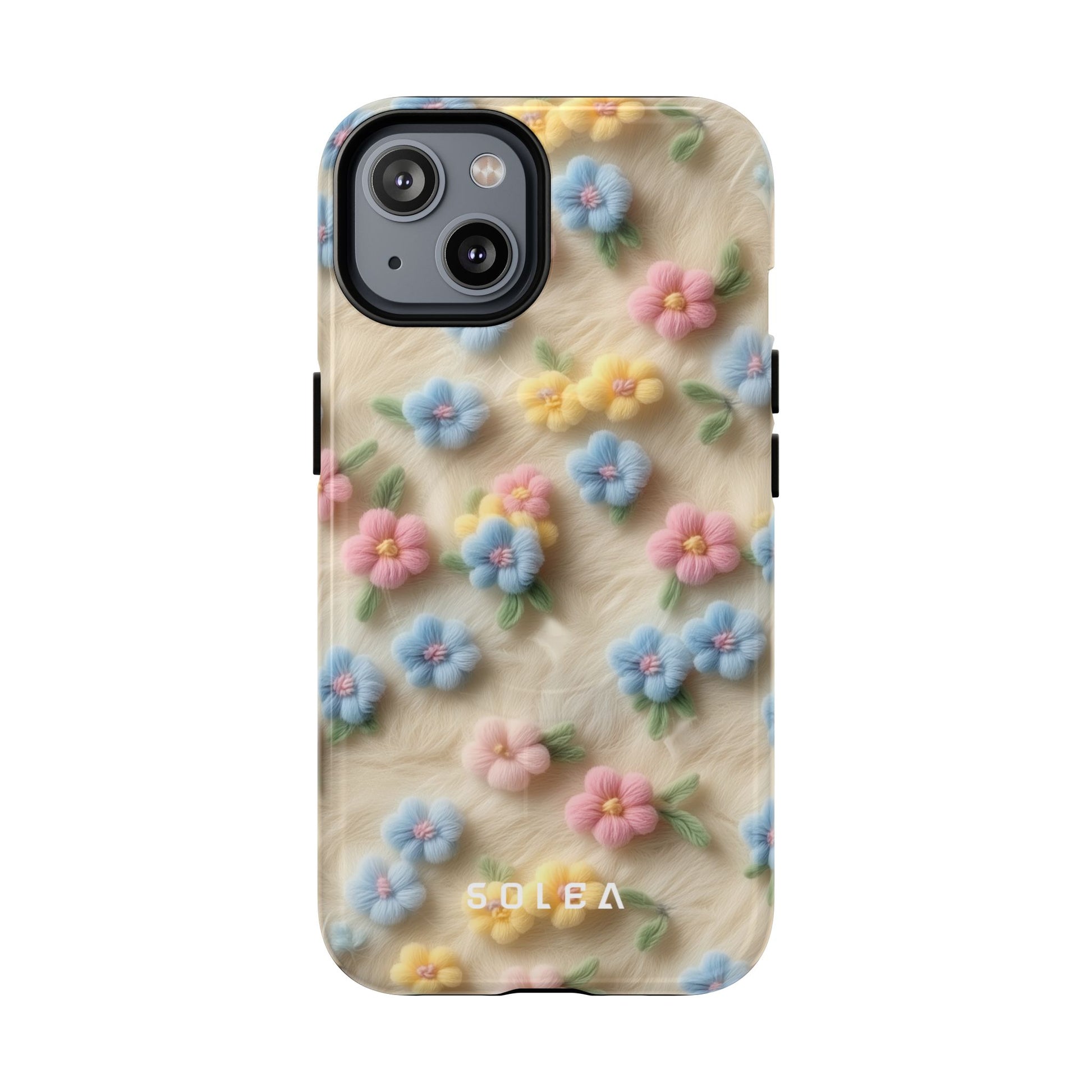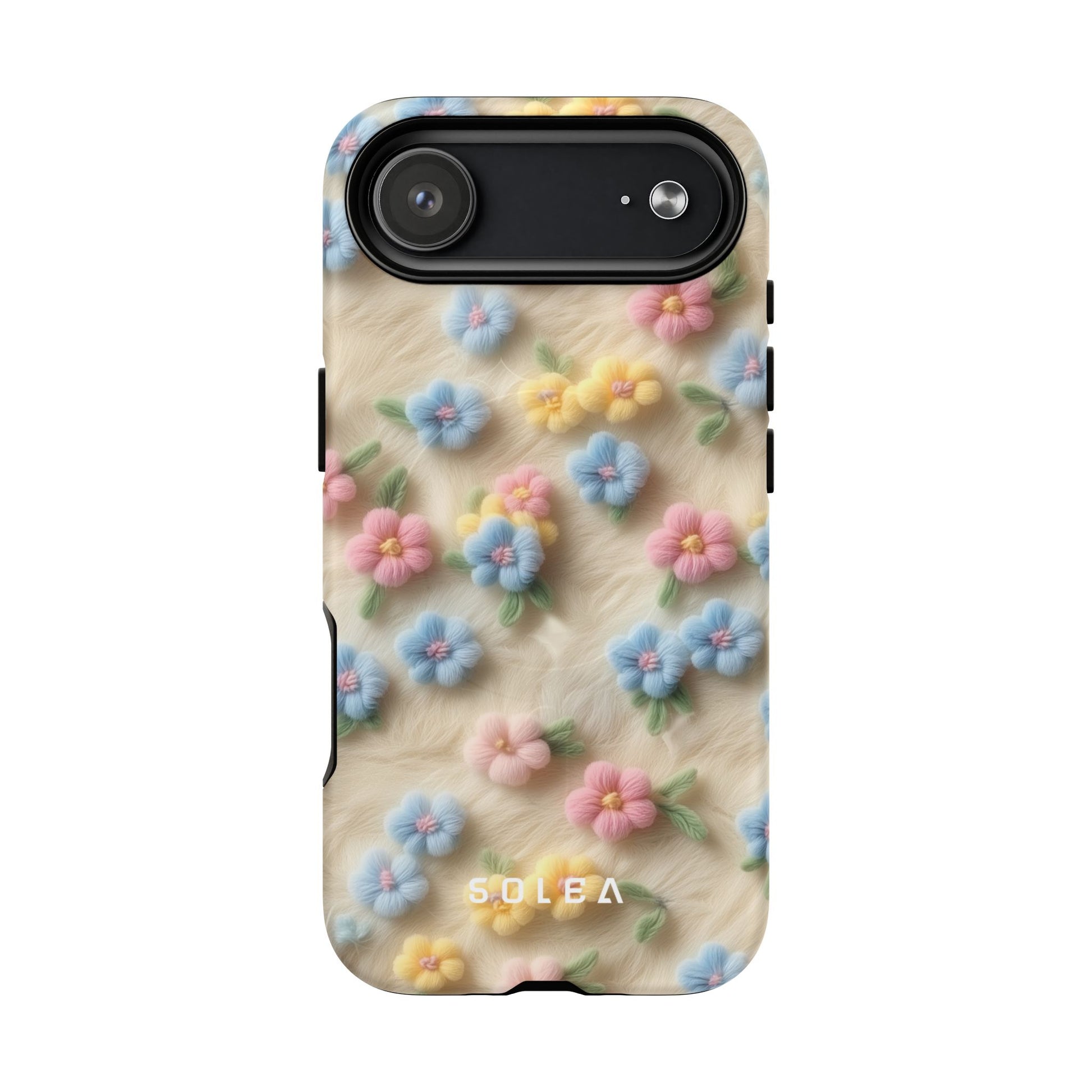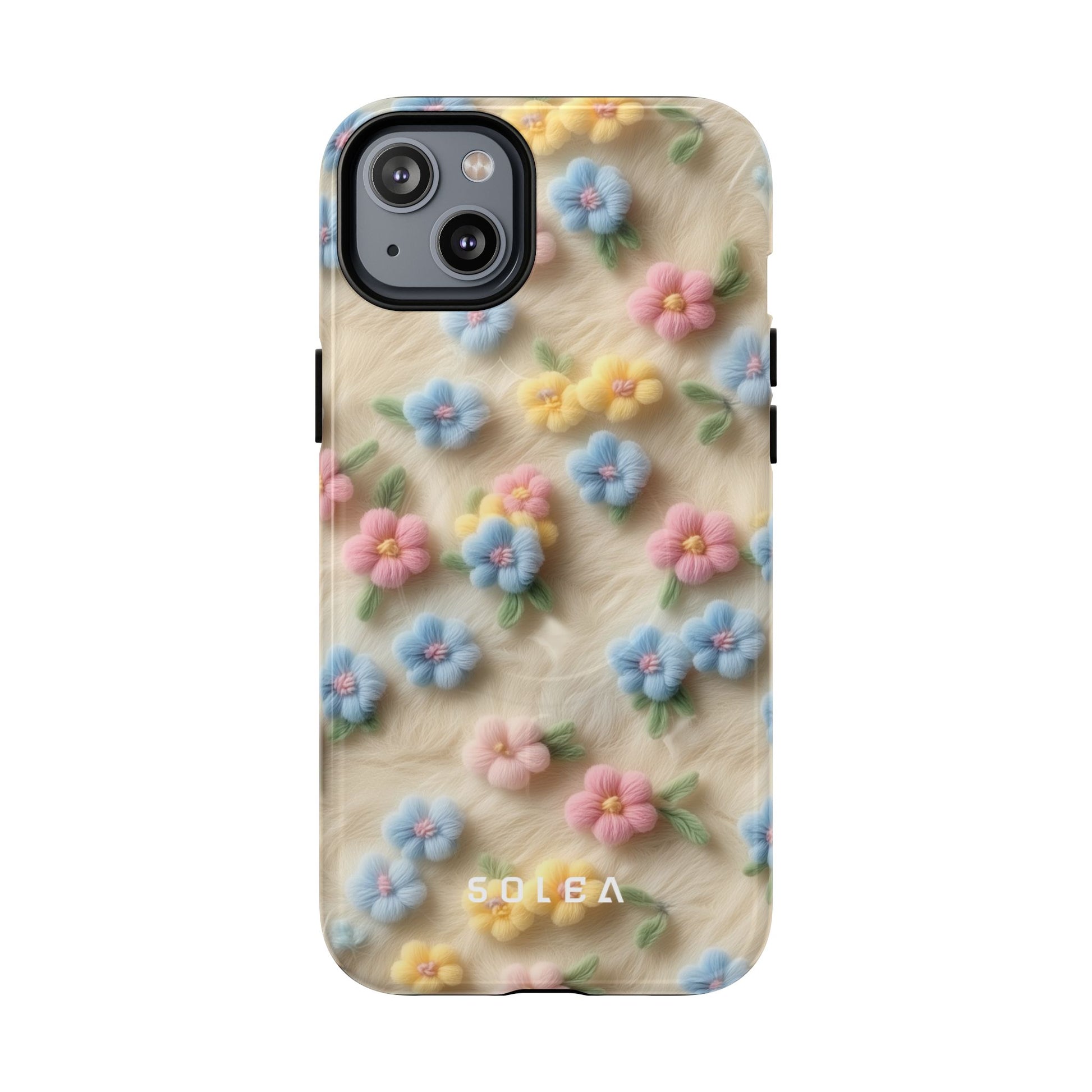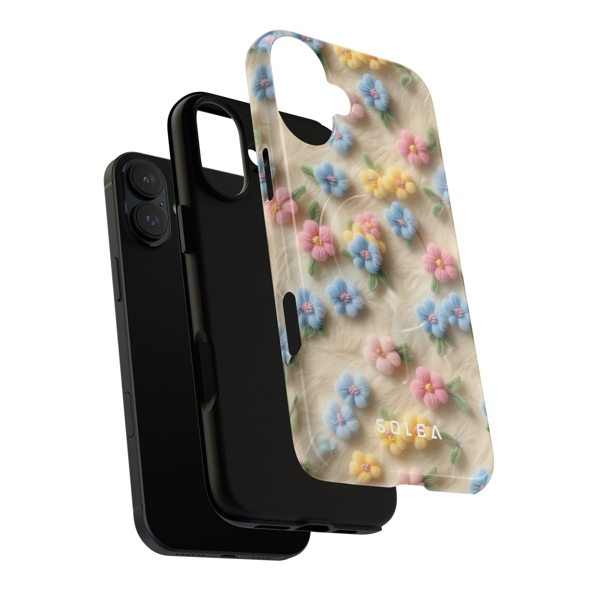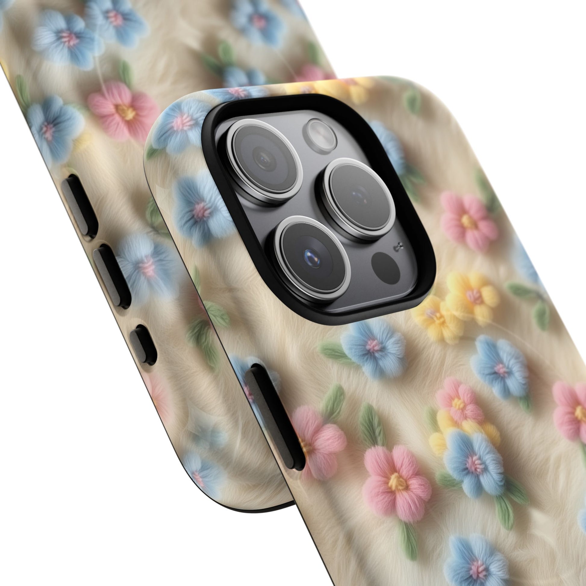 A slim, protective phone case featuring a soft embroidered floral pattern that blends delicate detail with a cozy, elegant aesthetic. Tiny blossoms in shades of pink, red, yellow, white, and light blue appear scattered across a creamy background, each flower connected by slender green stems that give the design a light, garden-inspired feel. The embroidered look adds subtle texture and charm while maintaining a clean, modern finish. Available in glossy or matte, the pattern remains crisp and vibrant while feeling smooth in hand. Built with a dual-layer shell and a shock-absorbing TPU liner, it helps protect your phone from everyday drops while staying slim and comfortable to hold. MagSafe® compatibility ensures your daily routine stays effortless—chargers, wallets, and grips attach instantly without removing the case. It’s a gentle blend of floral beauty and dependable protection.