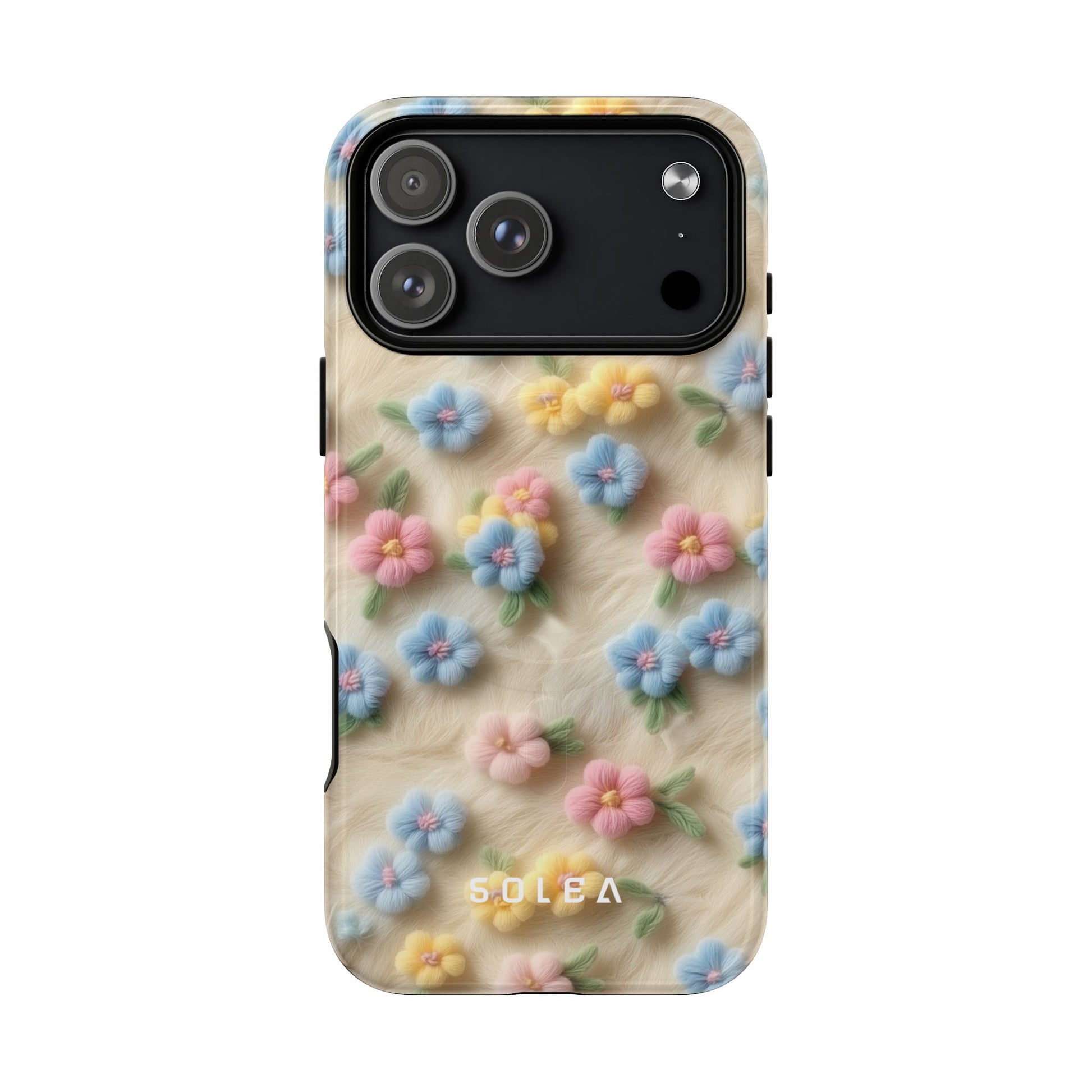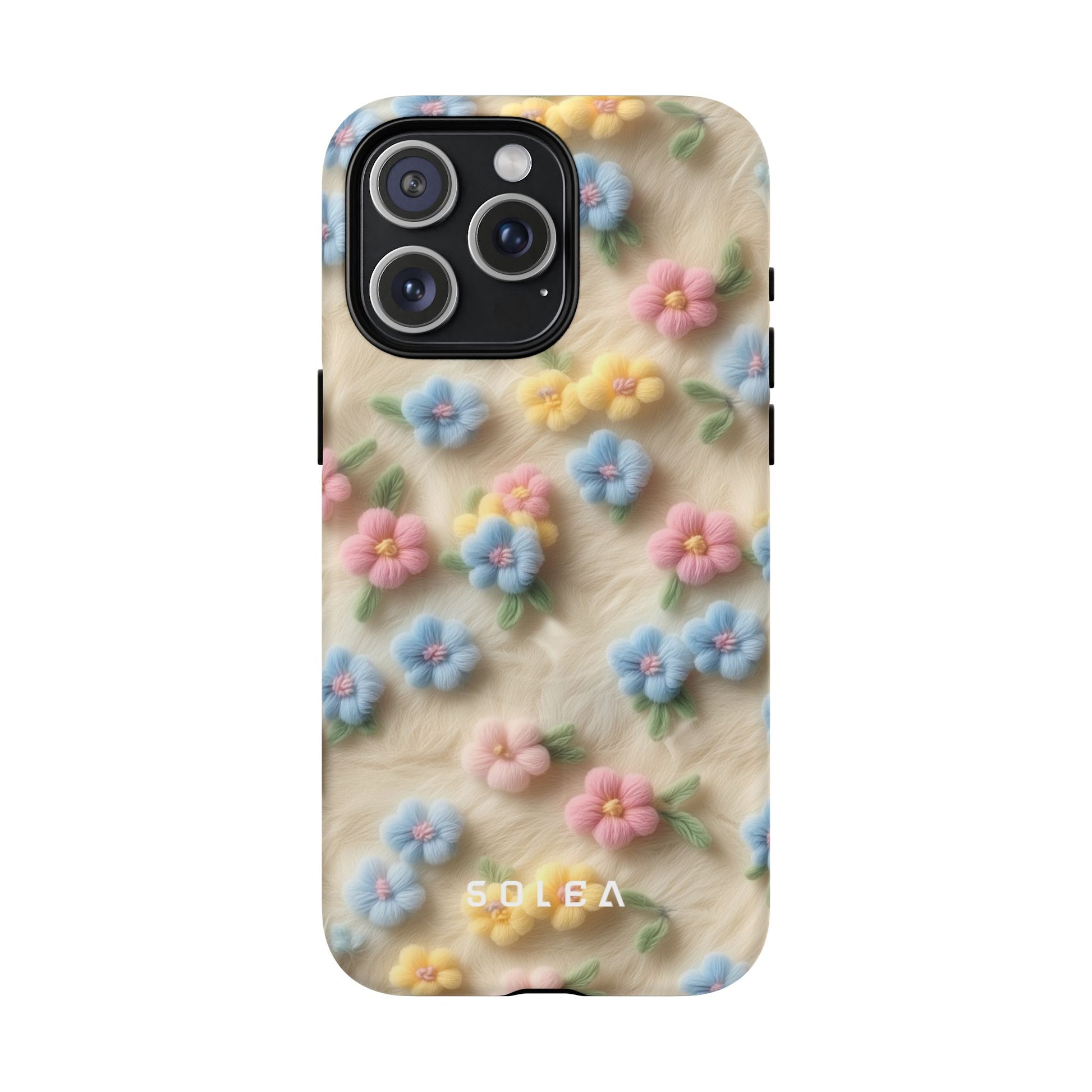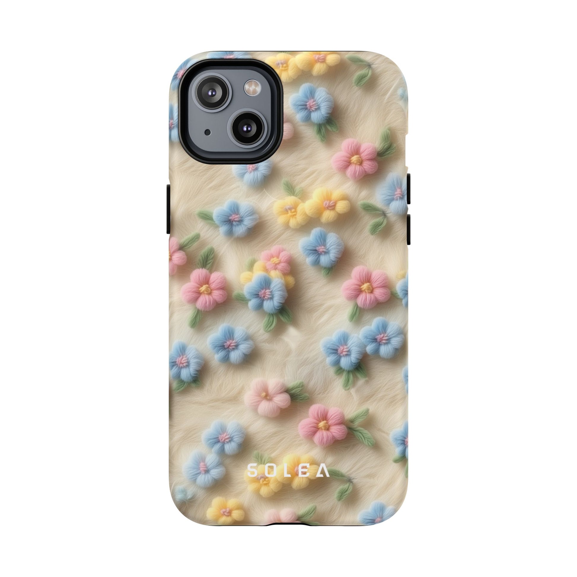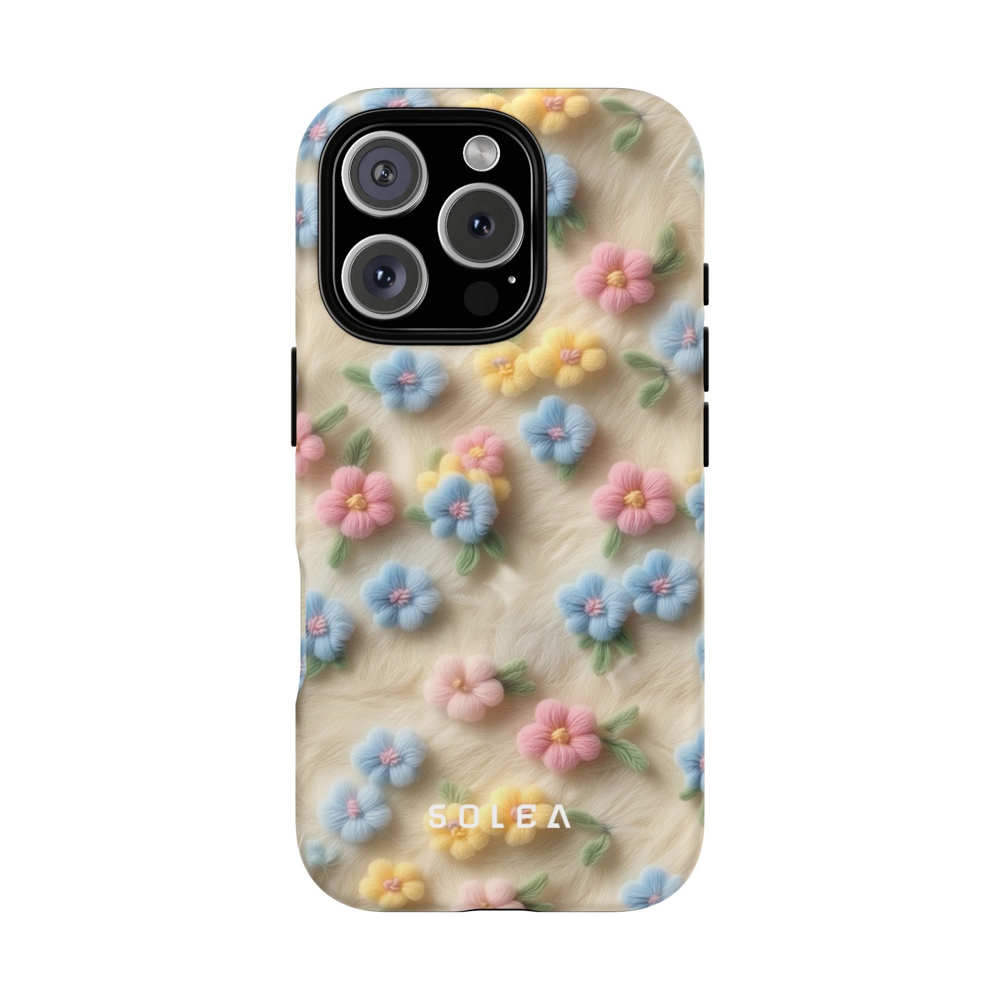 A slim, protective phone case featuring a soft embroidered floral pattern that blends delicate detail with a cozy, elegant aesthetic. Tiny blossoms in shades of pink, red, yellow, white, and light blue appear scattered across a creamy background, each flower connected by slender green stems that give the design a light, garden-inspired feel. The embroidered look adds subtle texture and charm while maintaining a clean, modern finish. Available in glossy or matte, the pattern remains crisp and vibrant while feeling smooth in hand. Built with a dual-layer shell and a shock-absorbing TPU liner, it helps protect your phone from everyday drops while staying slim and comfortable to hold. MagSafe® compatibility ensures your daily routine stays effortless—chargers, wallets, and grips attach instantly without removing the case. It’s a gentle blend of floral beauty and dependable protection.