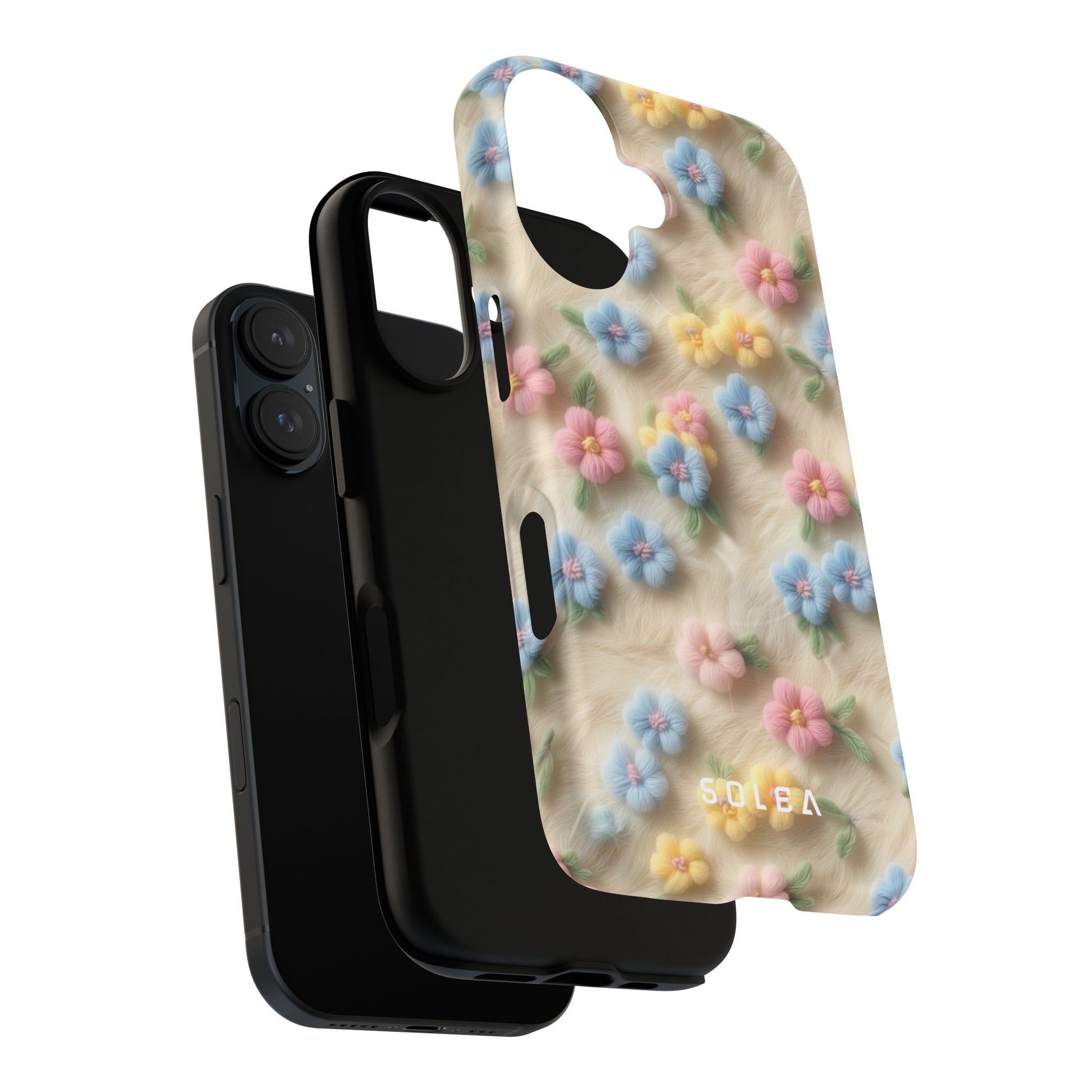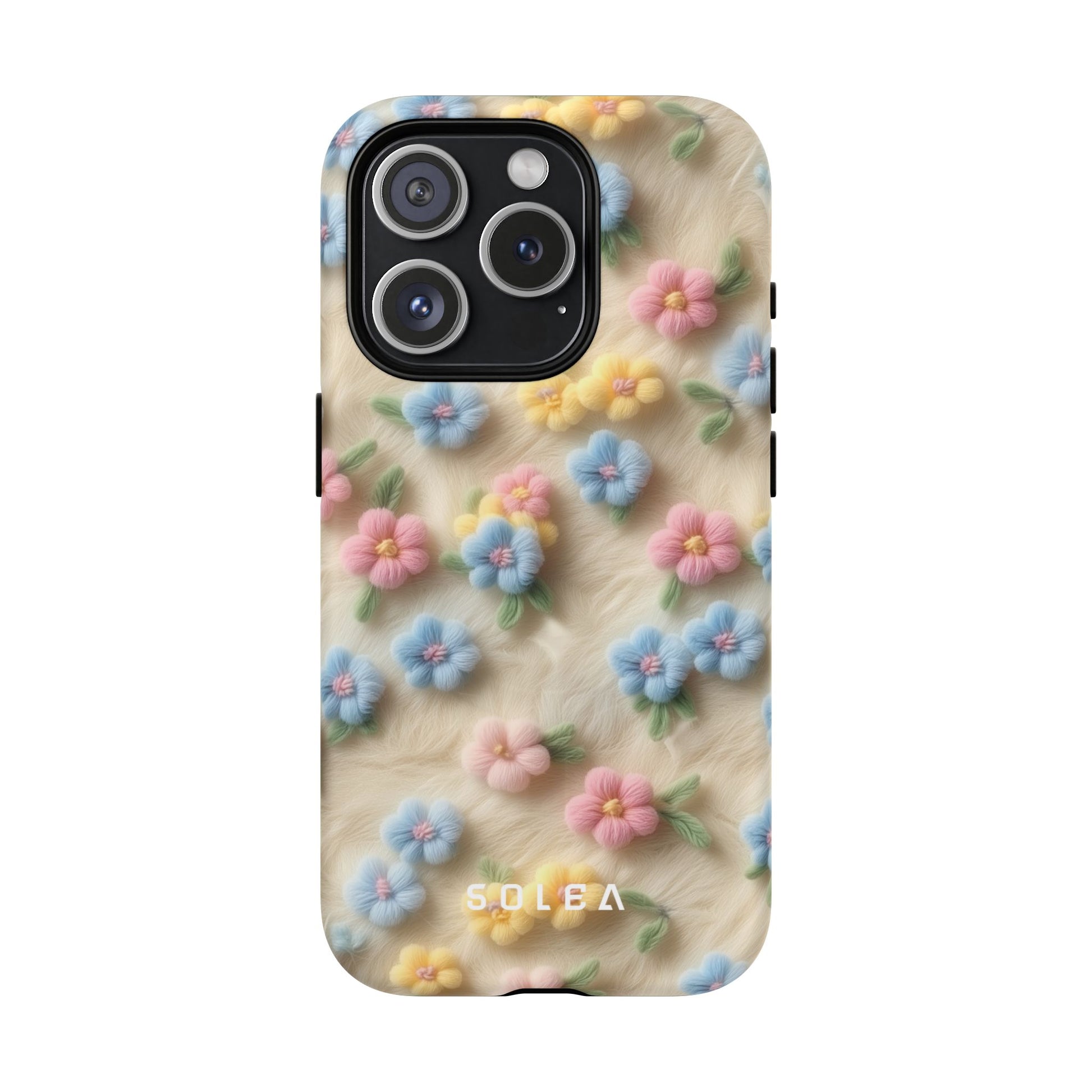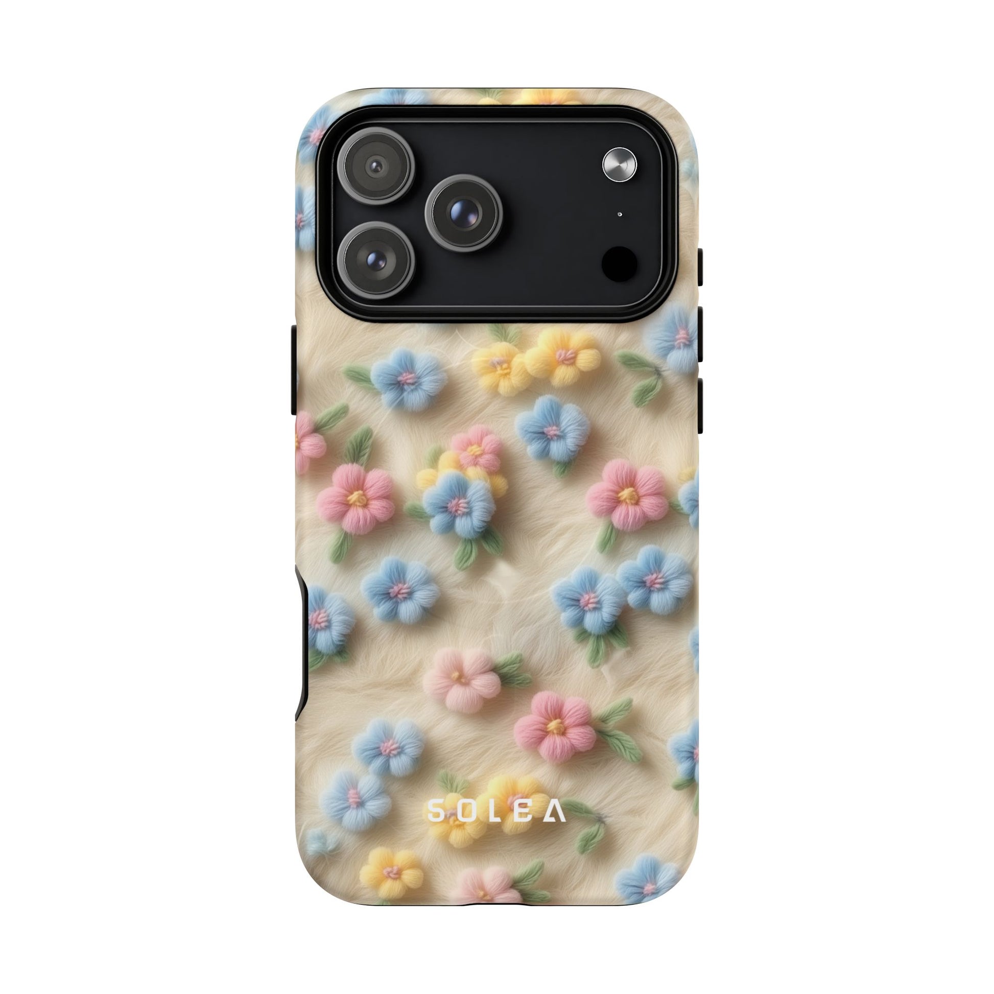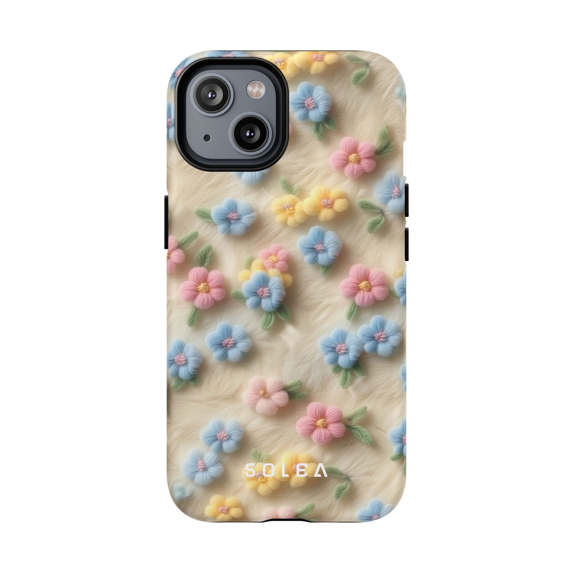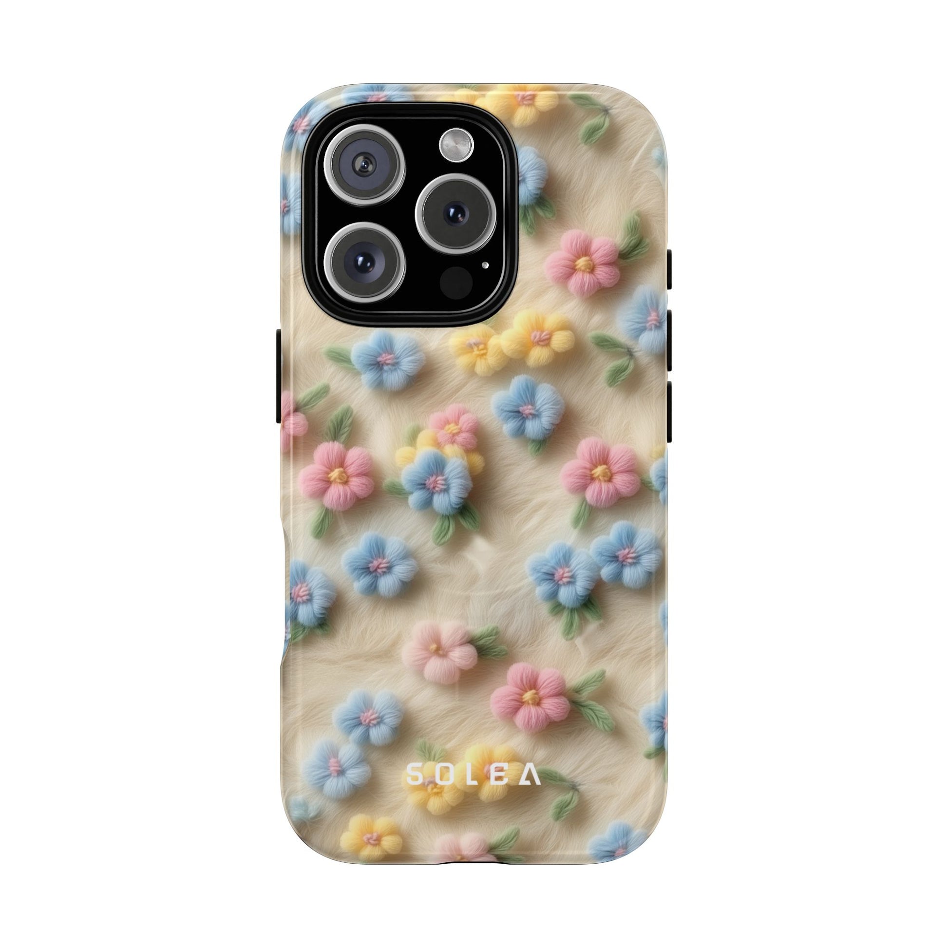 A slim, protective phone case featuring a soft embroidered floral pattern that blends delicate detail with a cozy, elegant aesthetic. Tiny blossoms in shades of pink, red, yellow, white, and light blue appear scattered across a creamy background, each flower connected by slender green stems that give the design a light, garden-inspired feel. The embroidered look adds subtle texture and charm while maintaining a clean, modern finish. Available in glossy or matte, the pattern remains crisp and vibrant while feeling smooth in hand. Built with a dual-layer shell and a shock-absorbing TPU liner, it helps protect your phone from everyday drops while staying slim and comfortable to hold. MagSafe® compatibility ensures your daily routine stays effortless—chargers, wallets, and grips attach instantly without removing the case. It’s a gentle blend of floral beauty and dependable protection.