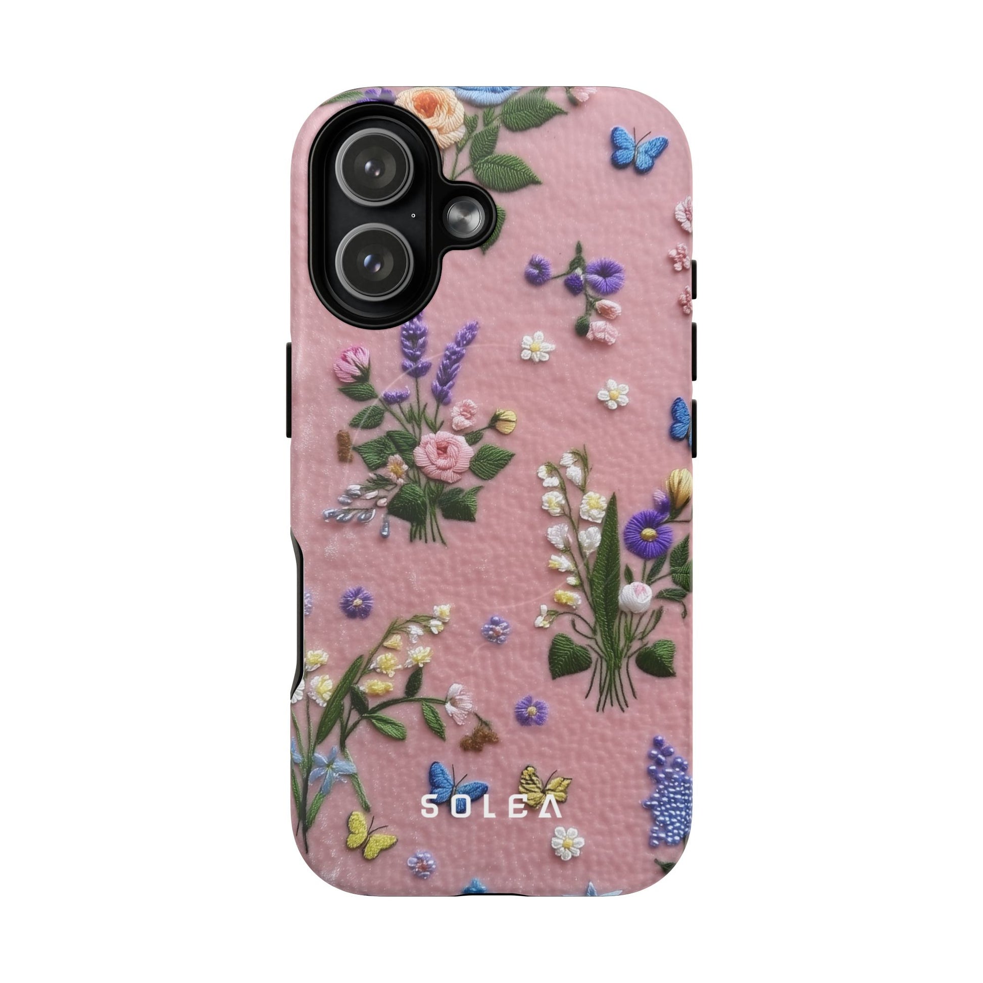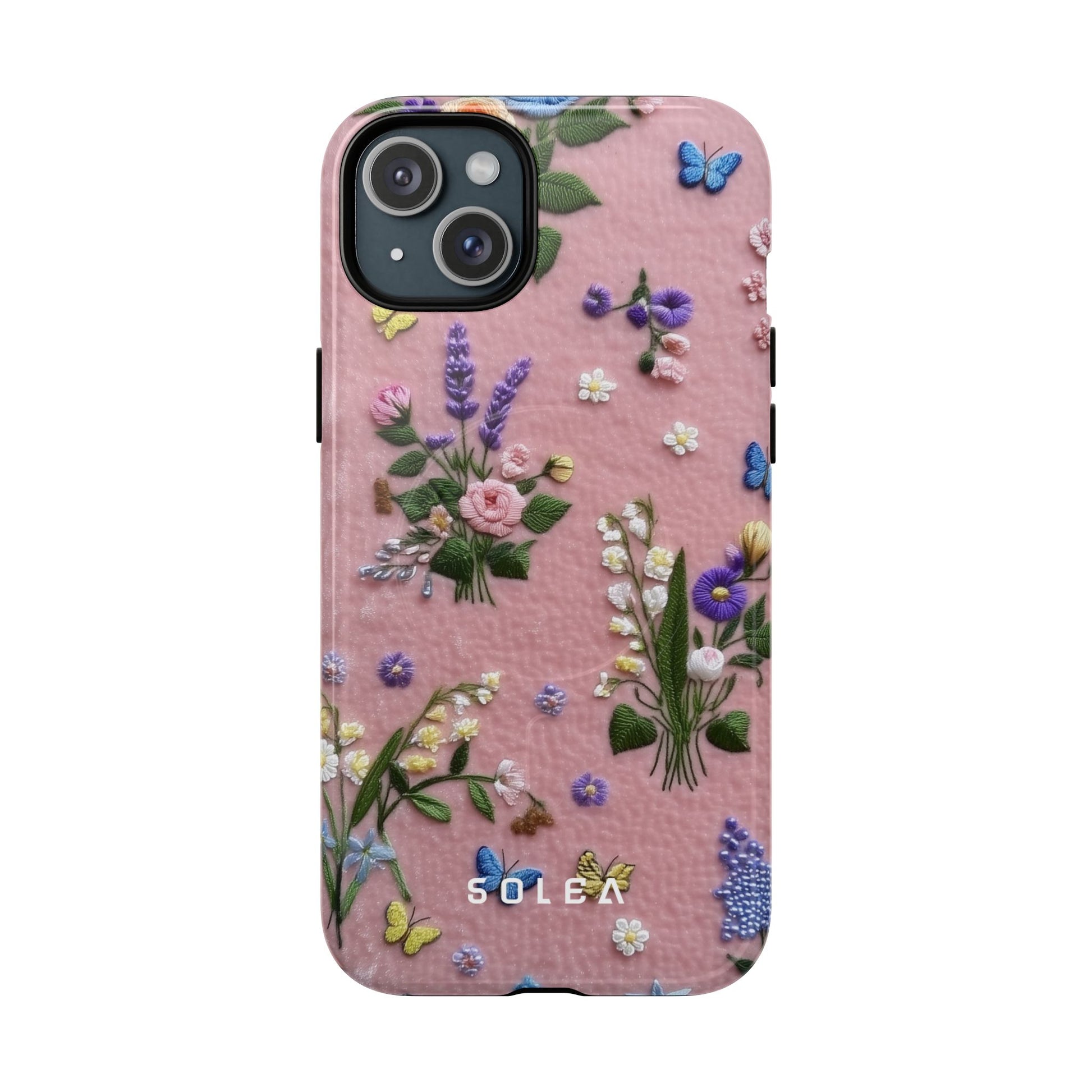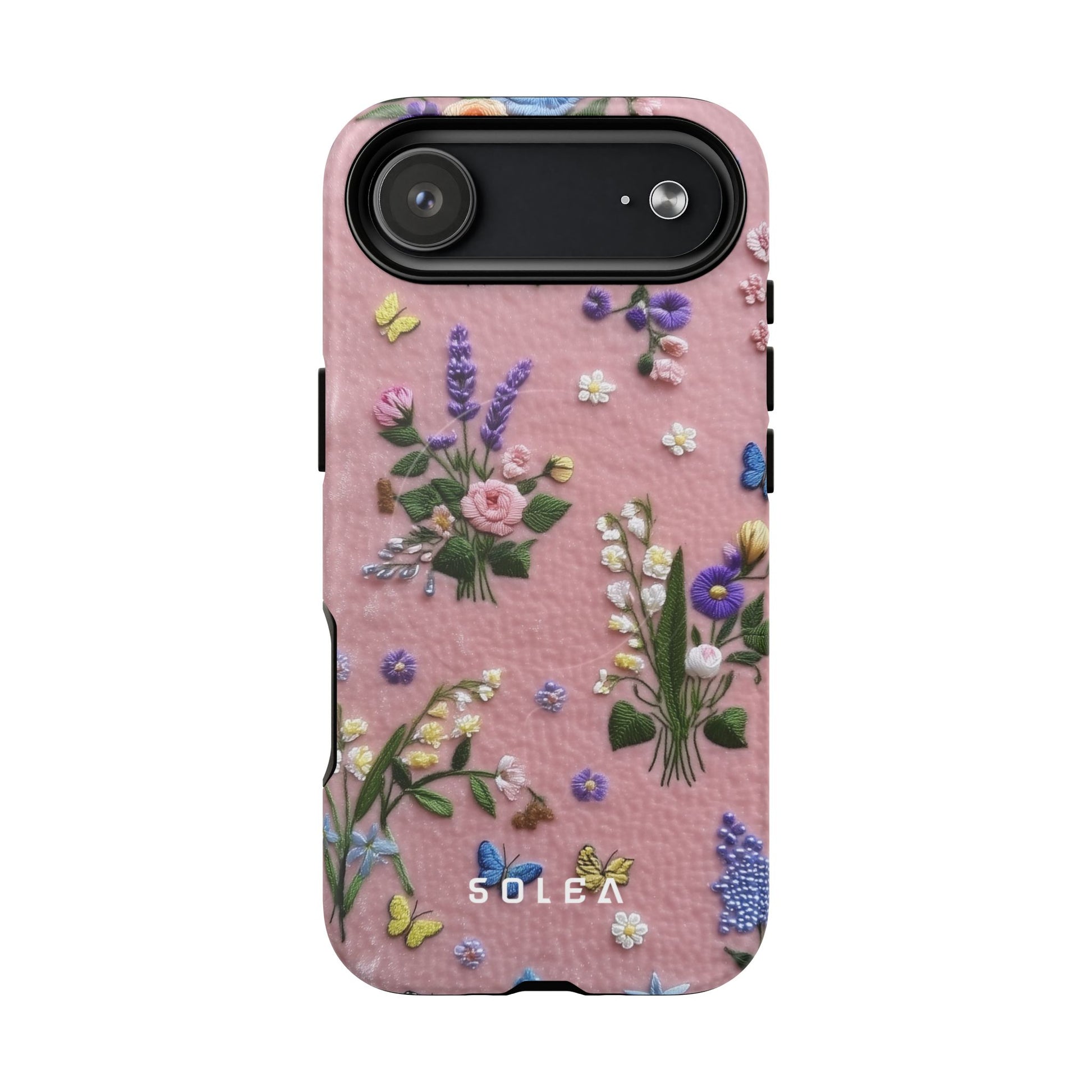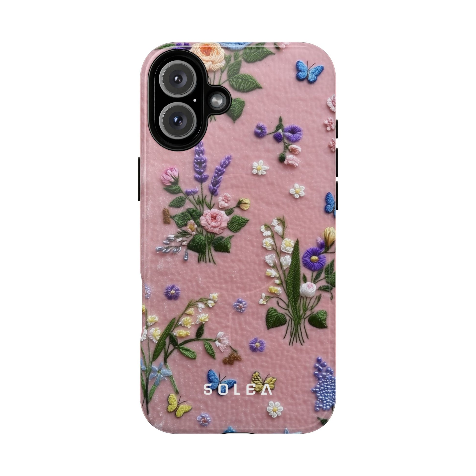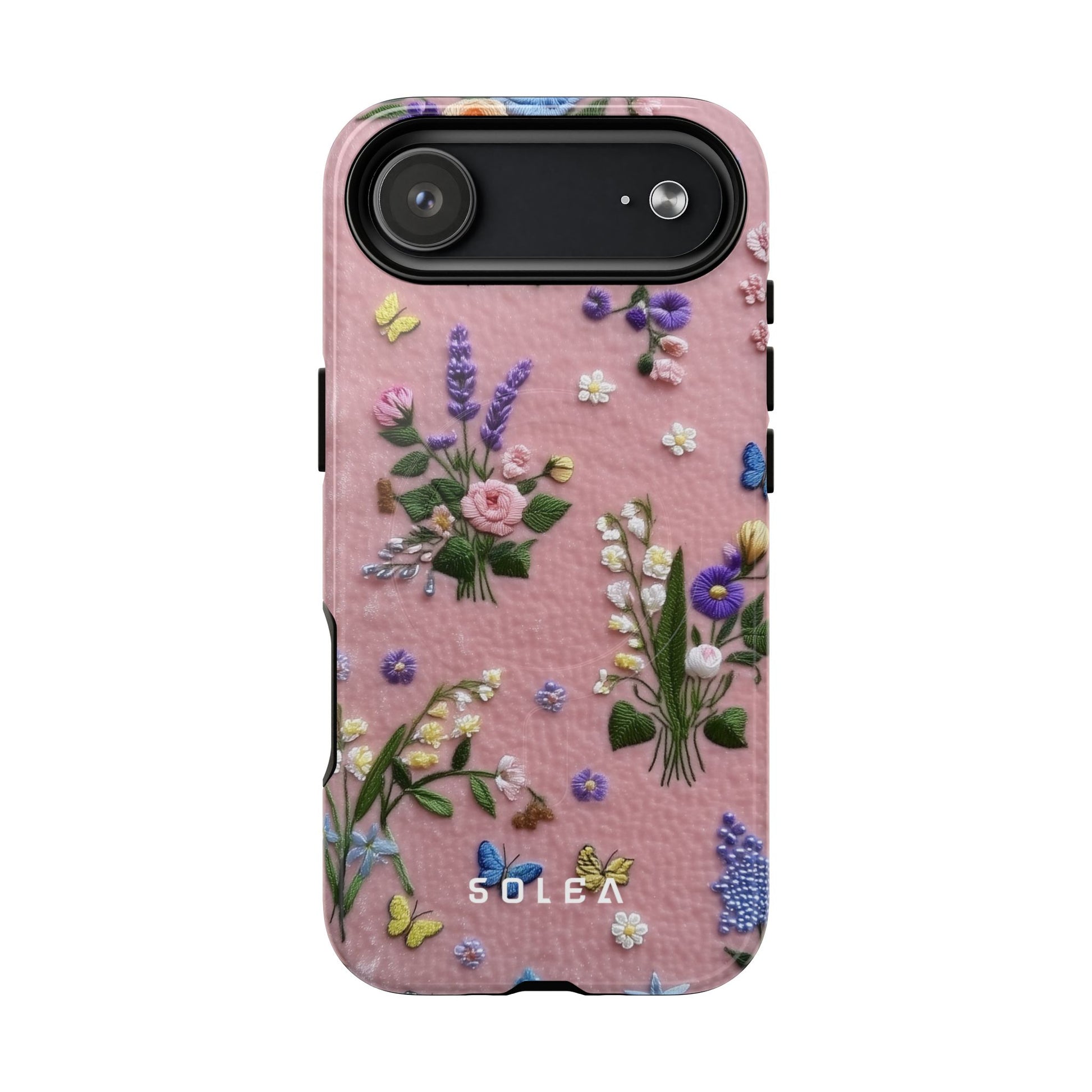 A slim, protective phone case featuring a soft embroidered floral pattern that blends delicate detail with a cozy, elegant aesthetic. Tiny blossoms in shades of pink, red, yellow, white, and light blue appear scattered across a creamy background, each flower connected by slender green stems that give the design a light, garden-inspired feel. The embroidered look adds subtle texture and charm while maintaining a clean, modern finish. Available in glossy or matte, the pattern remains crisp and vibrant while feeling smooth in hand. Built with a dual-layer shell and a shock-absorbing TPU liner, it helps protect your phone from everyday drops while staying slim and comfortable to hold. MagSafe® compatibility ensures your daily routine stays effortless—chargers, wallets, and grips attach instantly without removing the case. It’s a gentle blend of floral beauty and dependable protection.