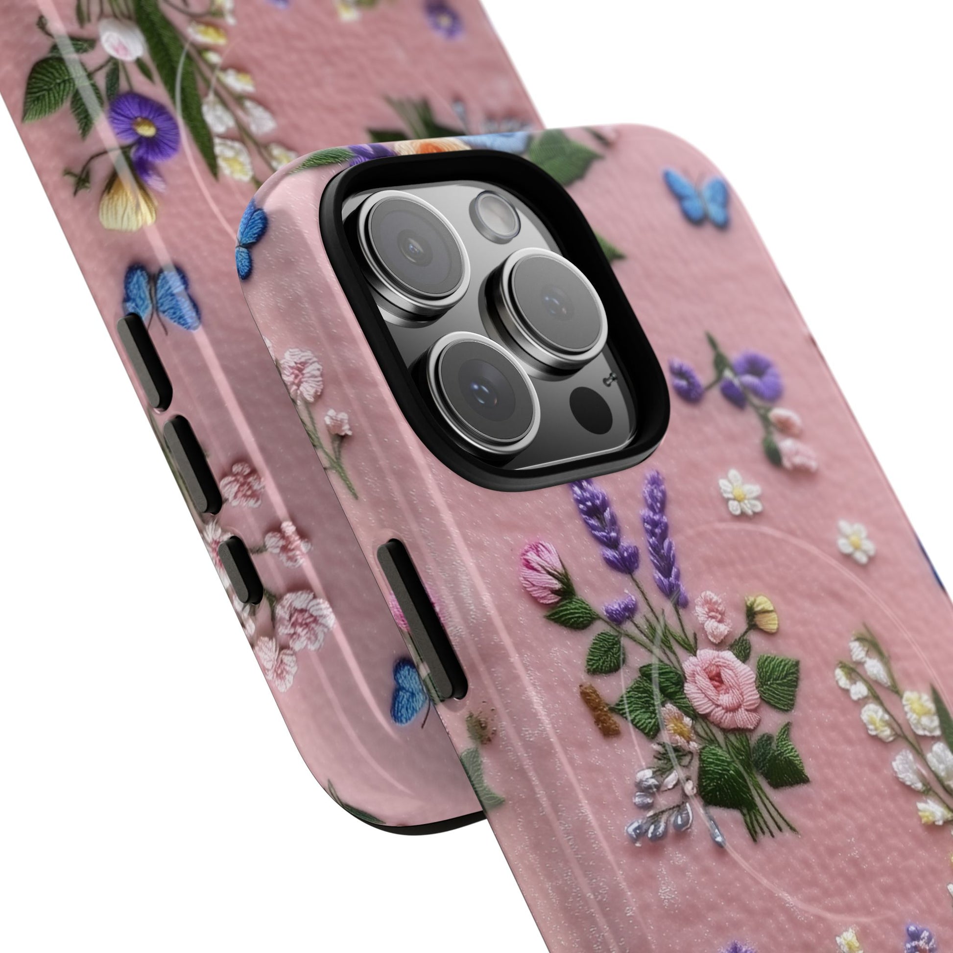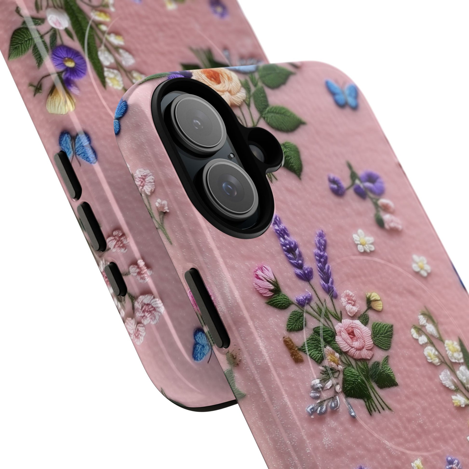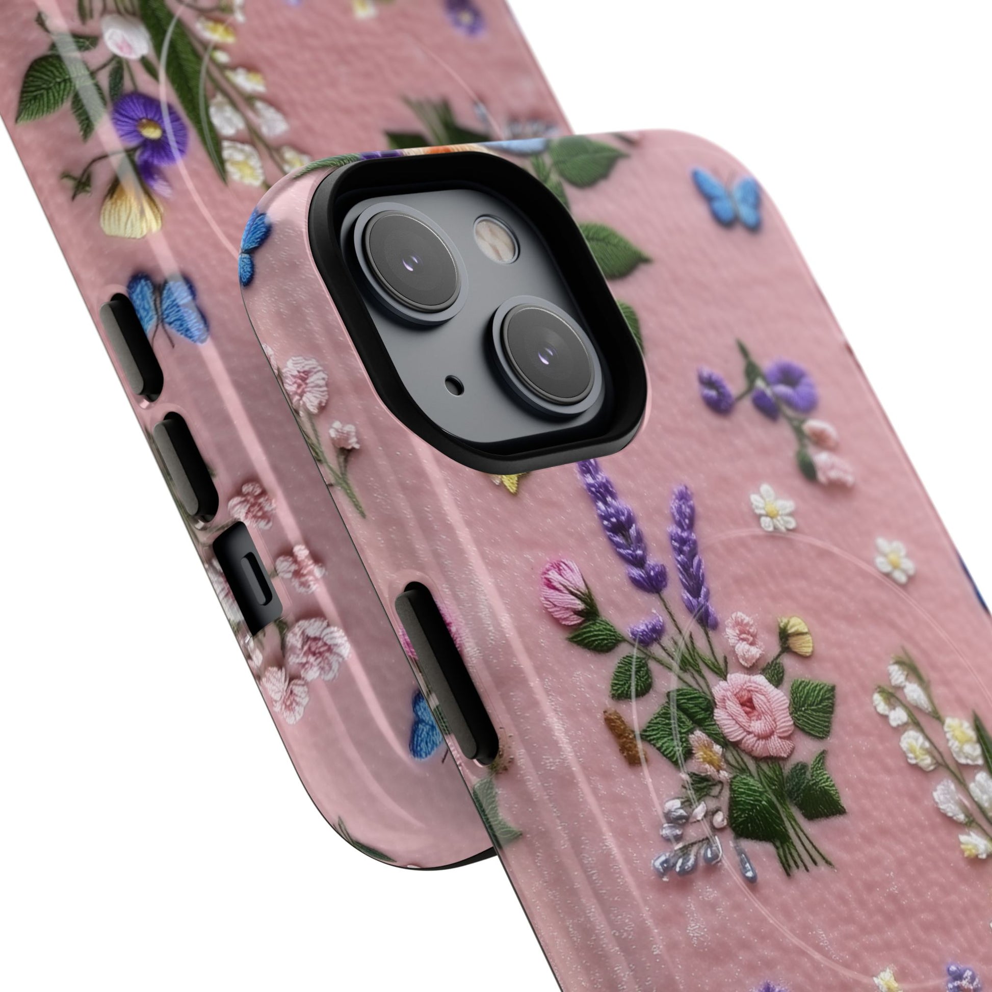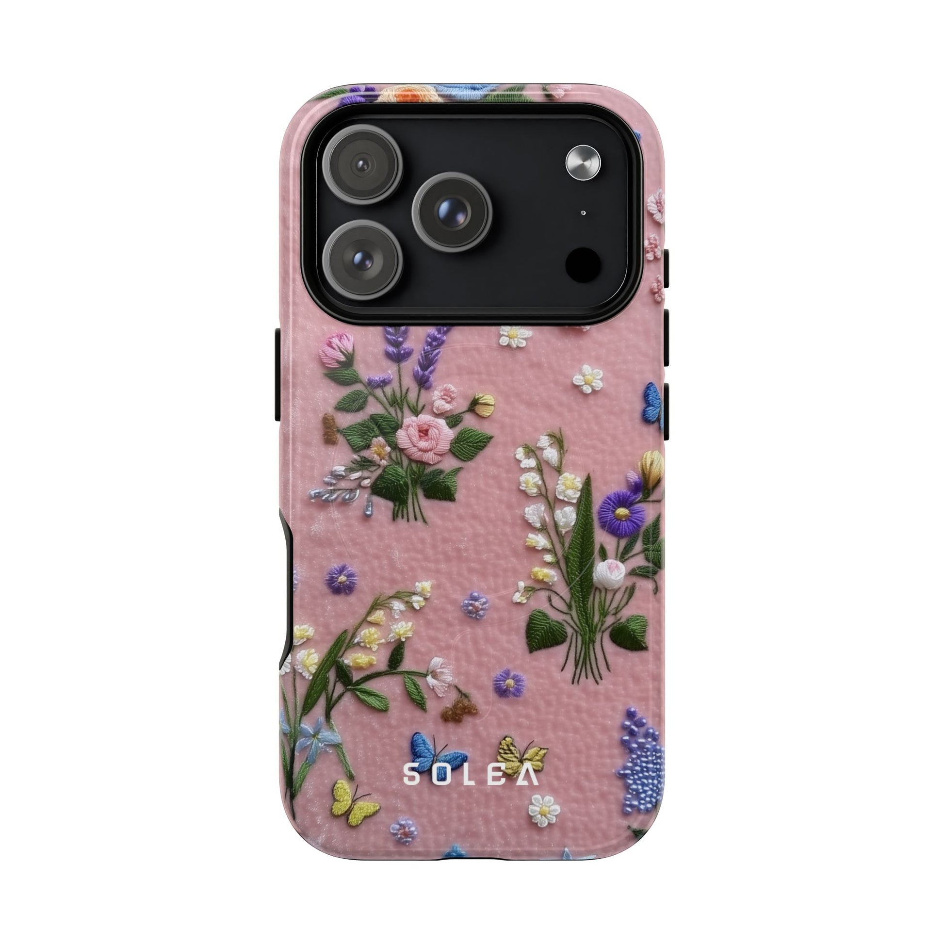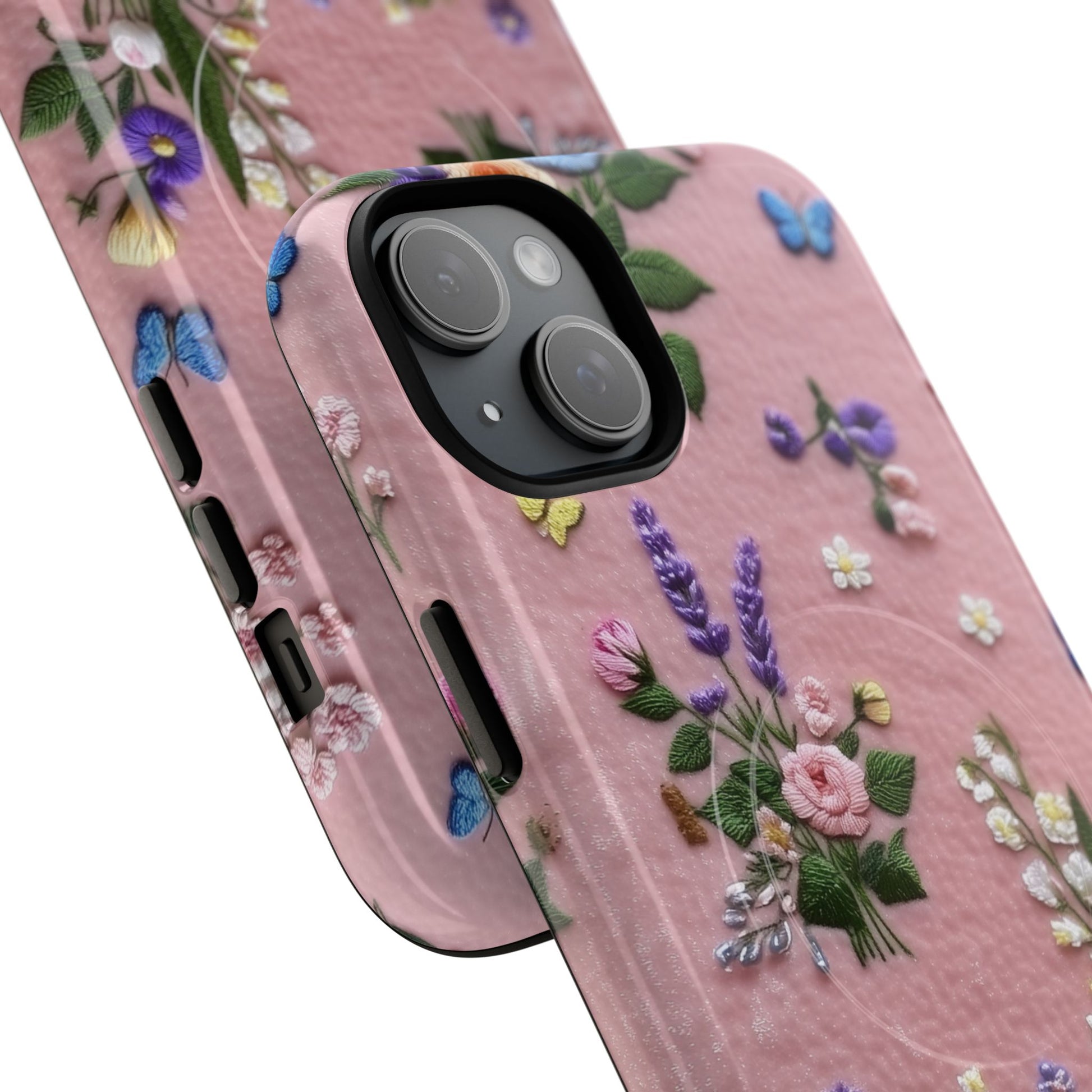 A slim, protective phone case featuring a soft embroidered floral pattern that blends delicate detail with a cozy, elegant aesthetic. Tiny blossoms in shades of pink, red, yellow, white, and light blue appear scattered across a creamy background, each flower connected by slender green stems that give the design a light, garden-inspired feel. The embroidered look adds subtle texture and charm while maintaining a clean, modern finish. Available in glossy or matte, the pattern remains crisp and vibrant while feeling smooth in hand. Built with a dual-layer shell and a shock-absorbing TPU liner, it helps protect your phone from everyday drops while staying slim and comfortable to hold. MagSafe® compatibility ensures your daily routine stays effortless—chargers, wallets, and grips attach instantly without removing the case. It’s a gentle blend of floral beauty and dependable protection.