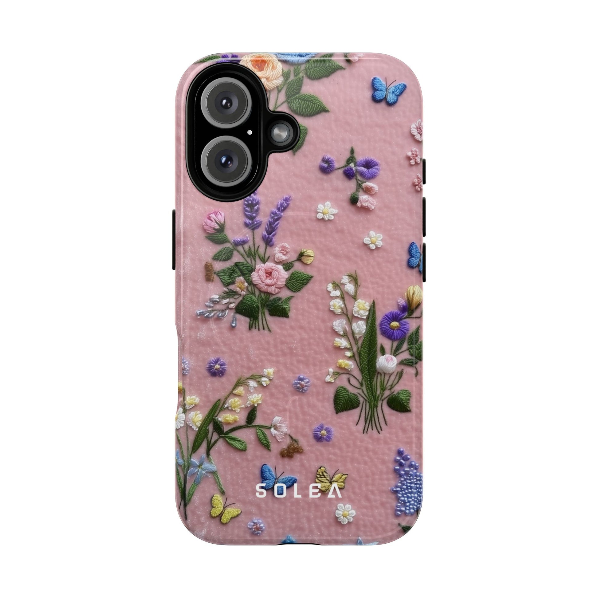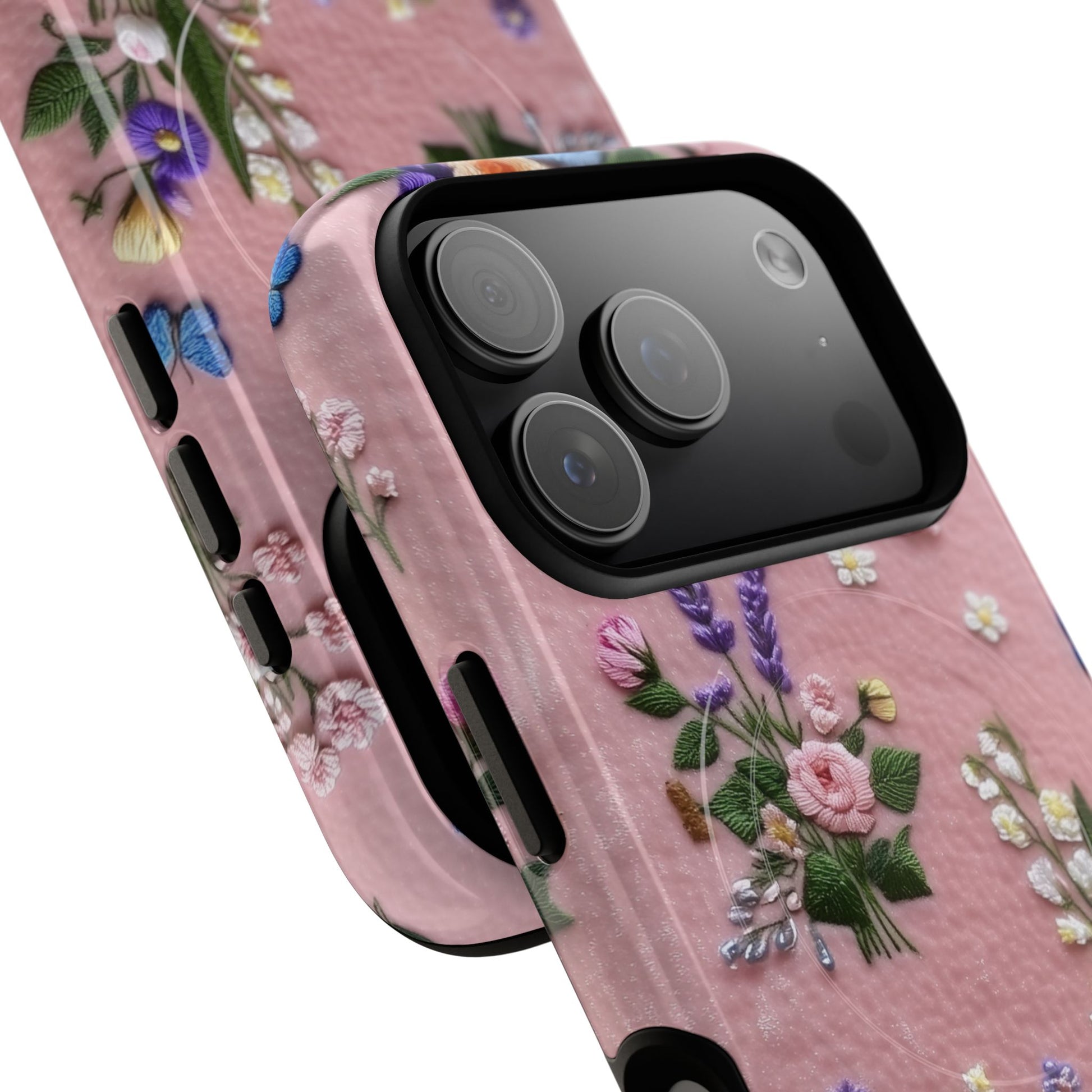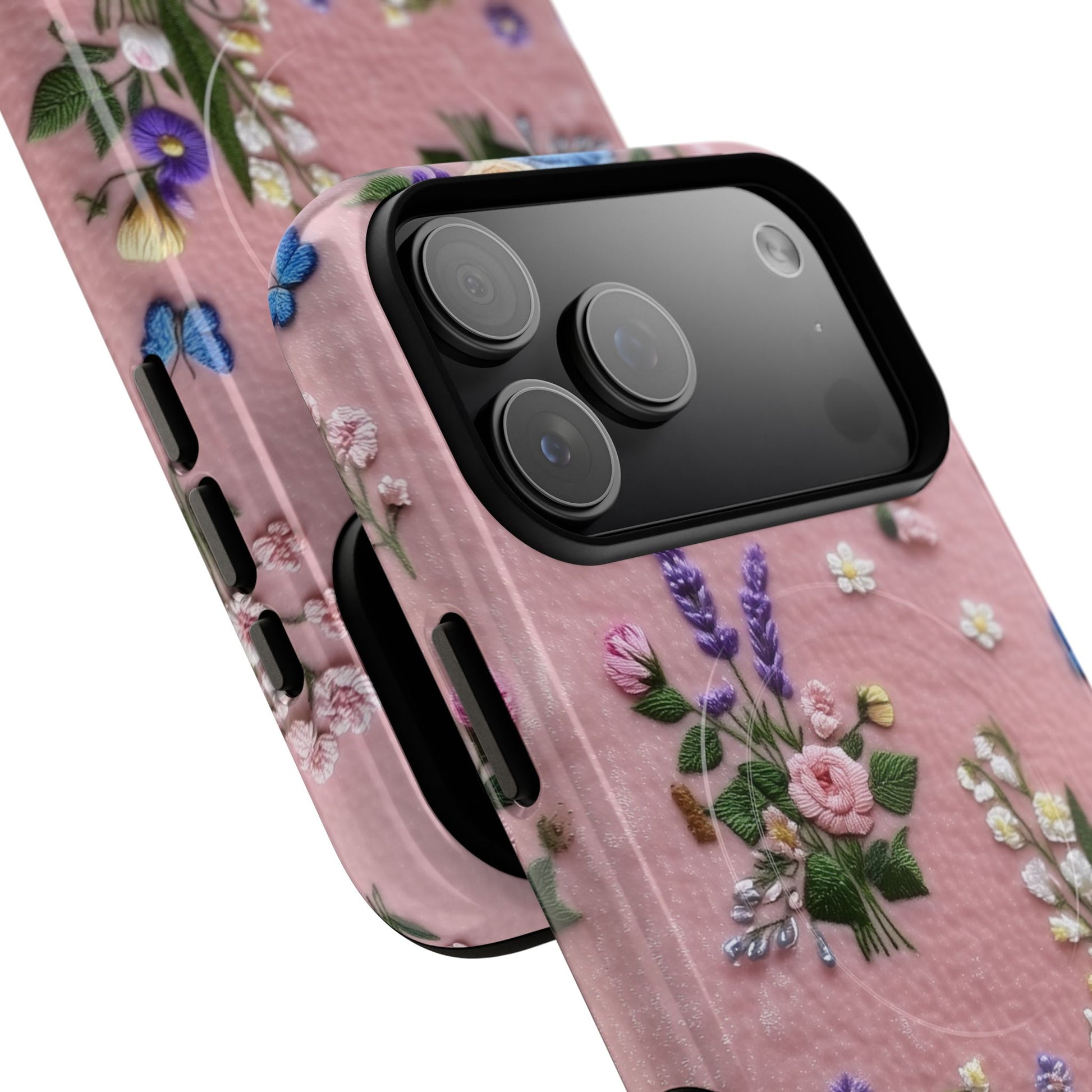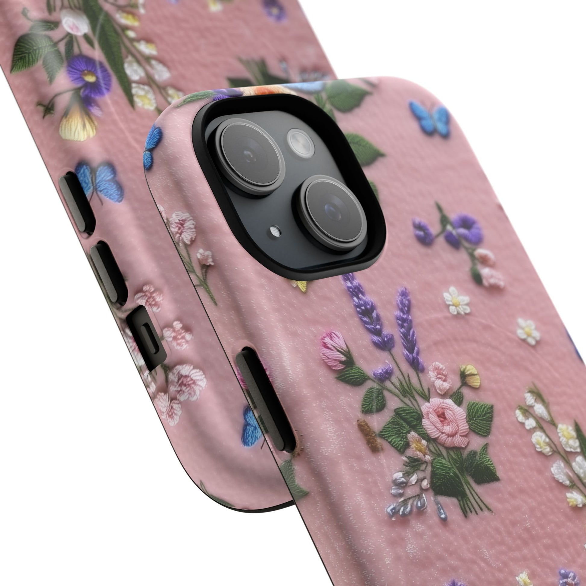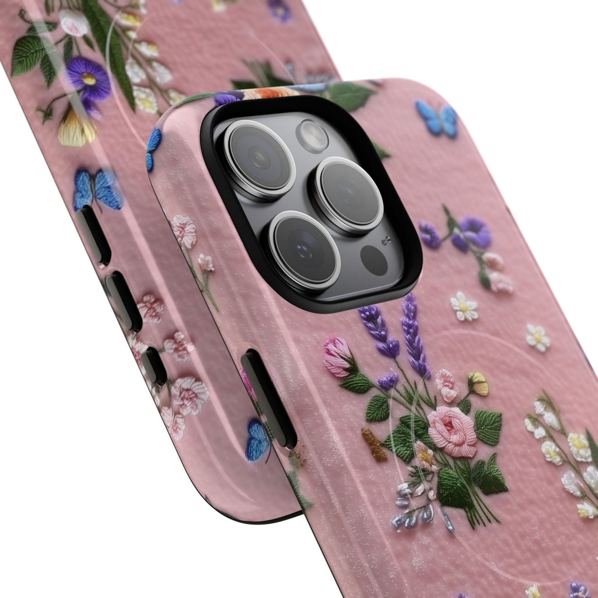 A slim, protective phone case featuring a soft embroidered floral pattern that blends delicate detail with a cozy, elegant aesthetic. Tiny blossoms in shades of pink, red, yellow, white, and light blue appear scattered across a creamy background, each flower connected by slender green stems that give the design a light, garden-inspired feel. The embroidered look adds subtle texture and charm while maintaining a clean, modern finish. Available in glossy or matte, the pattern remains crisp and vibrant while feeling smooth in hand. Built with a dual-layer shell and a shock-absorbing TPU liner, it helps protect your phone from everyday drops while staying slim and comfortable to hold. MagSafe® compatibility ensures your daily routine stays effortless—chargers, wallets, and grips attach instantly without removing the case. It’s a gentle blend of floral beauty and dependable protection.