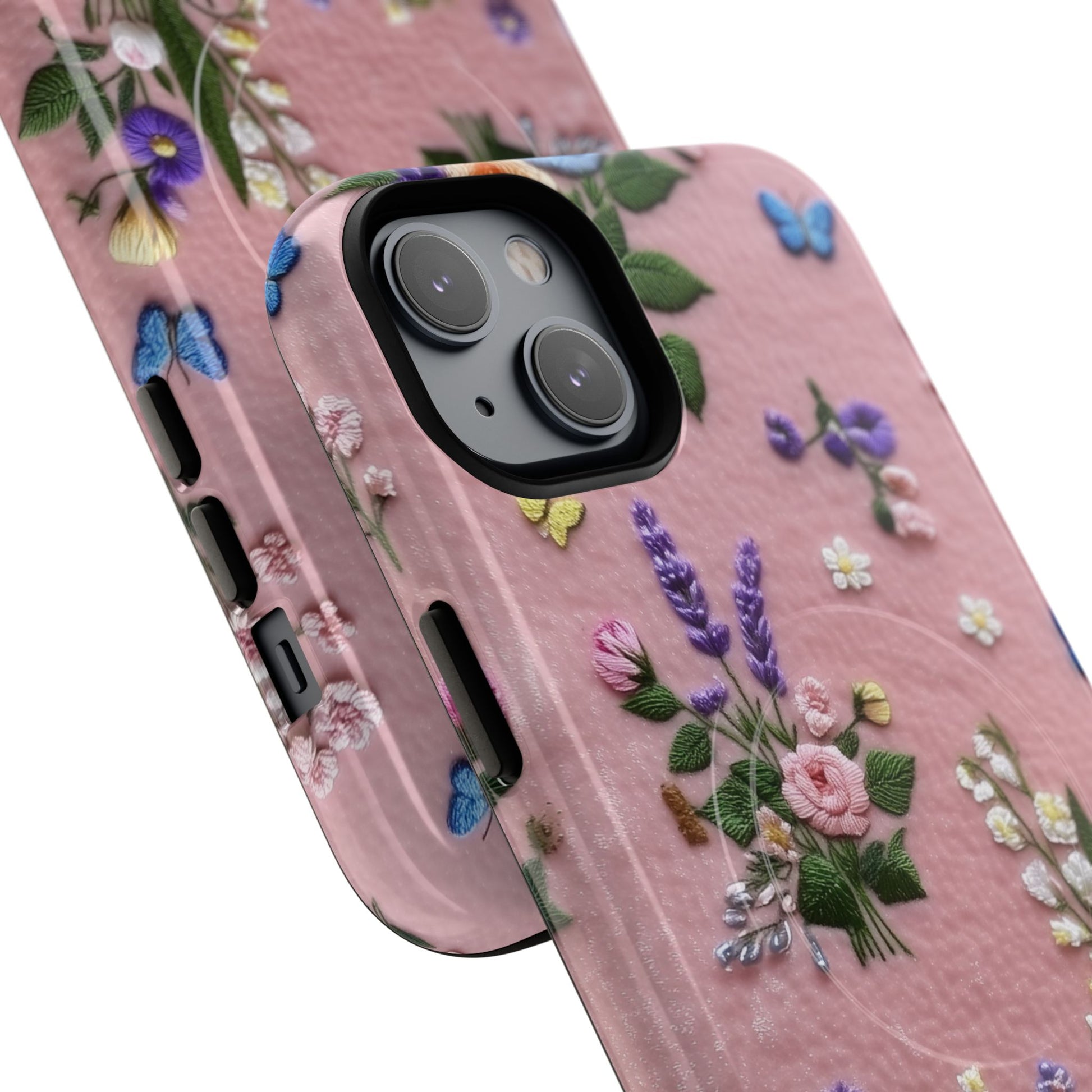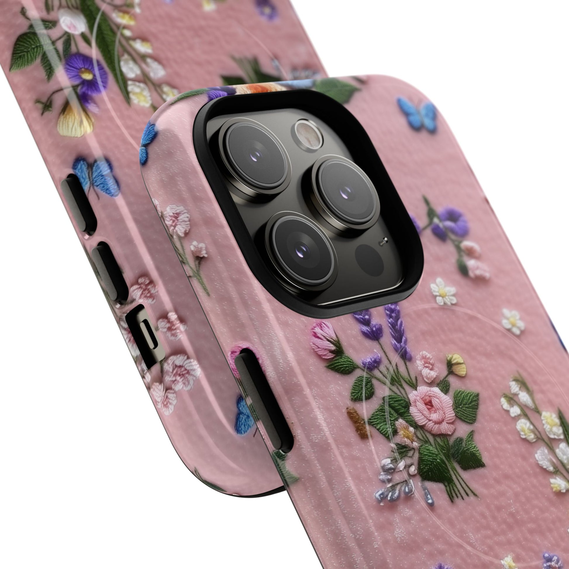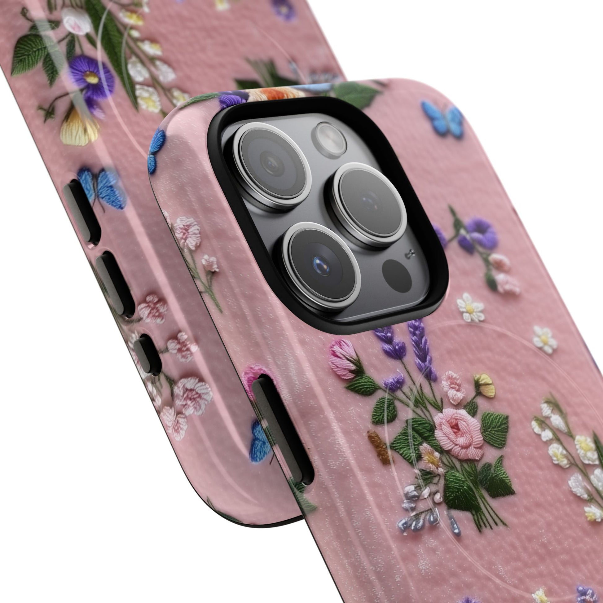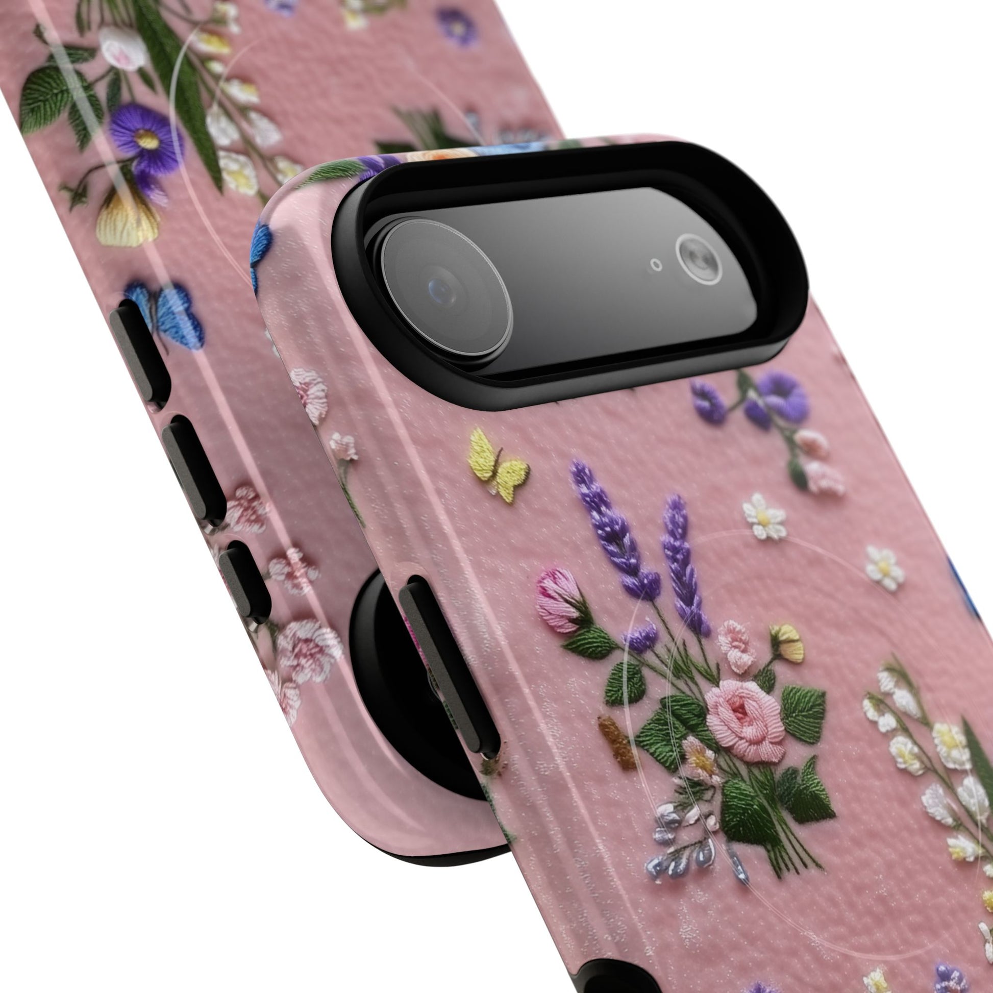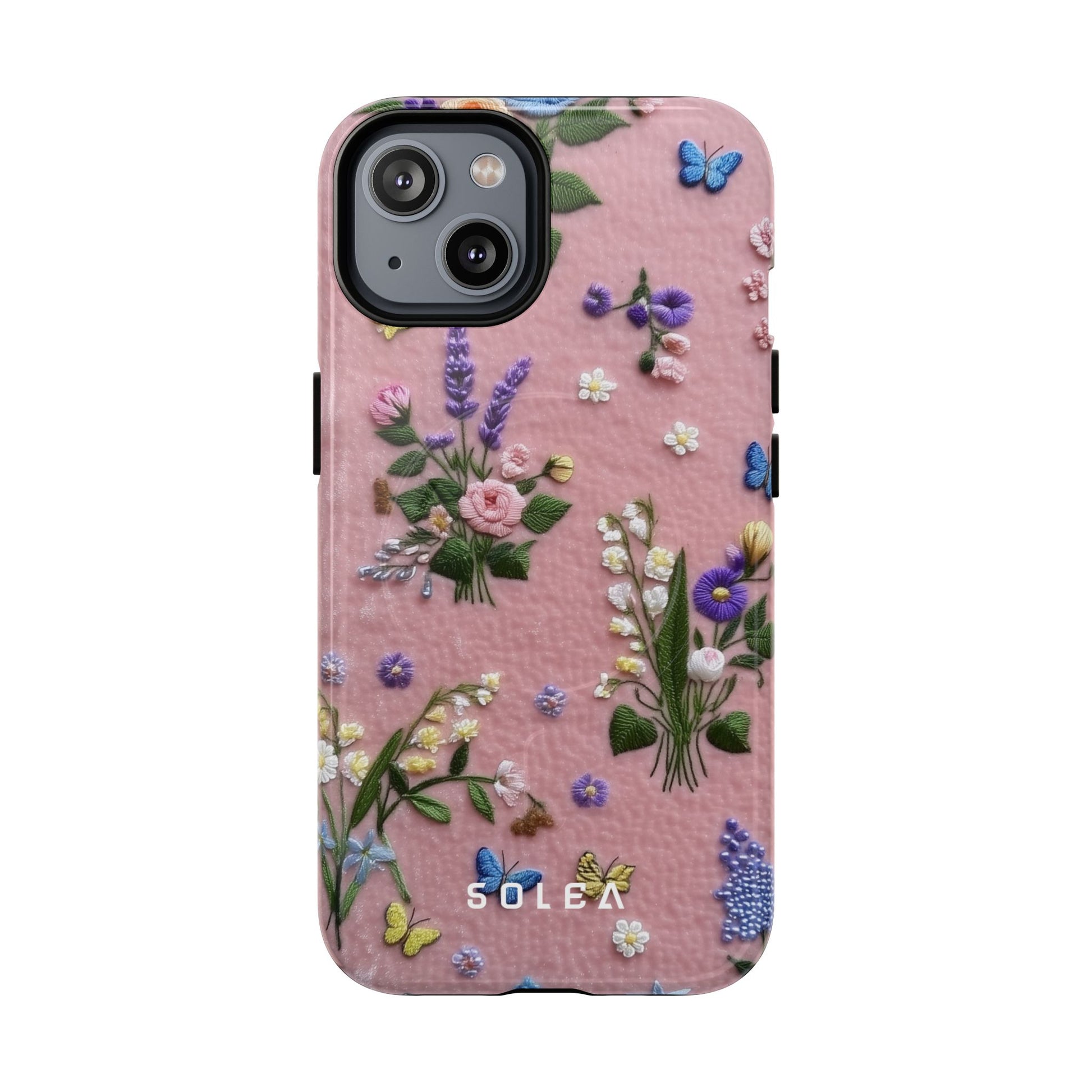 A slim, protective phone case featuring a soft embroidered floral pattern that blends delicate detail with a cozy, elegant aesthetic. Tiny blossoms in shades of pink, red, yellow, white, and light blue appear scattered across a creamy background, each flower connected by slender green stems that give the design a light, garden-inspired feel. The embroidered look adds subtle texture and charm while maintaining a clean, modern finish. Available in glossy or matte, the pattern remains crisp and vibrant while feeling smooth in hand. Built with a dual-layer shell and a shock-absorbing TPU liner, it helps protect your phone from everyday drops while staying slim and comfortable to hold. MagSafe® compatibility ensures your daily routine stays effortless—chargers, wallets, and grips attach instantly without removing the case. It’s a gentle blend of floral beauty and dependable protection.