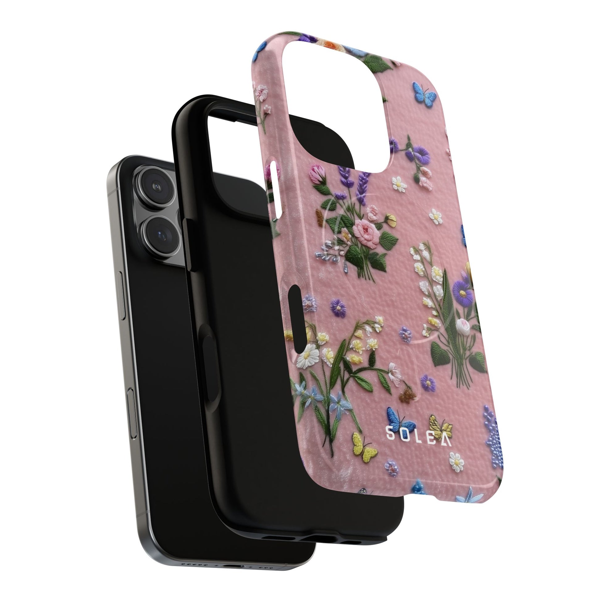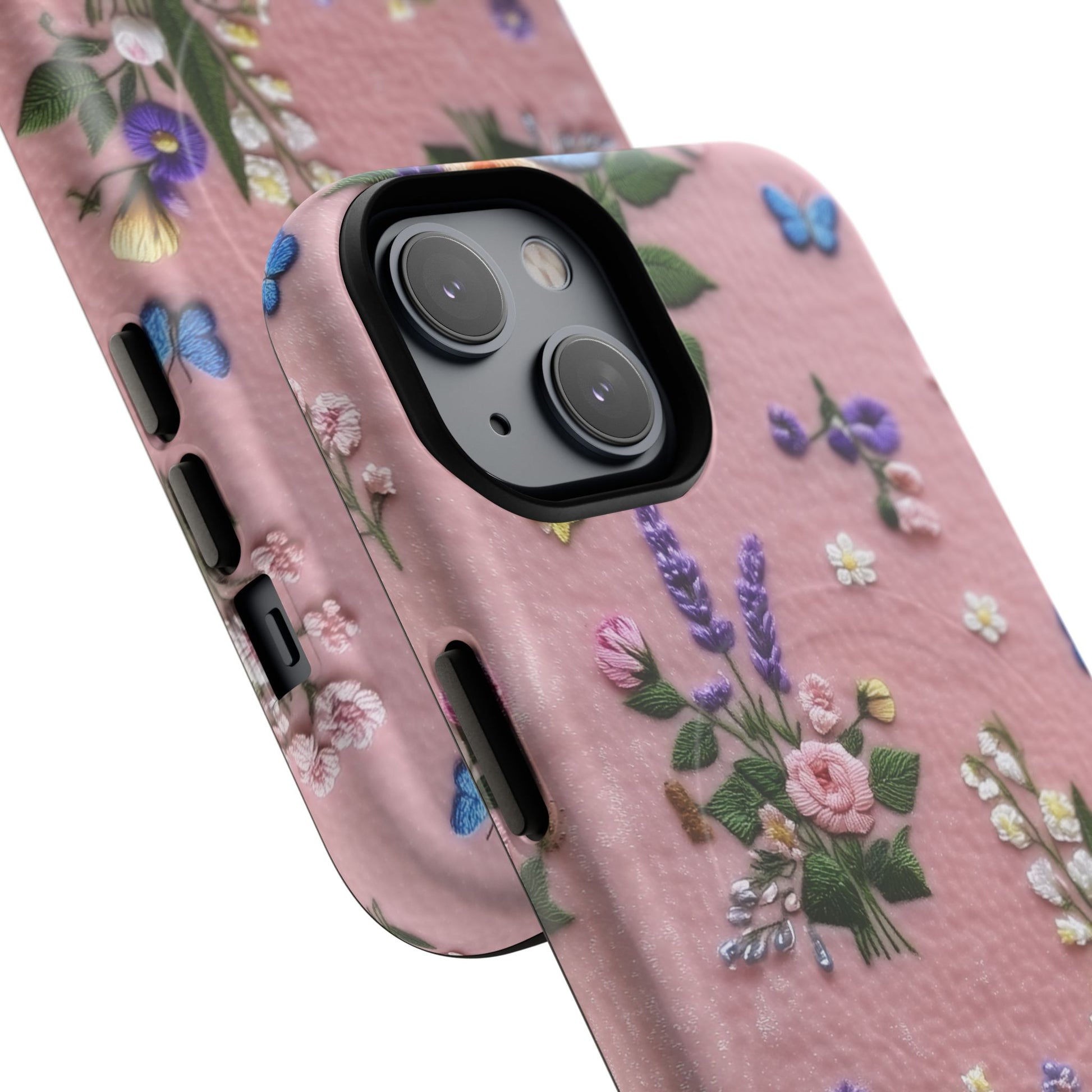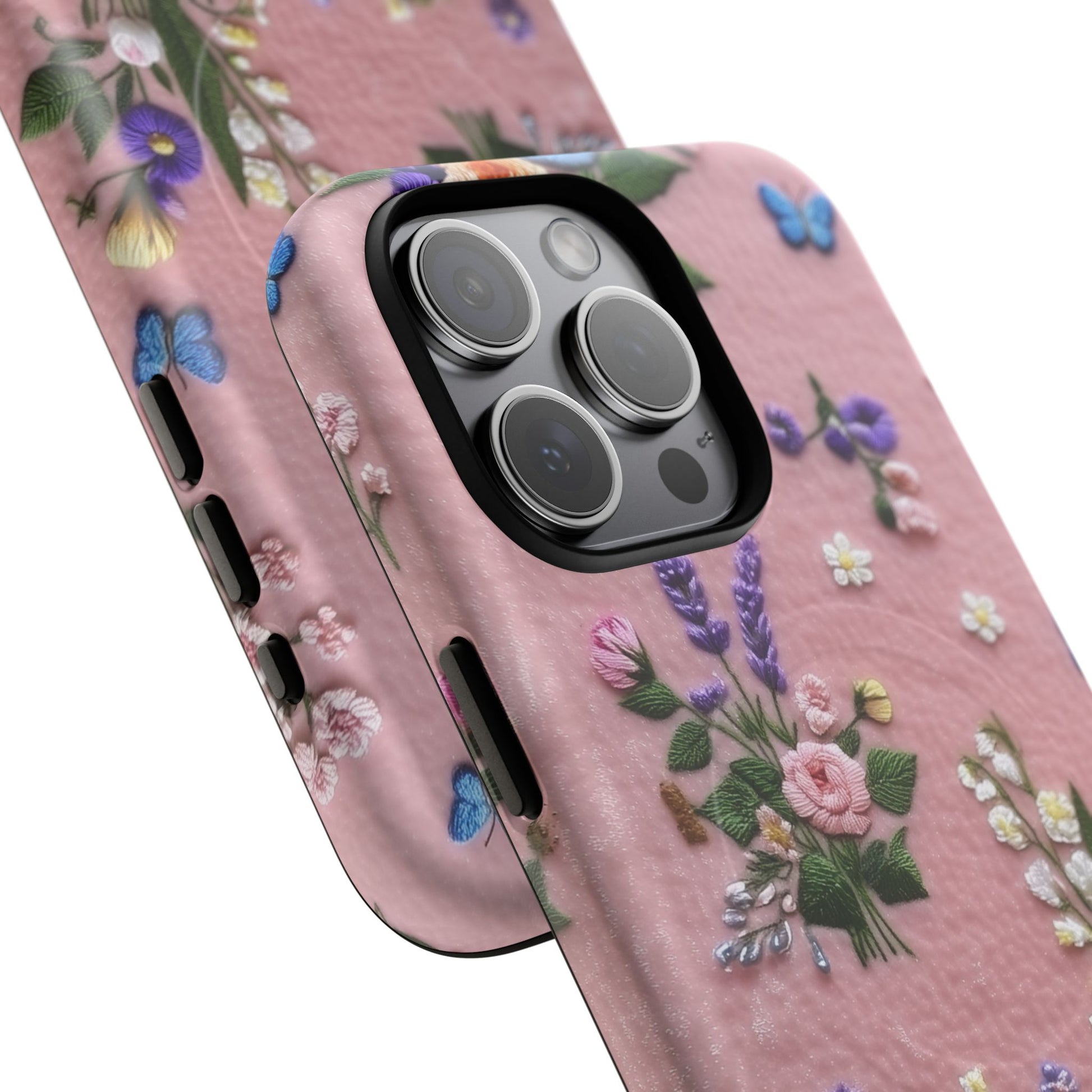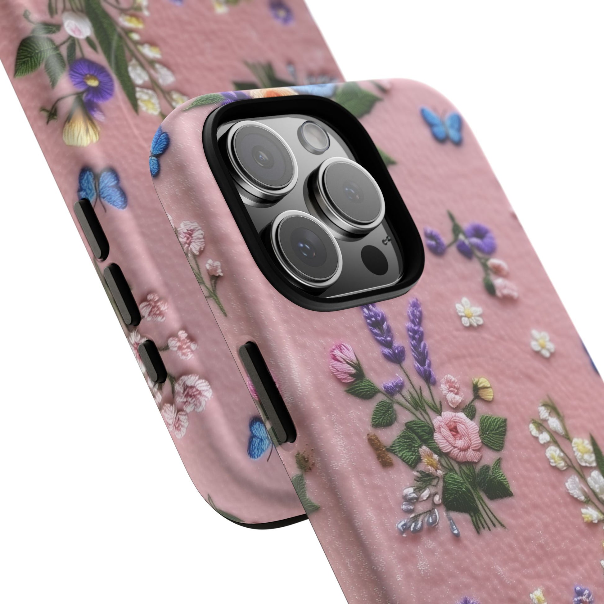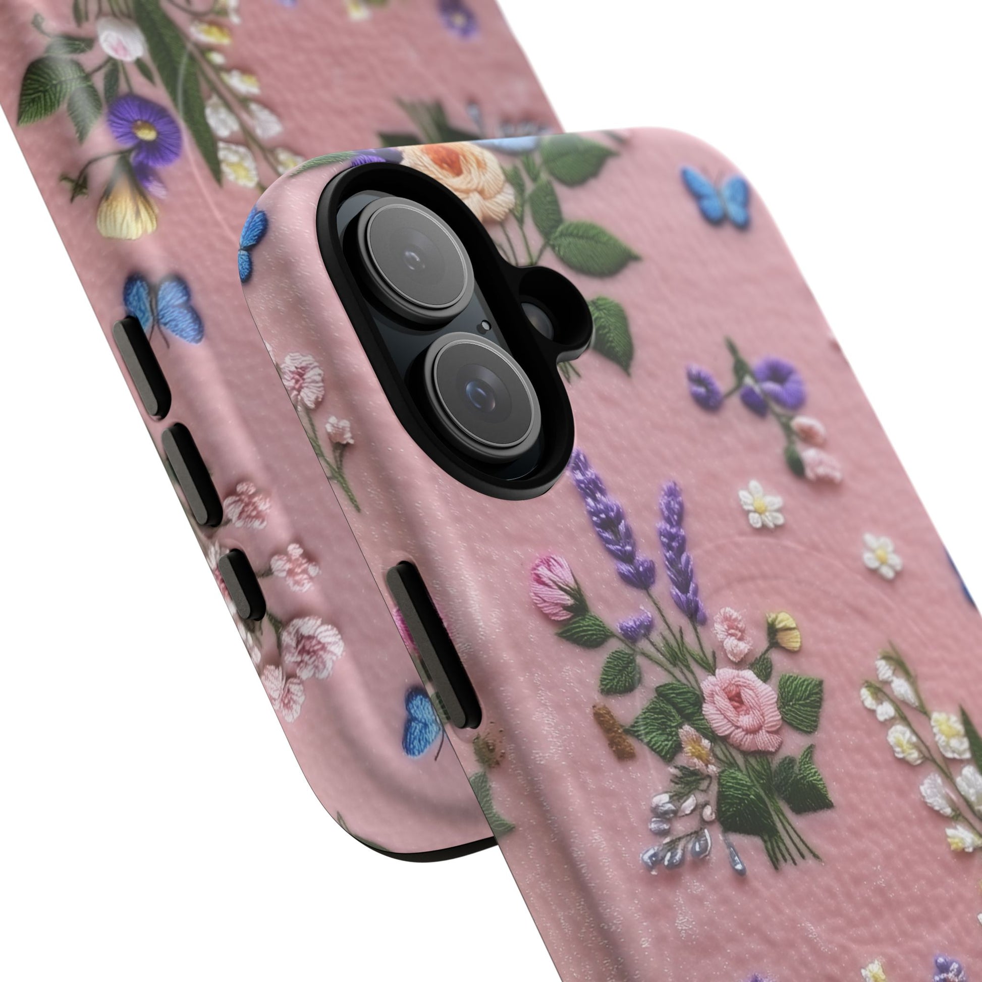 A slim, protective phone case featuring a soft embroidered floral pattern that blends delicate detail with a cozy, elegant aesthetic. Tiny blossoms in shades of pink, red, yellow, white, and light blue appear scattered across a creamy background, each flower connected by slender green stems that give the design a light, garden-inspired feel. The embroidered look adds subtle texture and charm while maintaining a clean, modern finish. Available in glossy or matte, the pattern remains crisp and vibrant while feeling smooth in hand. Built with a dual-layer shell and a shock-absorbing TPU liner, it helps protect your phone from everyday drops while staying slim and comfortable to hold. MagSafe® compatibility ensures your daily routine stays effortless—chargers, wallets, and grips attach instantly without removing the case. It’s a gentle blend of floral beauty and dependable protection.