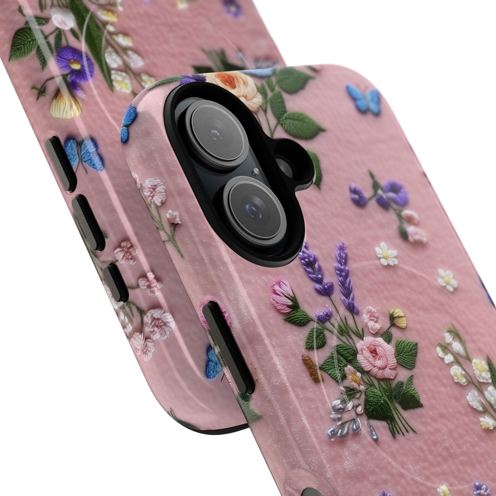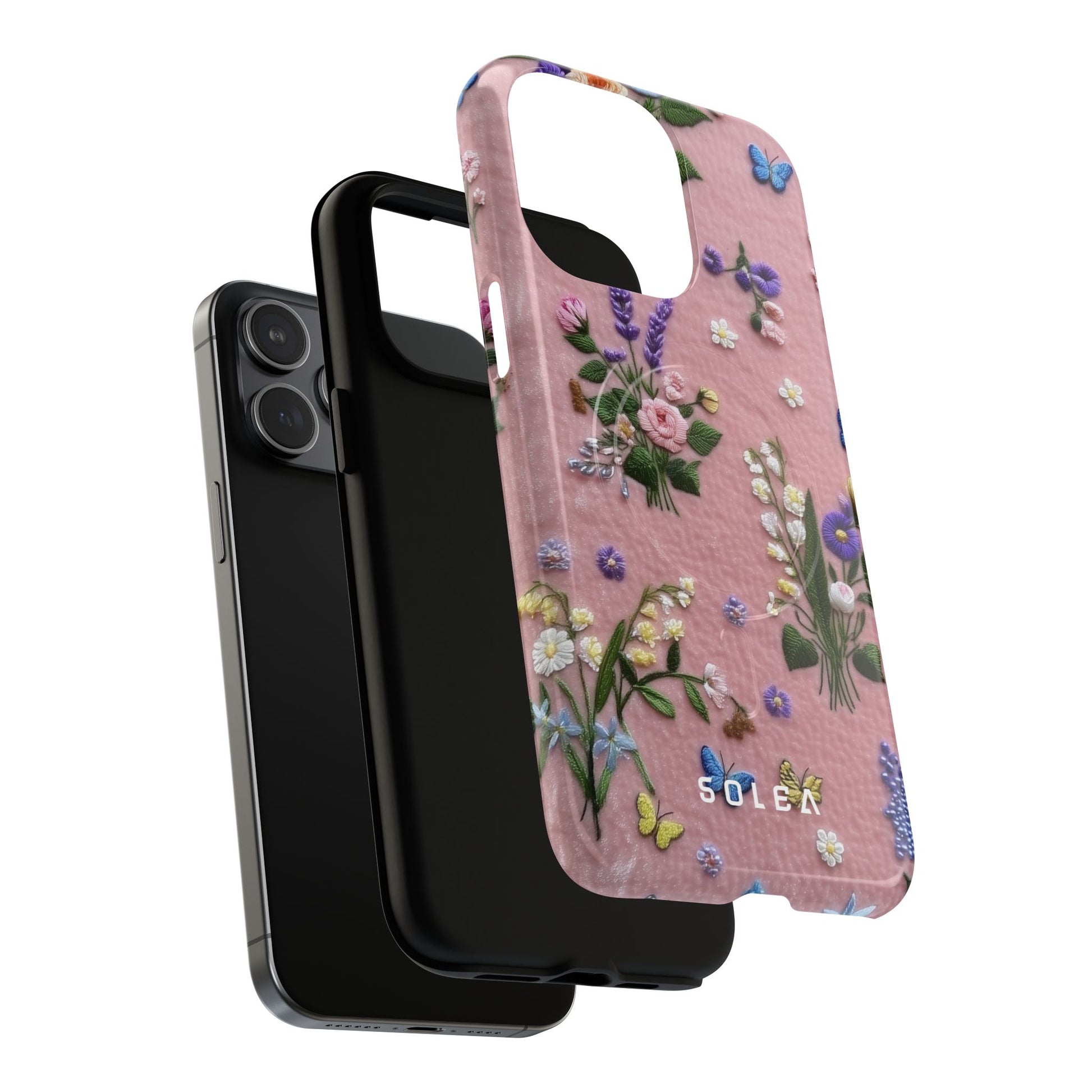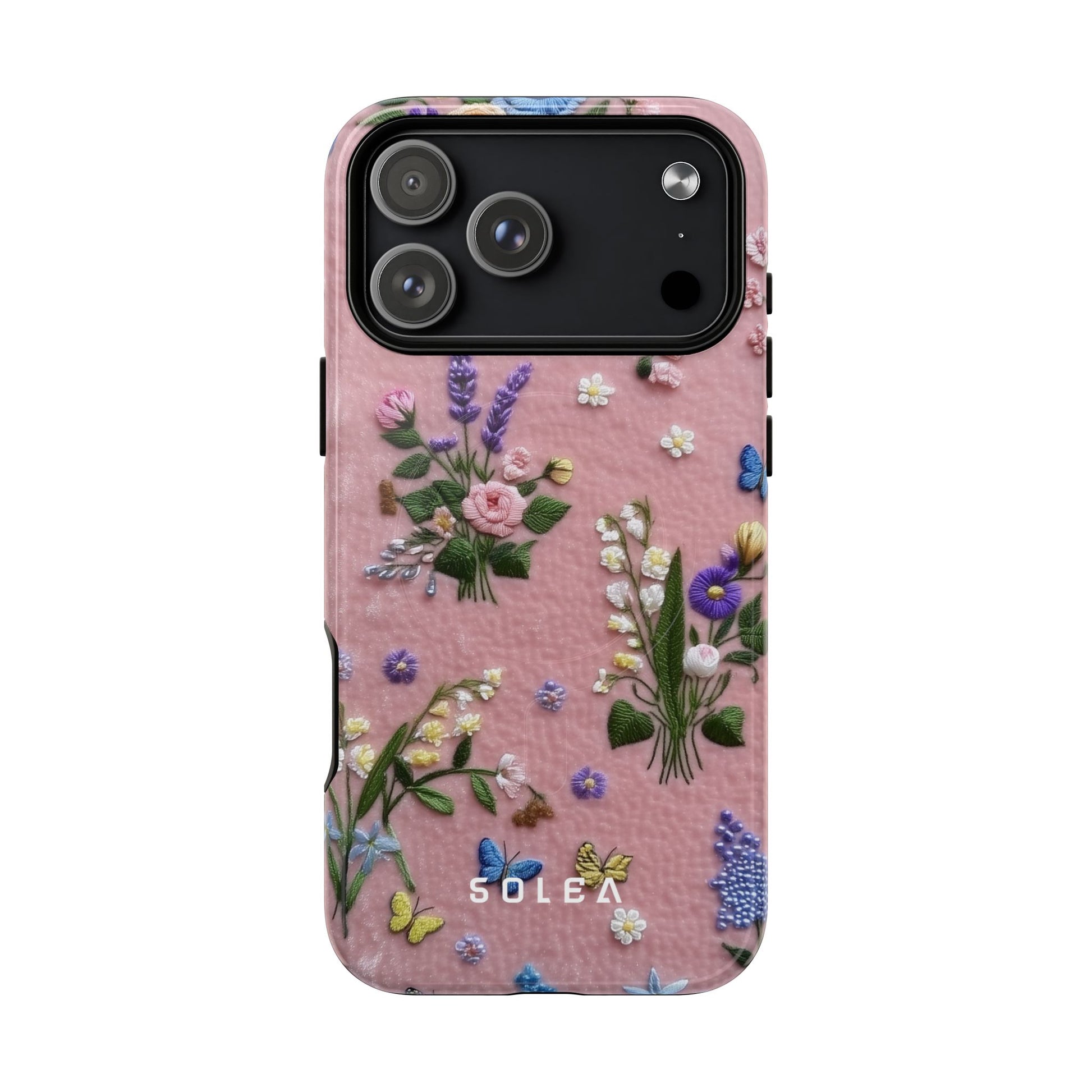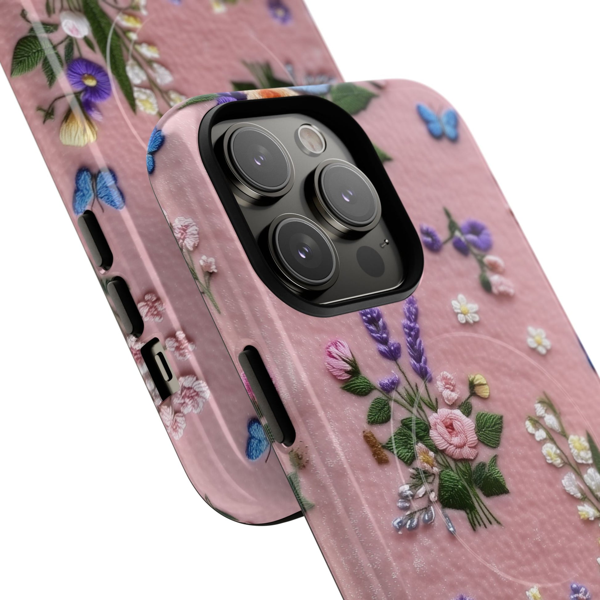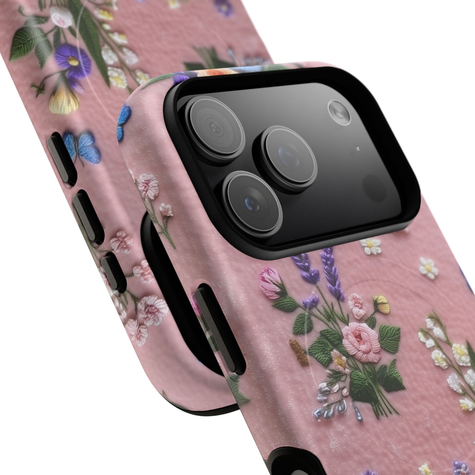 A slim, protective phone case featuring a soft embroidered floral pattern that blends delicate detail with a cozy, elegant aesthetic. Tiny blossoms in shades of pink, red, yellow, white, and light blue appear scattered across a creamy background, each flower connected by slender green stems that give the design a light, garden-inspired feel. The embroidered look adds subtle texture and charm while maintaining a clean, modern finish. Available in glossy or matte, the pattern remains crisp and vibrant while feeling smooth in hand. Built with a dual-layer shell and a shock-absorbing TPU liner, it helps protect your phone from everyday drops while staying slim and comfortable to hold. MagSafe® compatibility ensures your daily routine stays effortless—chargers, wallets, and grips attach instantly without removing the case. It’s a gentle blend of floral beauty and dependable protection.