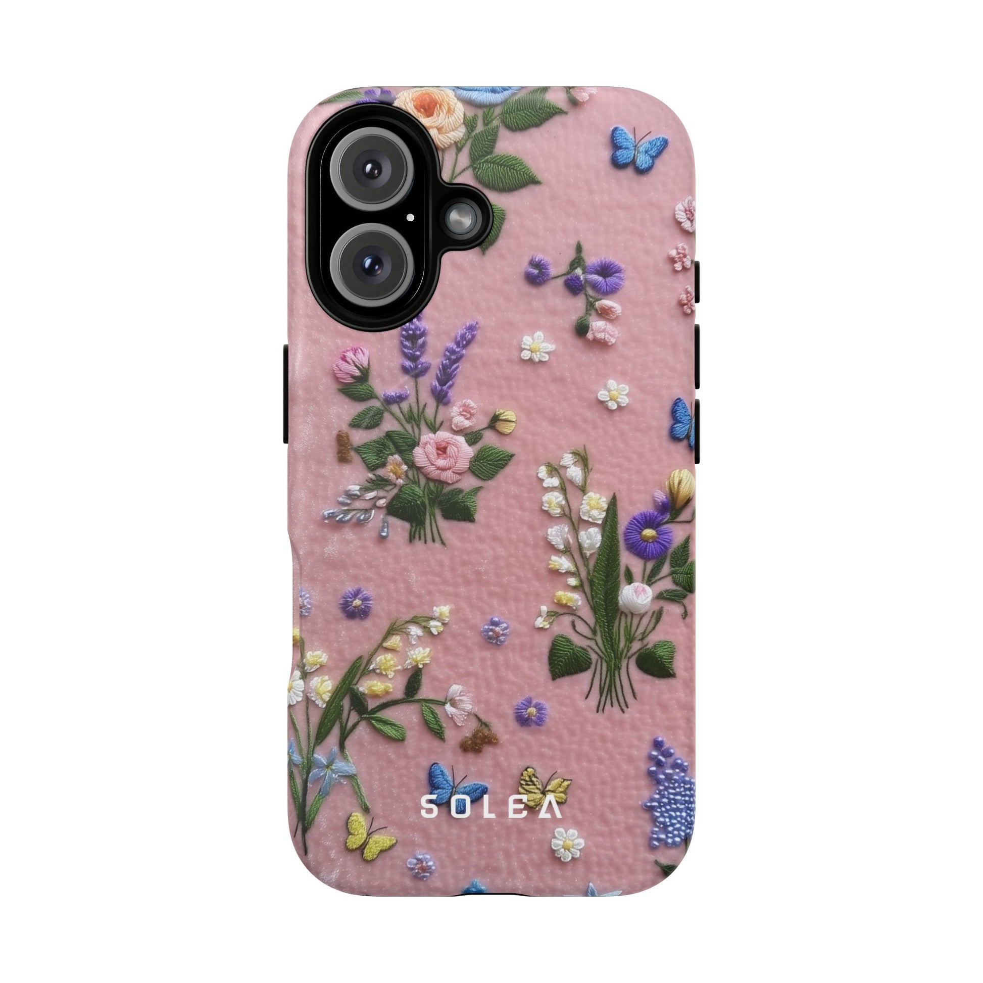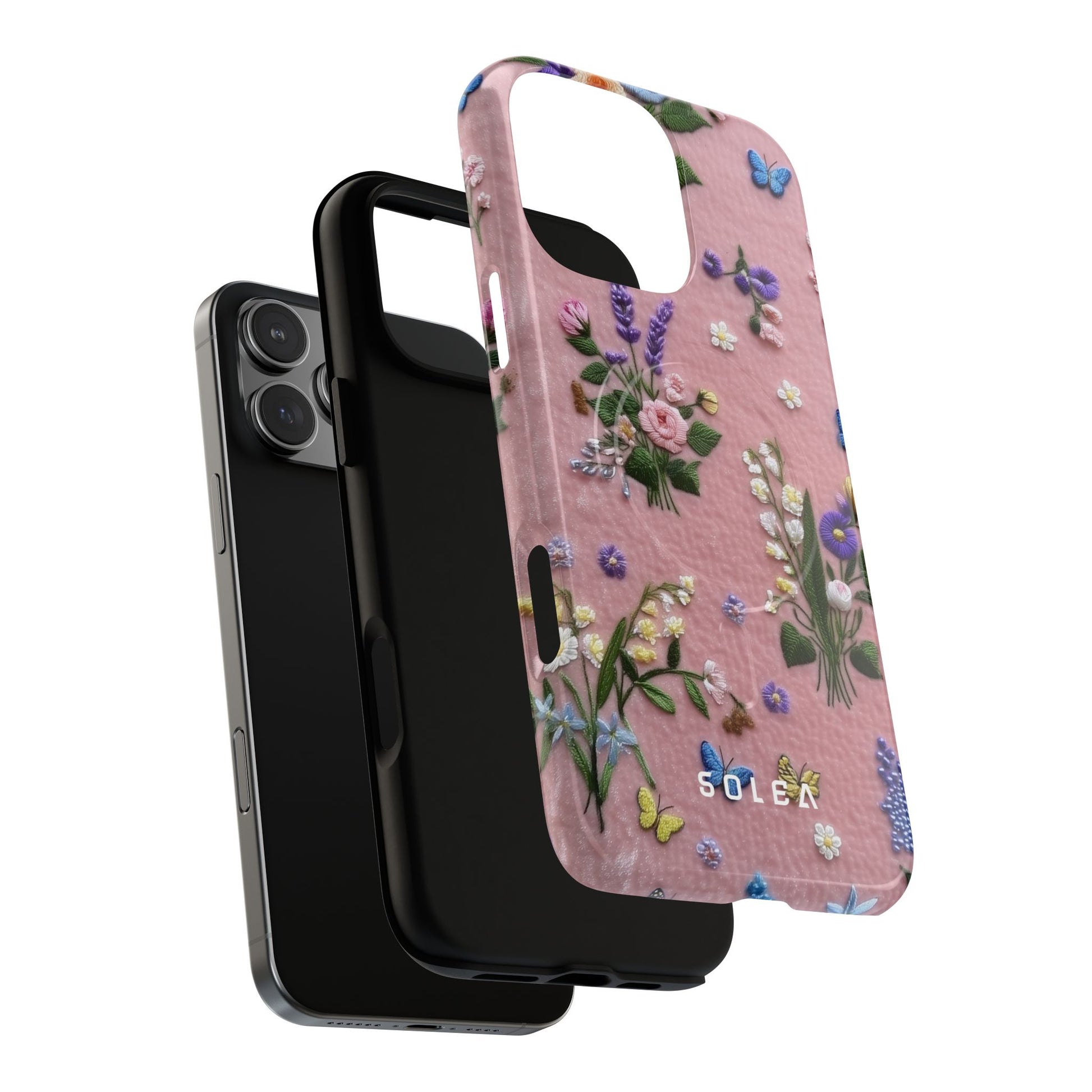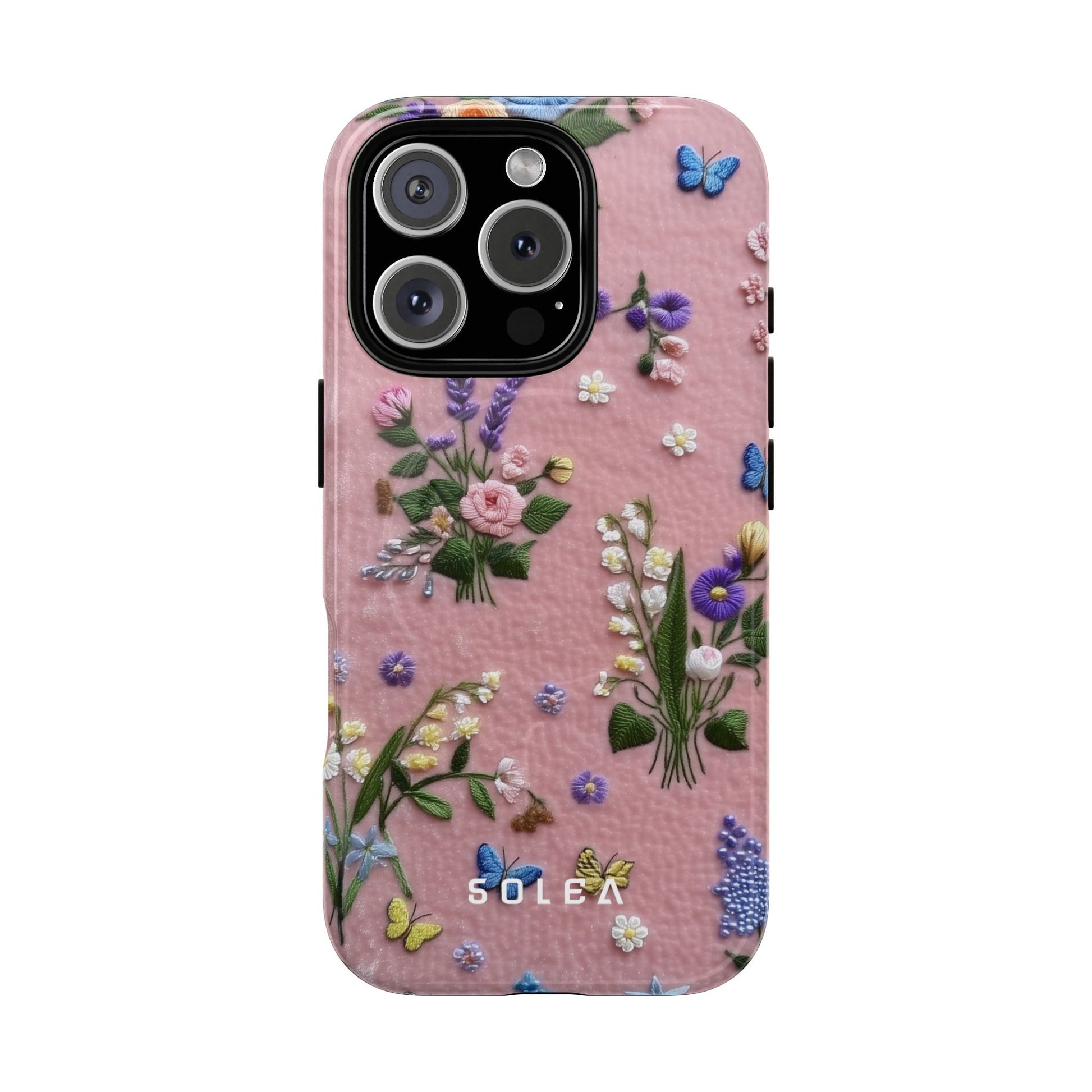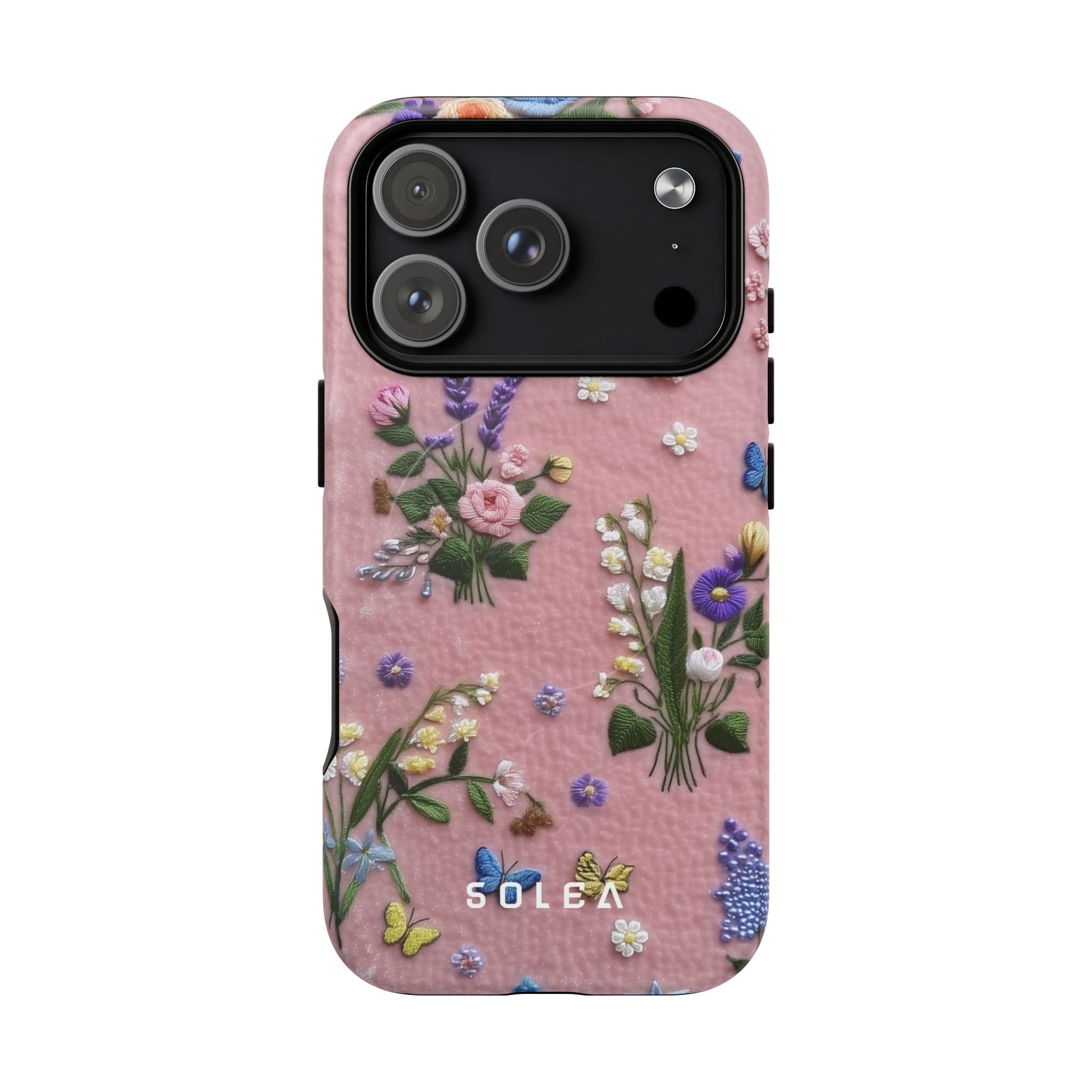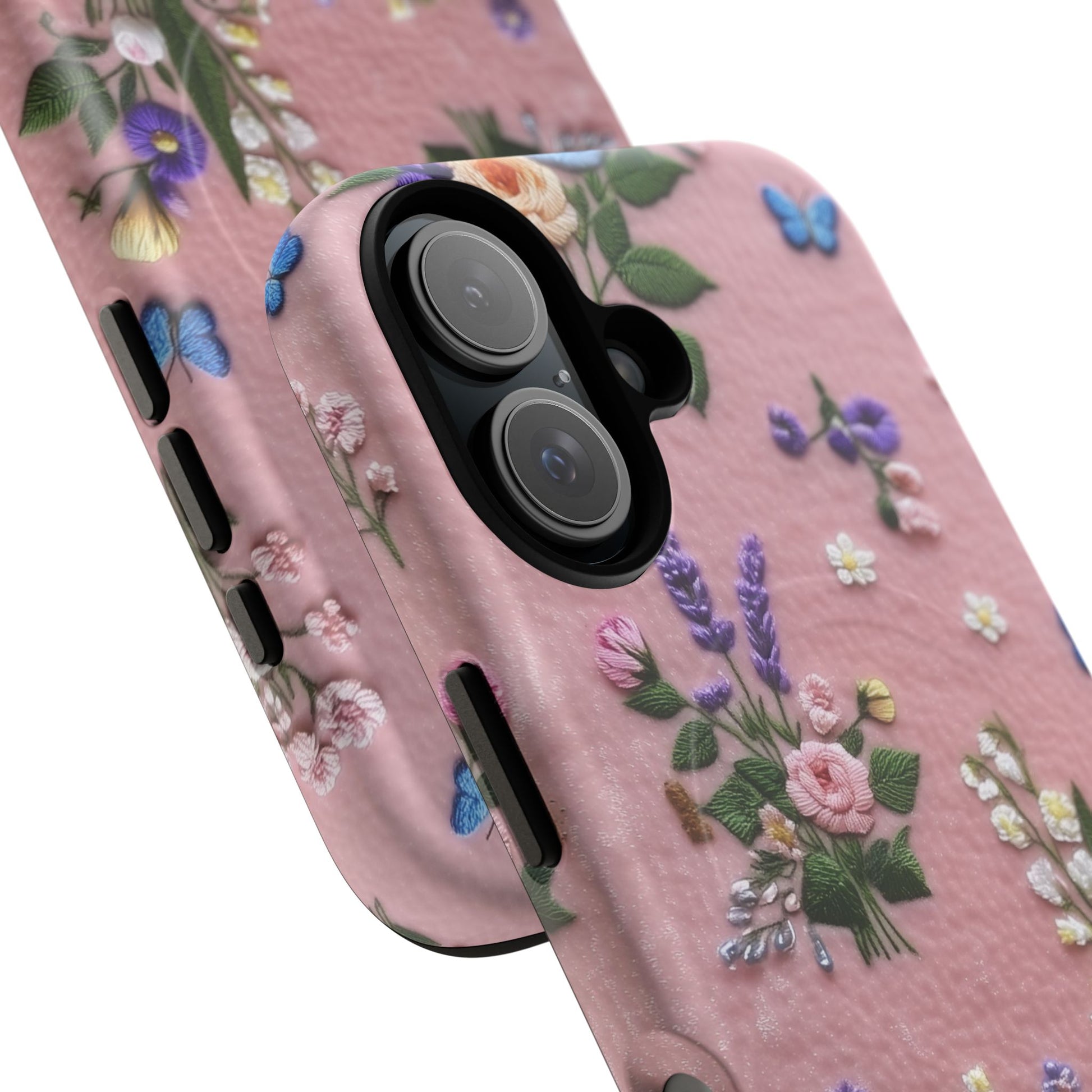A slim, protective phone case featuring a soft embroidered floral pattern that blends delicate detail with a cozy, elegant aesthetic. Tiny blossoms in shades of pink, red, yellow, white, and light blue appear scattered across a creamy background, each flower connected by slender green stems that give the design a light, garden-inspired feel. The embroidered look adds subtle texture and charm while maintaining a clean, modern finish. Available in glossy or matte, the pattern remains crisp and vibrant while feeling smooth in hand. Built with a dual-layer shell and a shock-absorbing TPU liner, it helps protect your phone from everyday drops while staying slim and comfortable to hold. MagSafe® compatibility ensures your daily routine stays effortless—chargers, wallets, and grips attach instantly without removing the case. It’s a gentle blend of floral beauty and dependable protection.