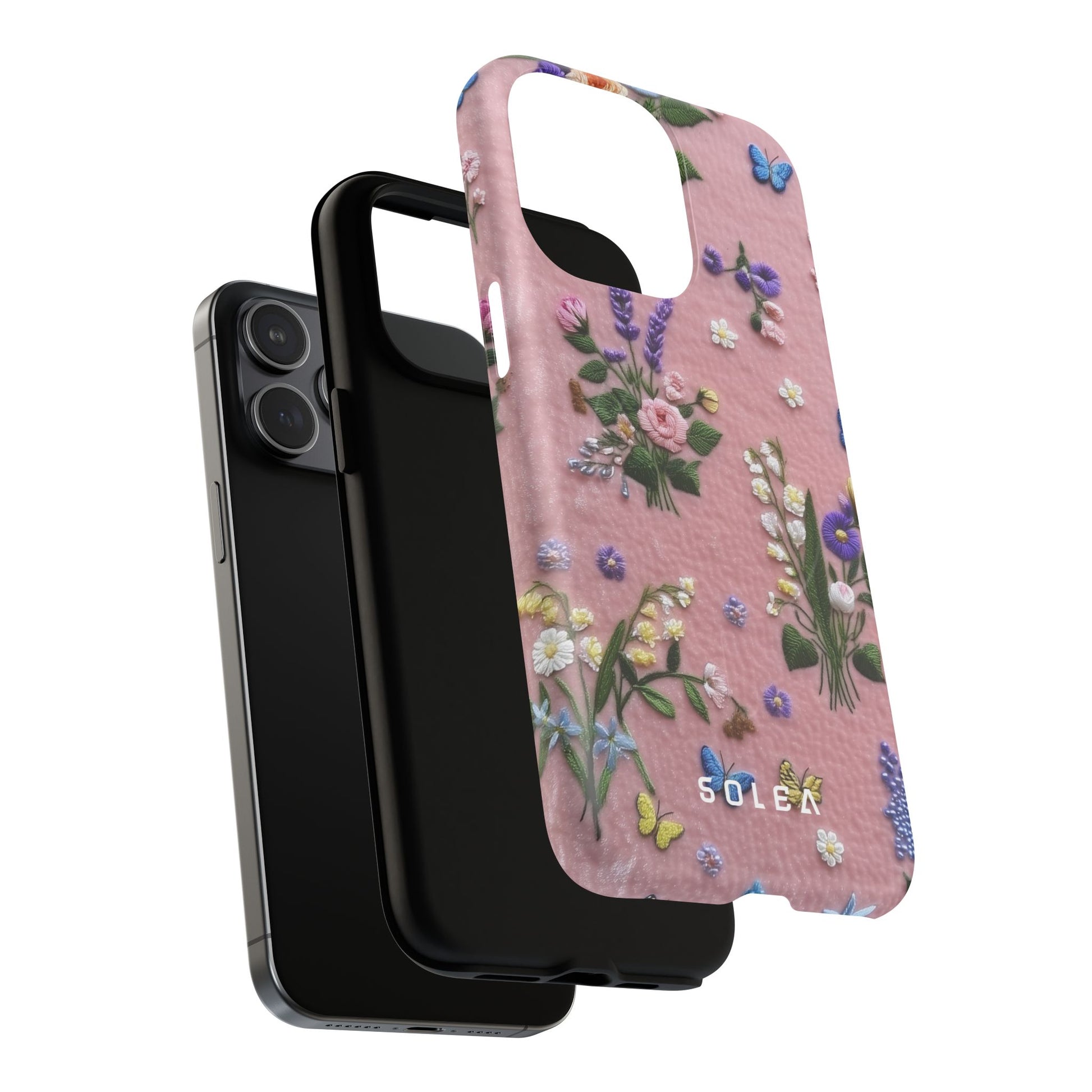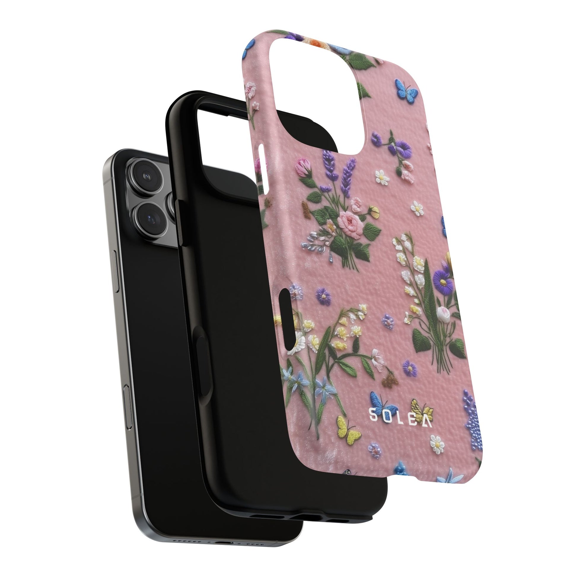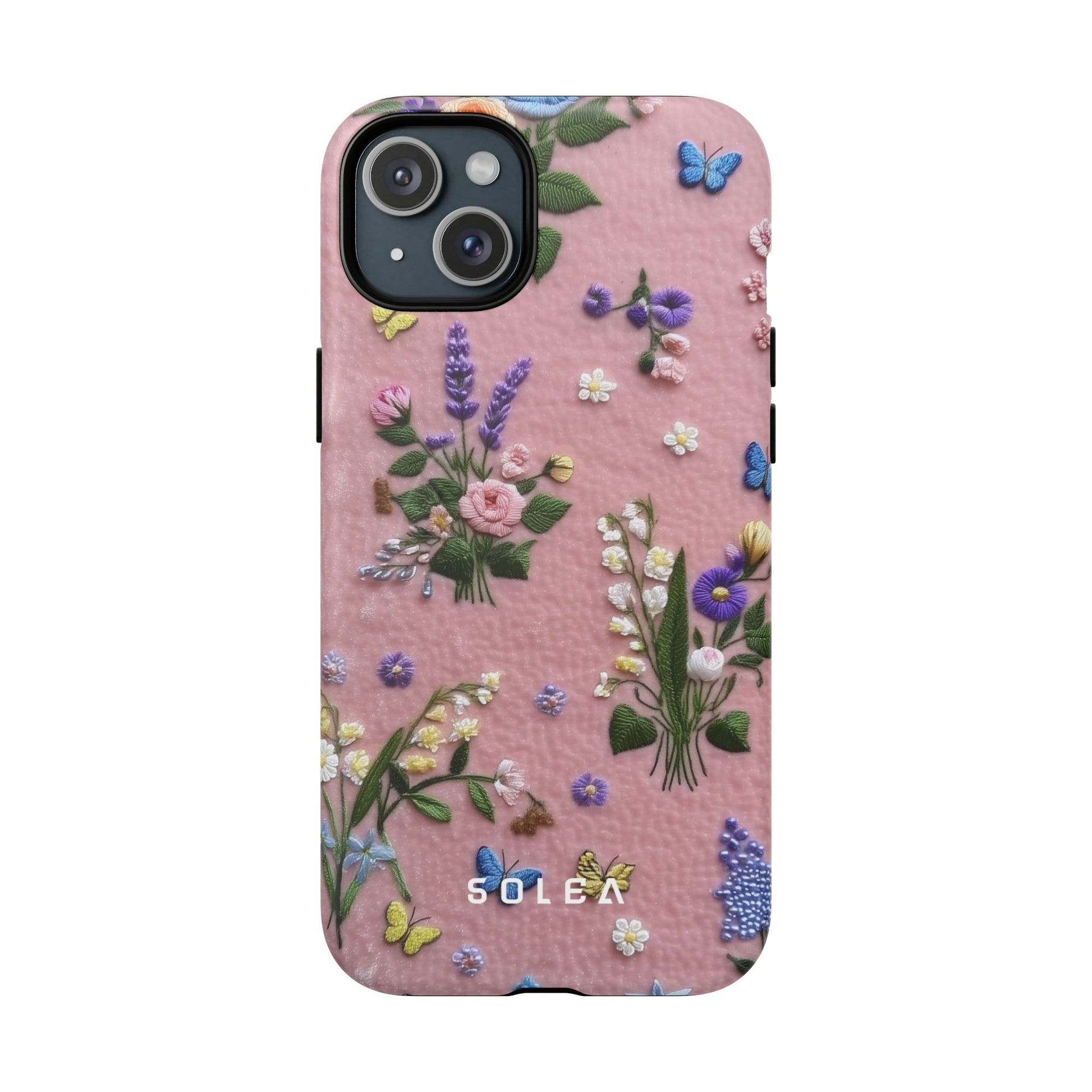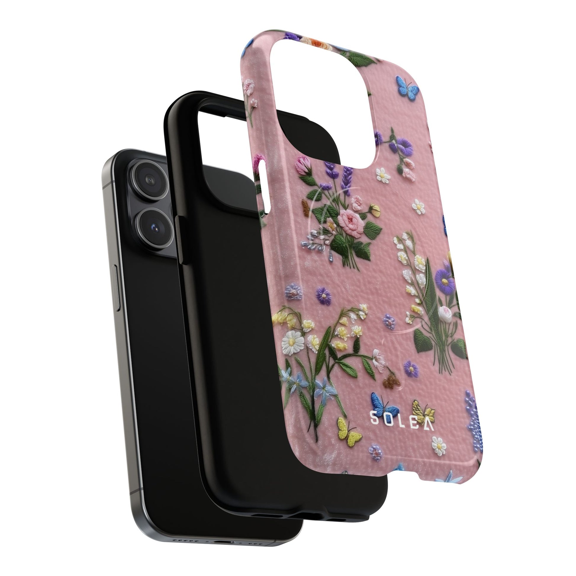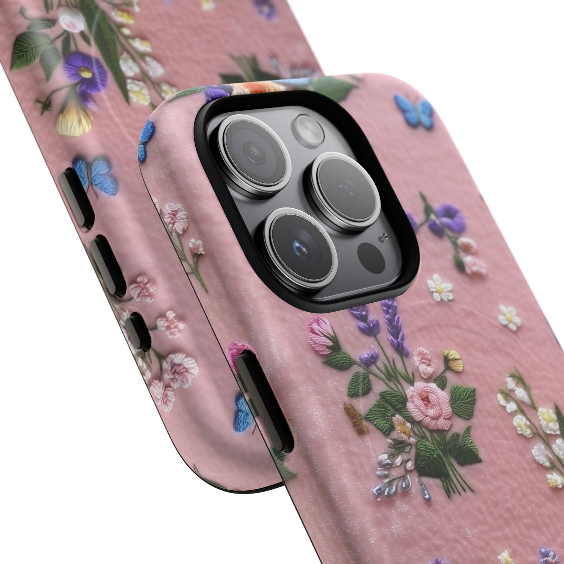 A slim, protective phone case featuring a soft embroidered floral pattern that blends delicate detail with a cozy, elegant aesthetic. Tiny blossoms in shades of pink, red, yellow, white, and light blue appear scattered across a creamy background, each flower connected by slender green stems that give the design a light, garden-inspired feel. The embroidered look adds subtle texture and charm while maintaining a clean, modern finish. Available in glossy or matte, the pattern remains crisp and vibrant while feeling smooth in hand. Built with a dual-layer shell and a shock-absorbing TPU liner, it helps protect your phone from everyday drops while staying slim and comfortable to hold. MagSafe® compatibility ensures your daily routine stays effortless—chargers, wallets, and grips attach instantly without removing the case. It’s a gentle blend of floral beauty and dependable protection.
