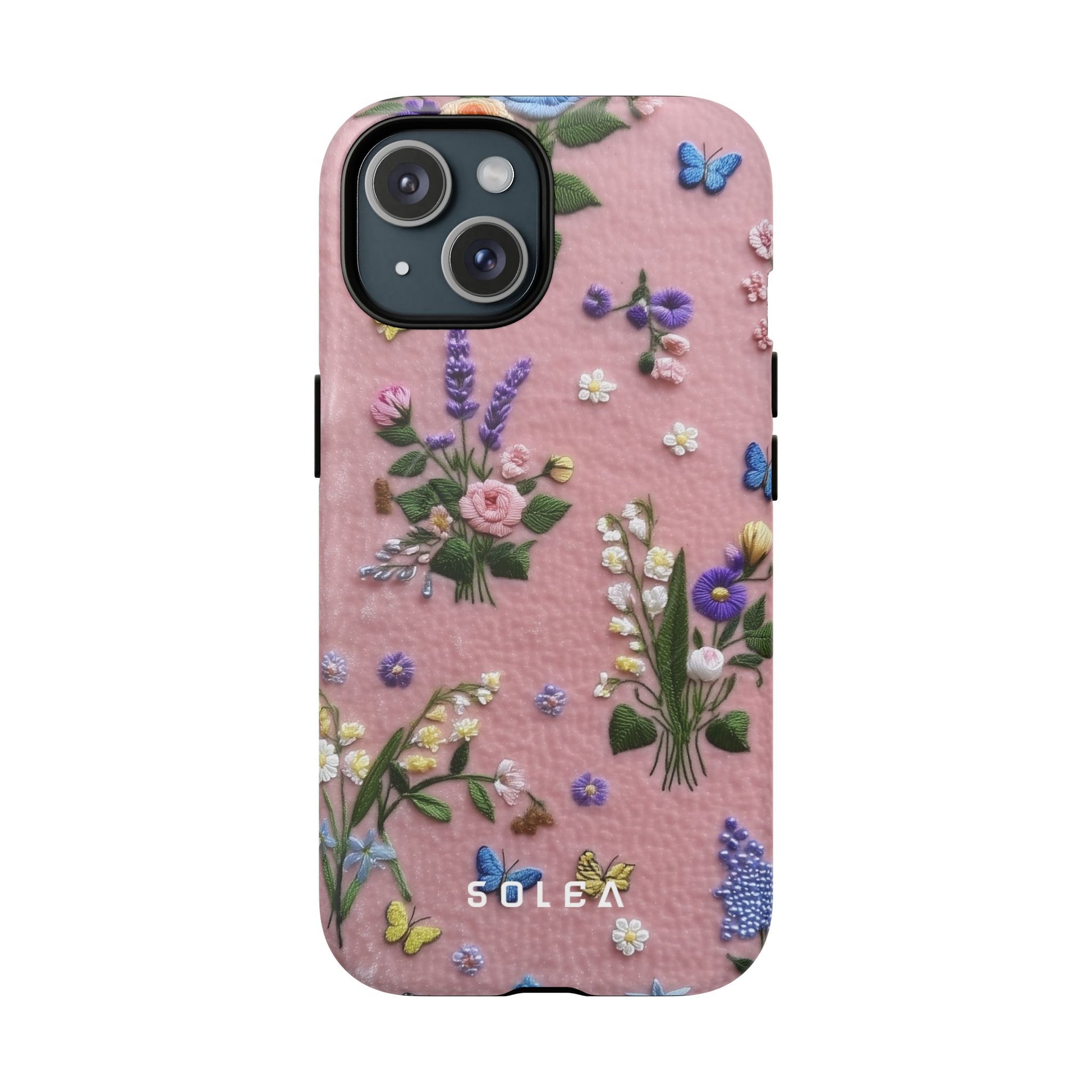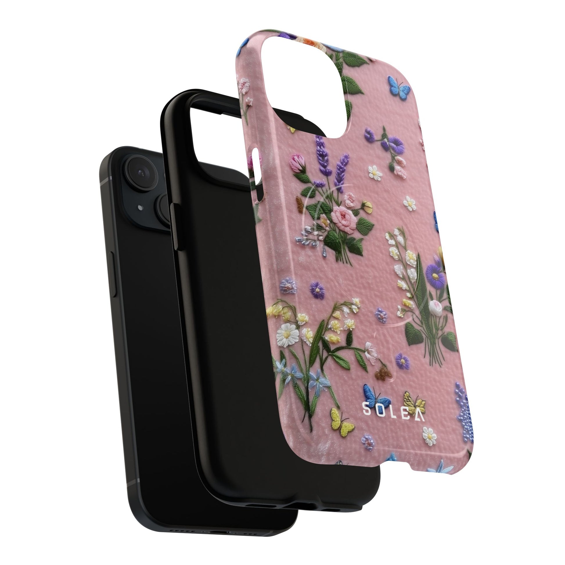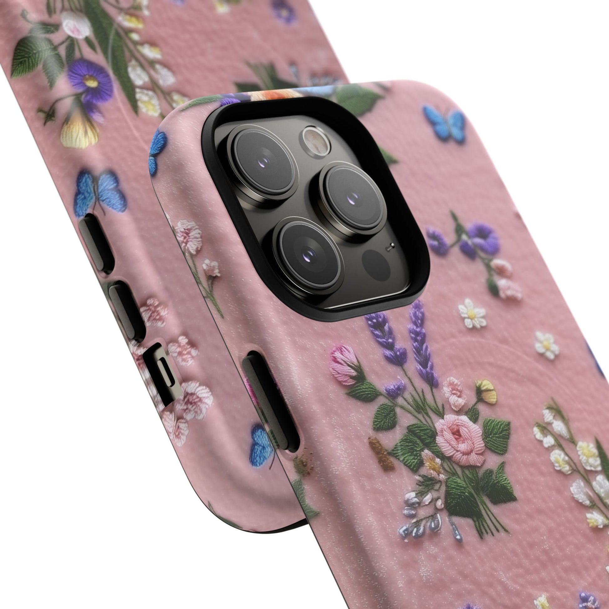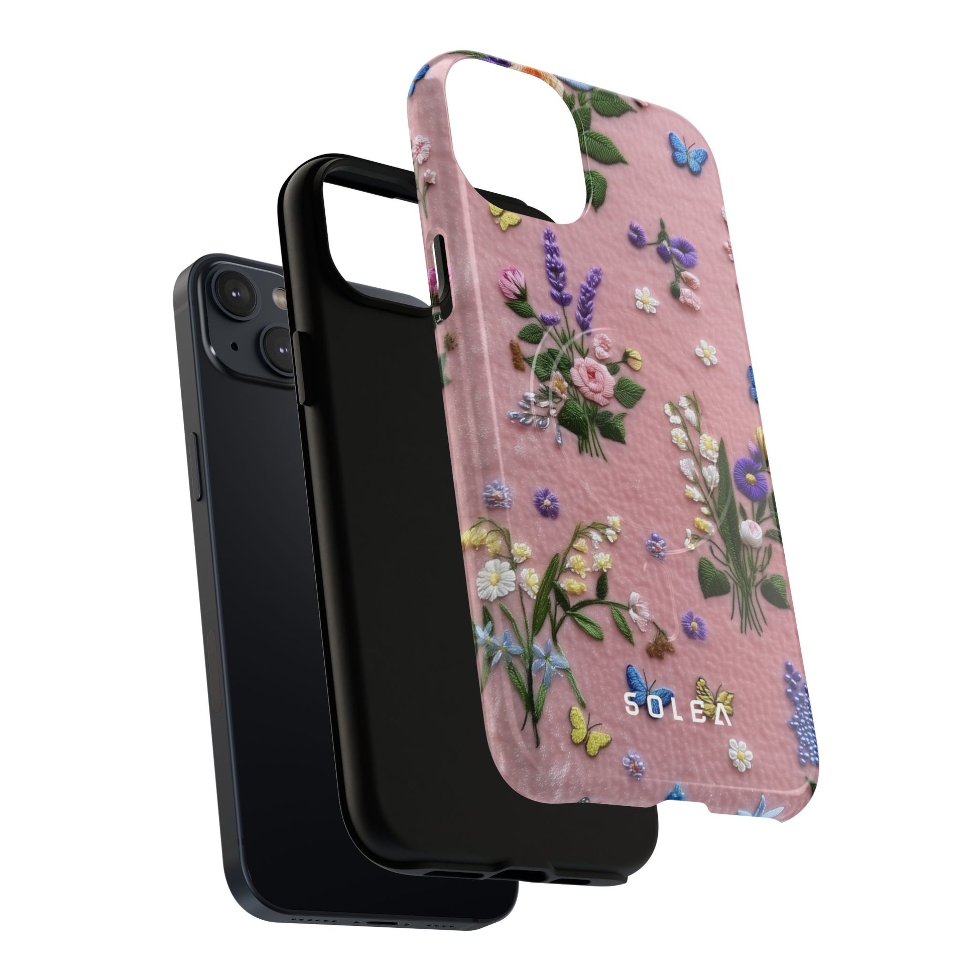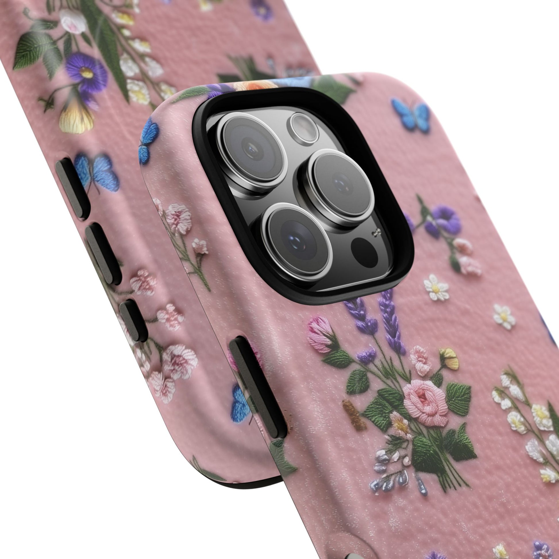 A slim, protective phone case featuring a soft embroidered floral pattern that blends delicate detail with a cozy, elegant aesthetic. Tiny blossoms in shades of pink, red, yellow, white, and light blue appear scattered across a creamy background, each flower connected by slender green stems that give the design a light, garden-inspired feel. The embroidered look adds subtle texture and charm while maintaining a clean, modern finish. Available in glossy or matte, the pattern remains crisp and vibrant while feeling smooth in hand. Built with a dual-layer shell and a shock-absorbing TPU liner, it helps protect your phone from everyday drops while staying slim and comfortable to hold. MagSafe® compatibility ensures your daily routine stays effortless—chargers, wallets, and grips attach instantly without removing the case. It’s a gentle blend of floral beauty and dependable protection.