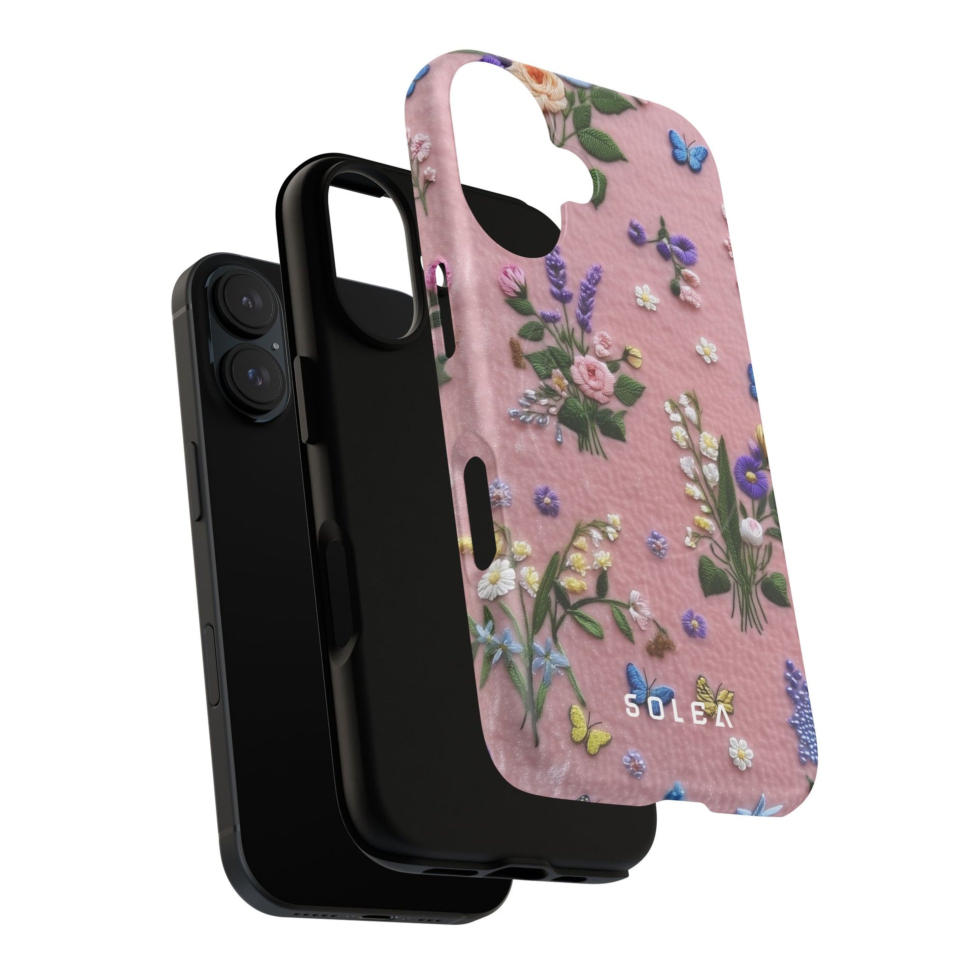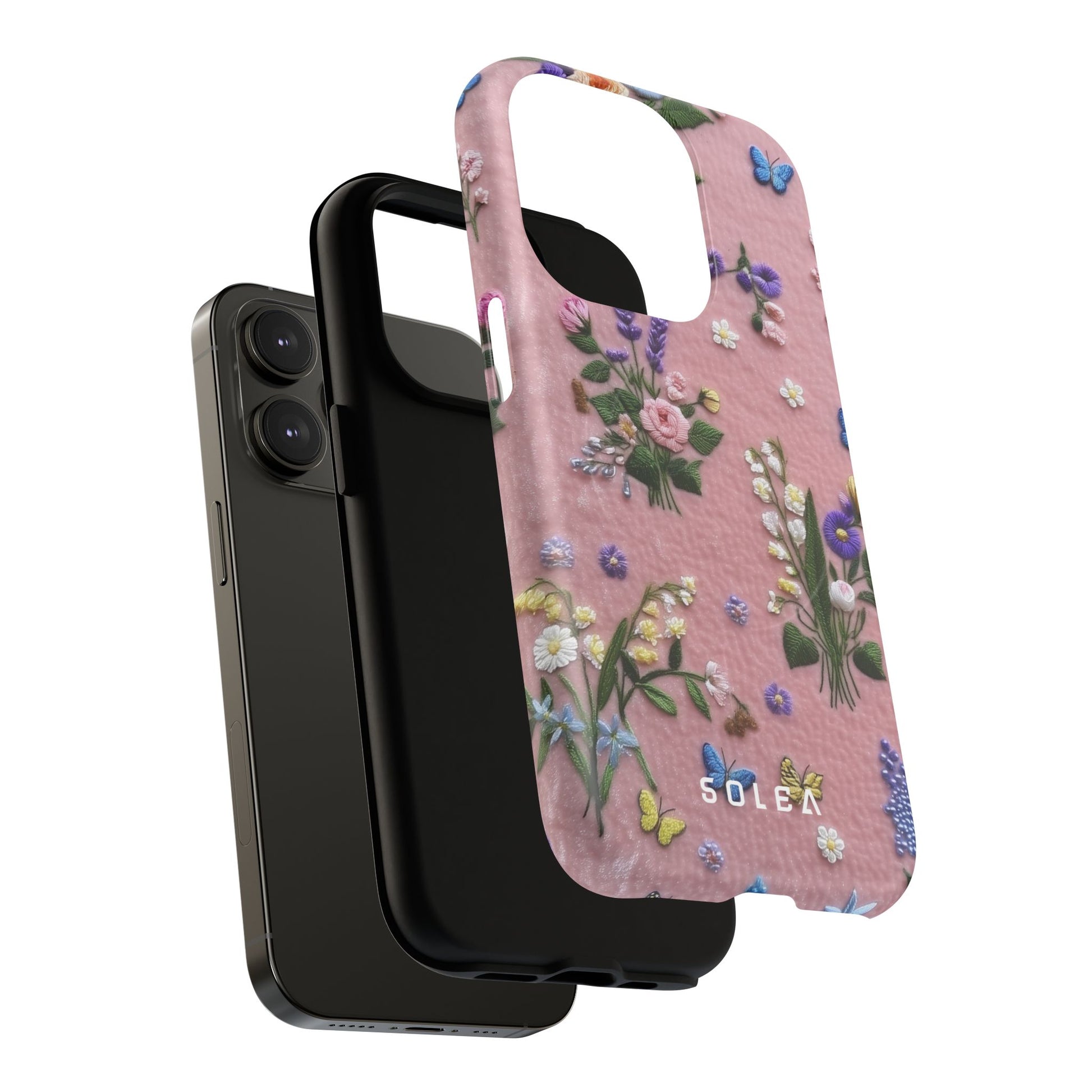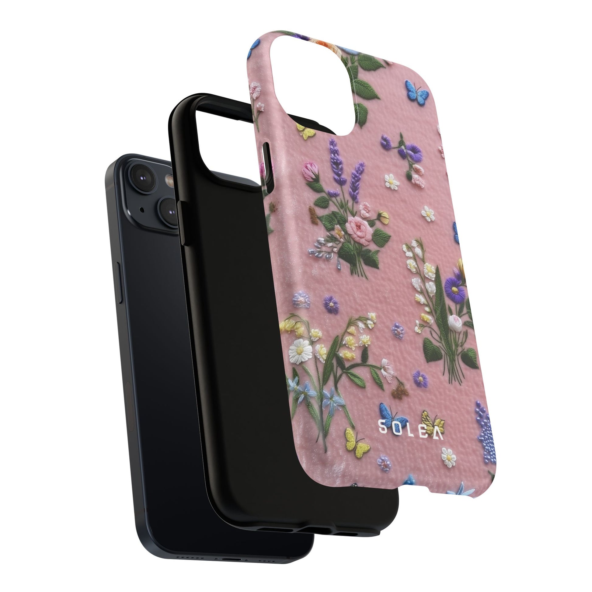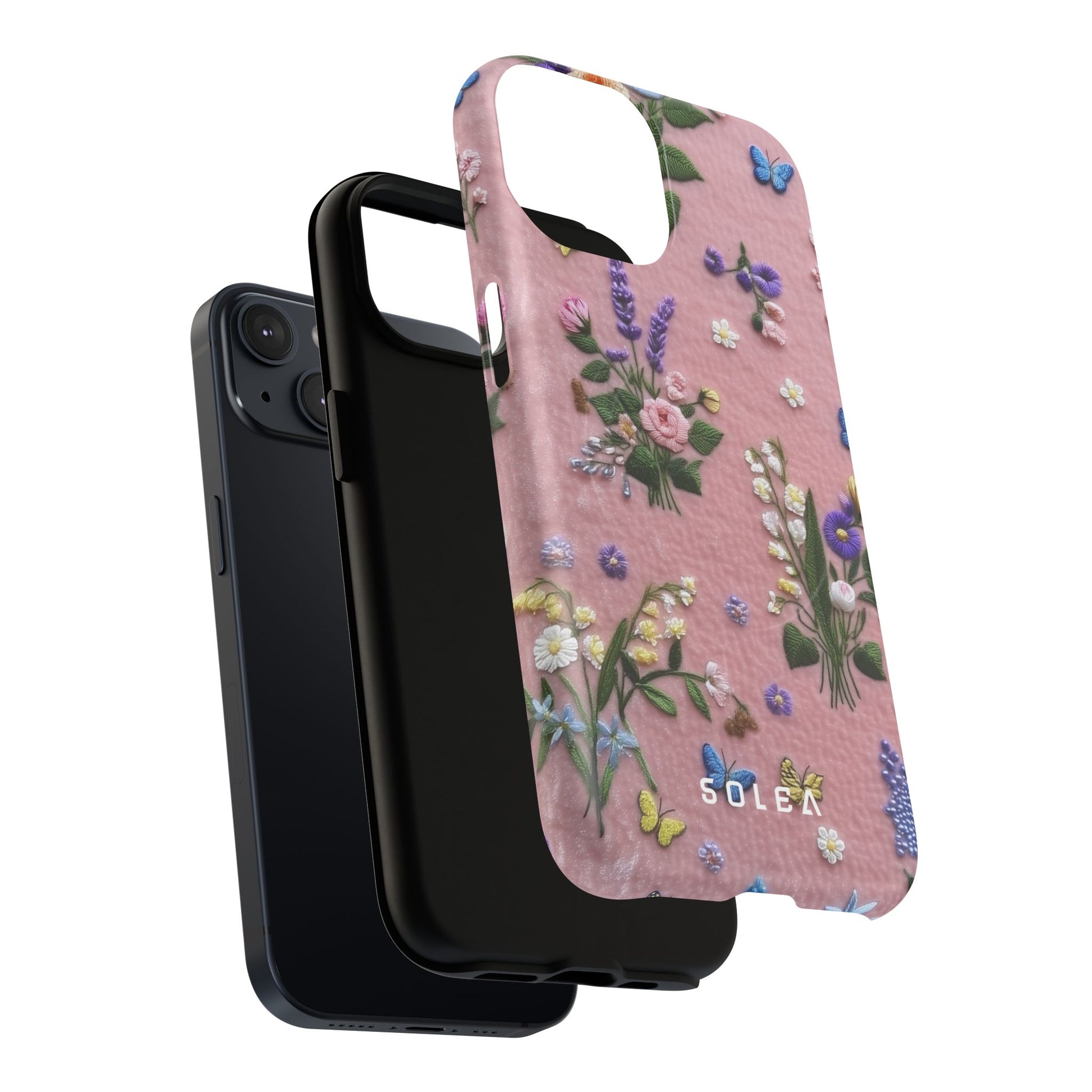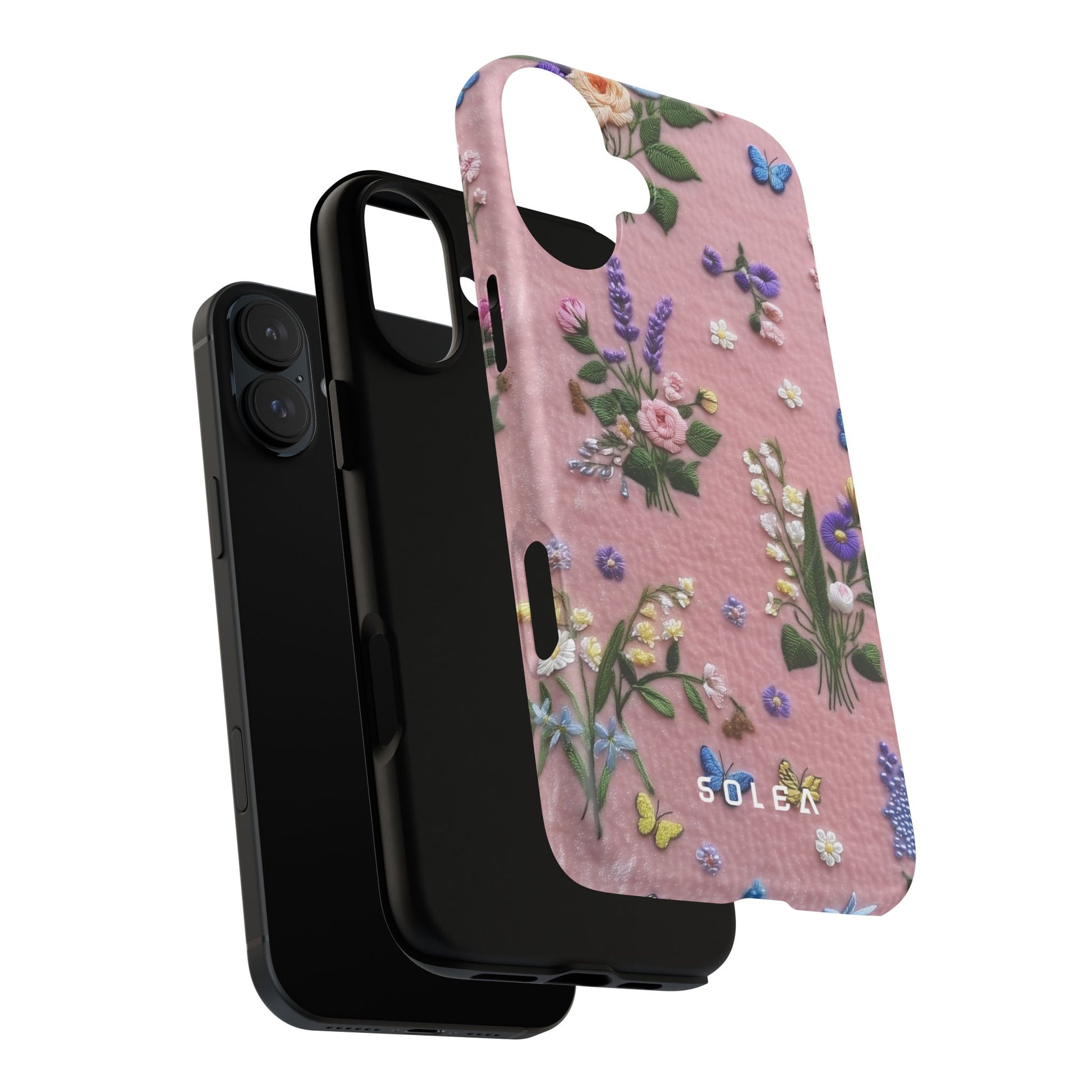 A slim, protective phone case featuring a soft embroidered floral pattern that blends delicate detail with a cozy, elegant aesthetic. Tiny blossoms in shades of pink, red, yellow, white, and light blue appear scattered across a creamy background, each flower connected by slender green stems that give the design a light, garden-inspired feel. The embroidered look adds subtle texture and charm while maintaining a clean, modern finish. Available in glossy or matte, the pattern remains crisp and vibrant while feeling smooth in hand. Built with a dual-layer shell and a shock-absorbing TPU liner, it helps protect your phone from everyday drops while staying slim and comfortable to hold. MagSafe® compatibility ensures your daily routine stays effortless—chargers, wallets, and grips attach instantly without removing the case. It’s a gentle blend of floral beauty and dependable protection.