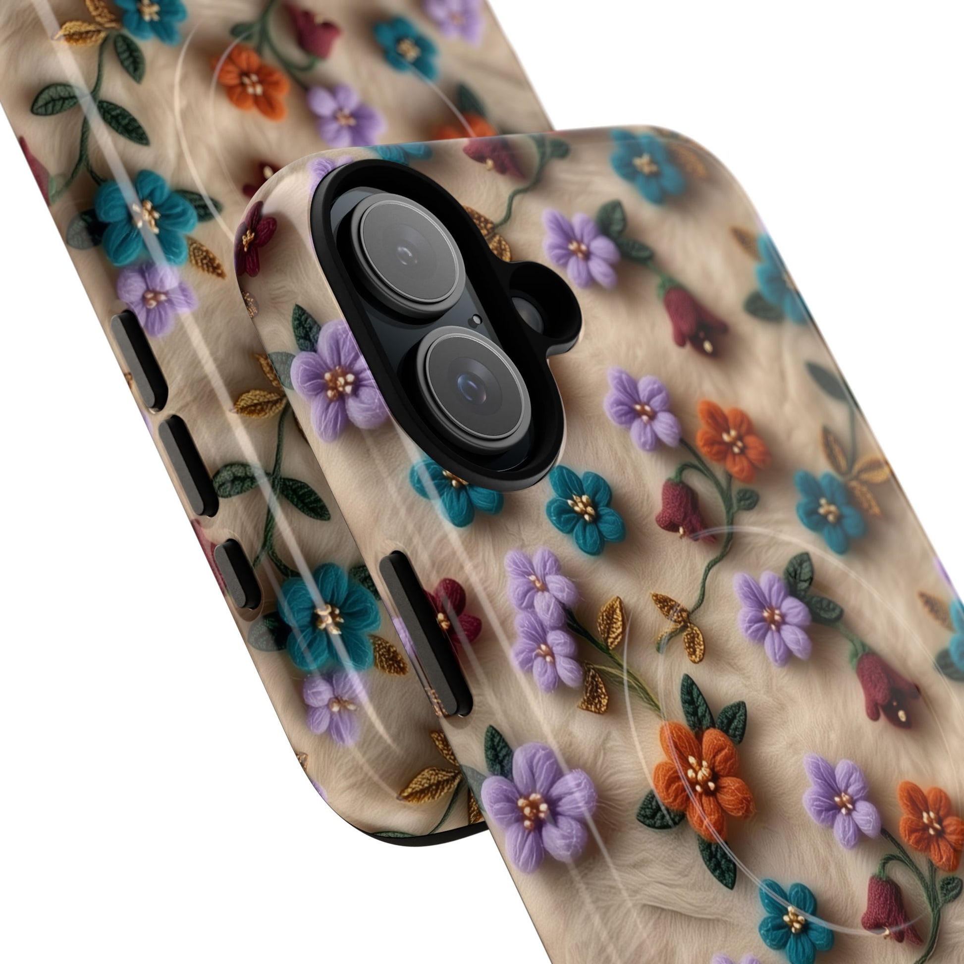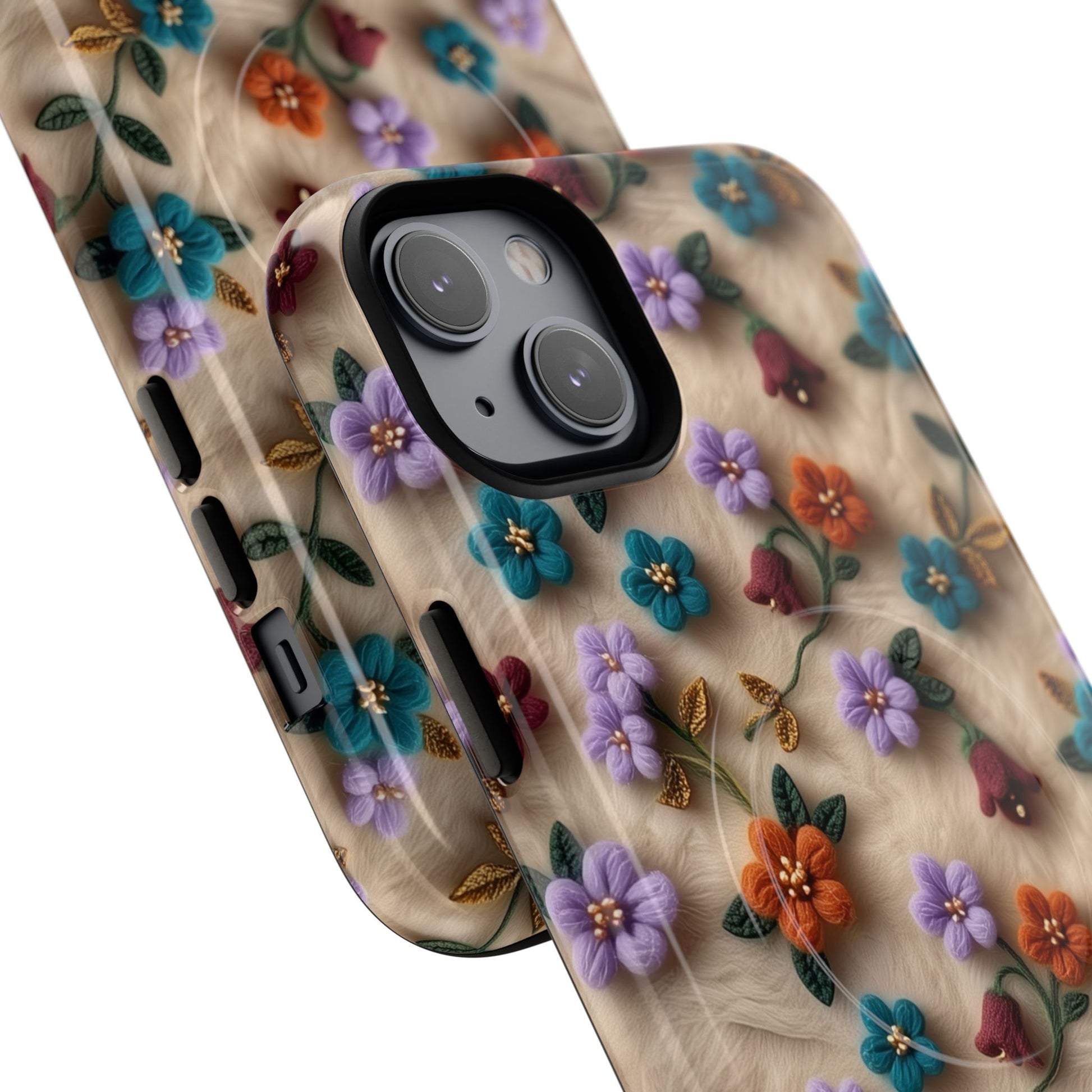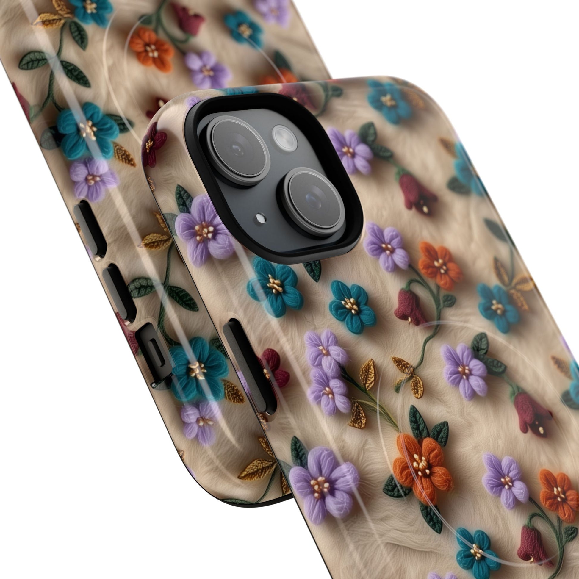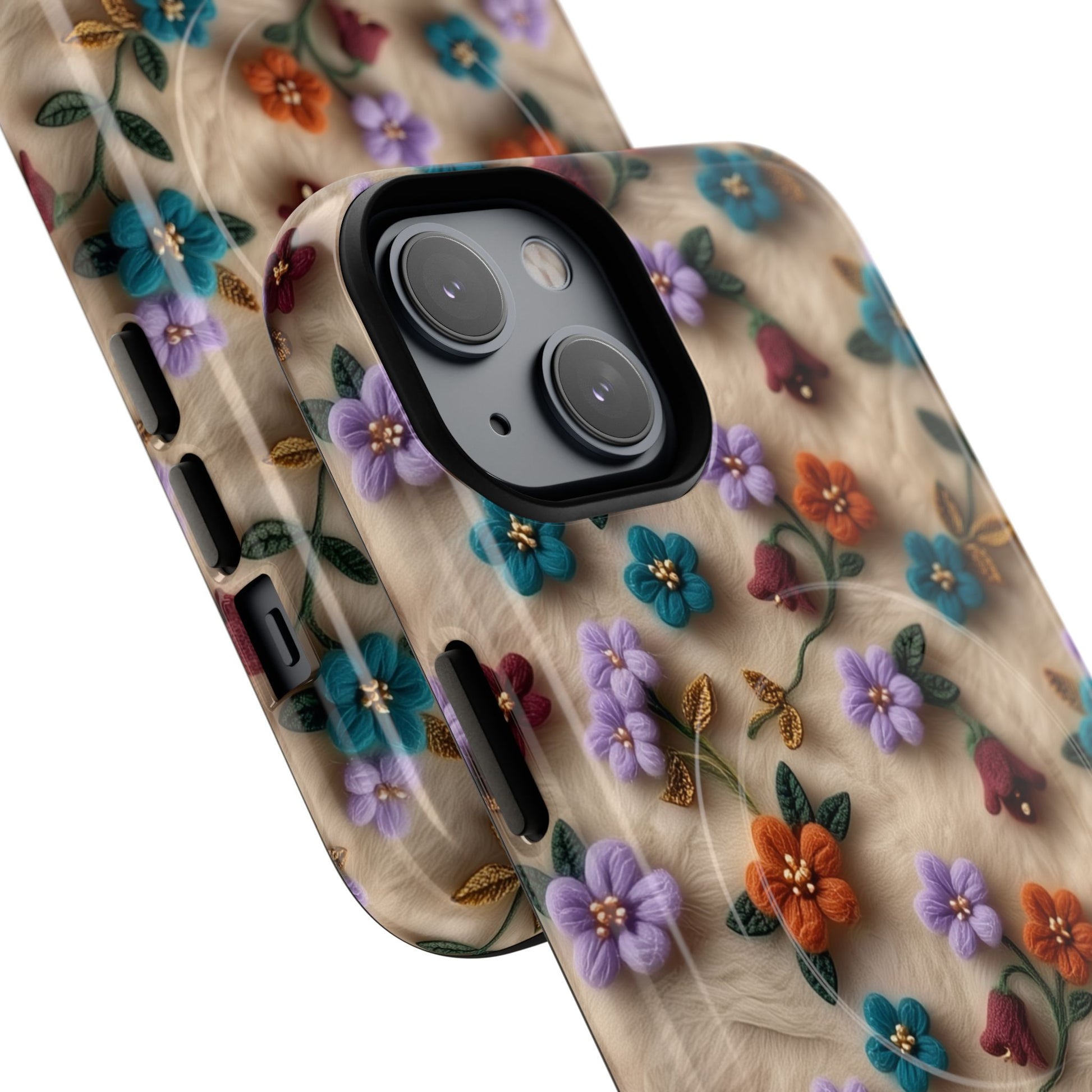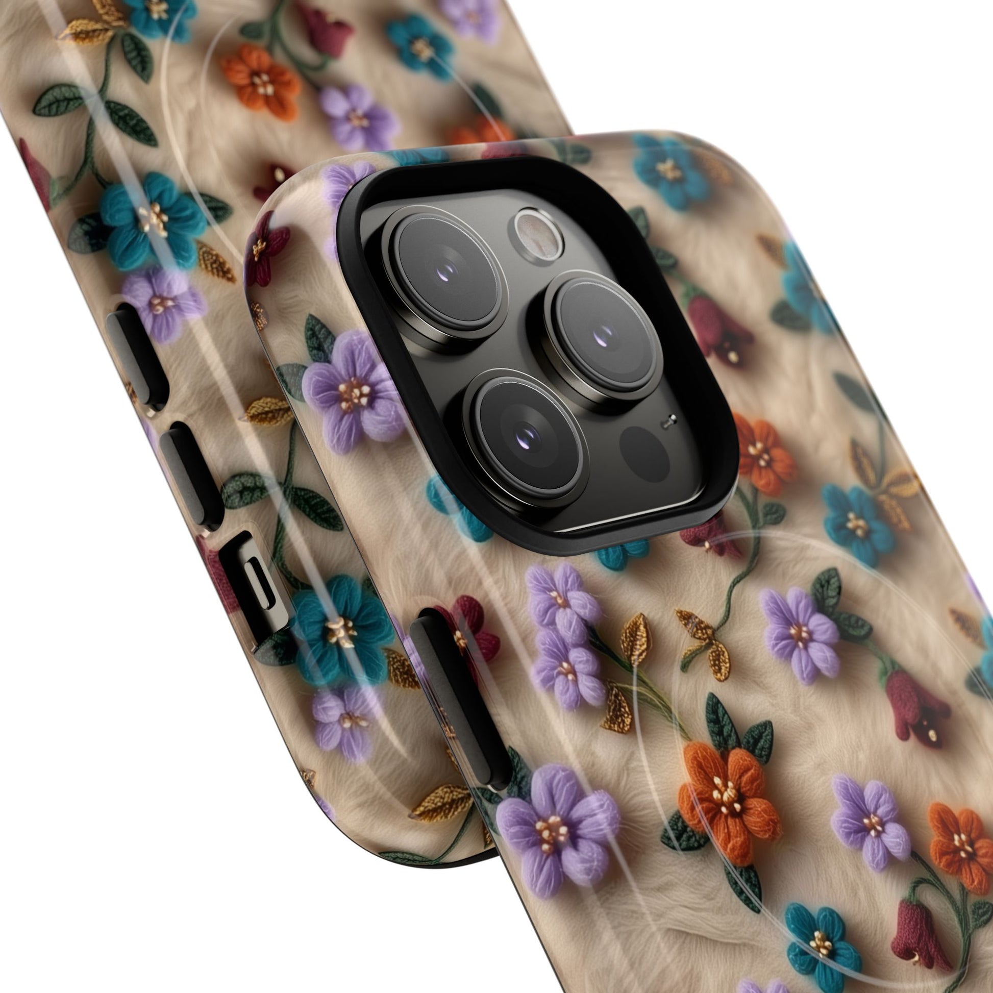 A slim, protective phone case featuring a soft embroidered floral pattern that blends delicate detail with a cozy, elegant aesthetic. Tiny blossoms in shades of pink, red, yellow, white, and light blue appear scattered across a creamy background, each flower connected by slender green stems that give the design a light, garden-inspired feel. The embroidered look adds subtle texture and charm while maintaining a clean, modern finish. Available in glossy or matte, the pattern remains crisp and vibrant while feeling smooth in hand. Built with a dual-layer shell and a shock-absorbing TPU liner, it helps protect your phone from everyday drops while staying slim and comfortable to hold. MagSafe® compatibility ensures your daily routine stays effortless—chargers, wallets, and grips attach instantly without removing the case. It’s a gentle blend of floral beauty and dependable protection.