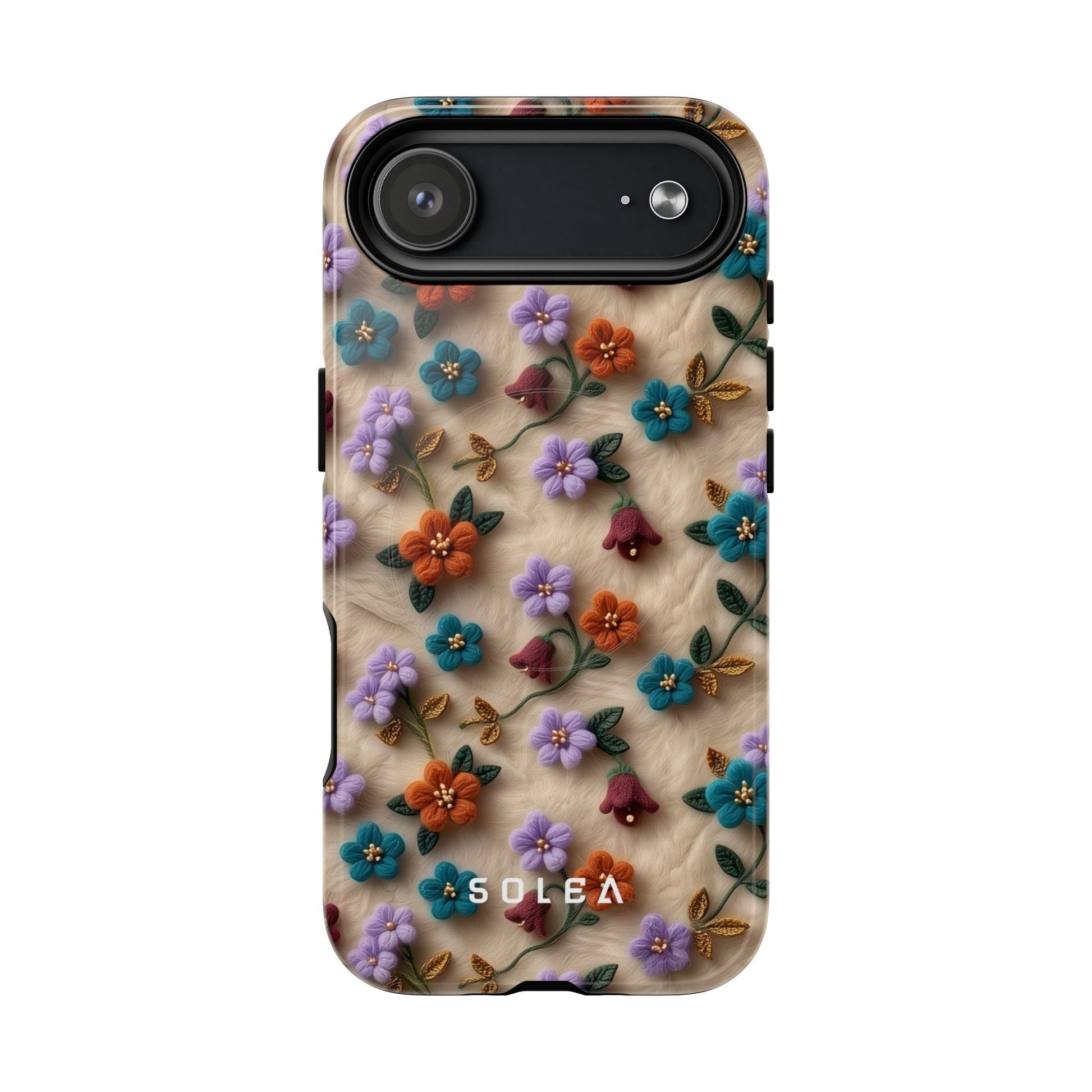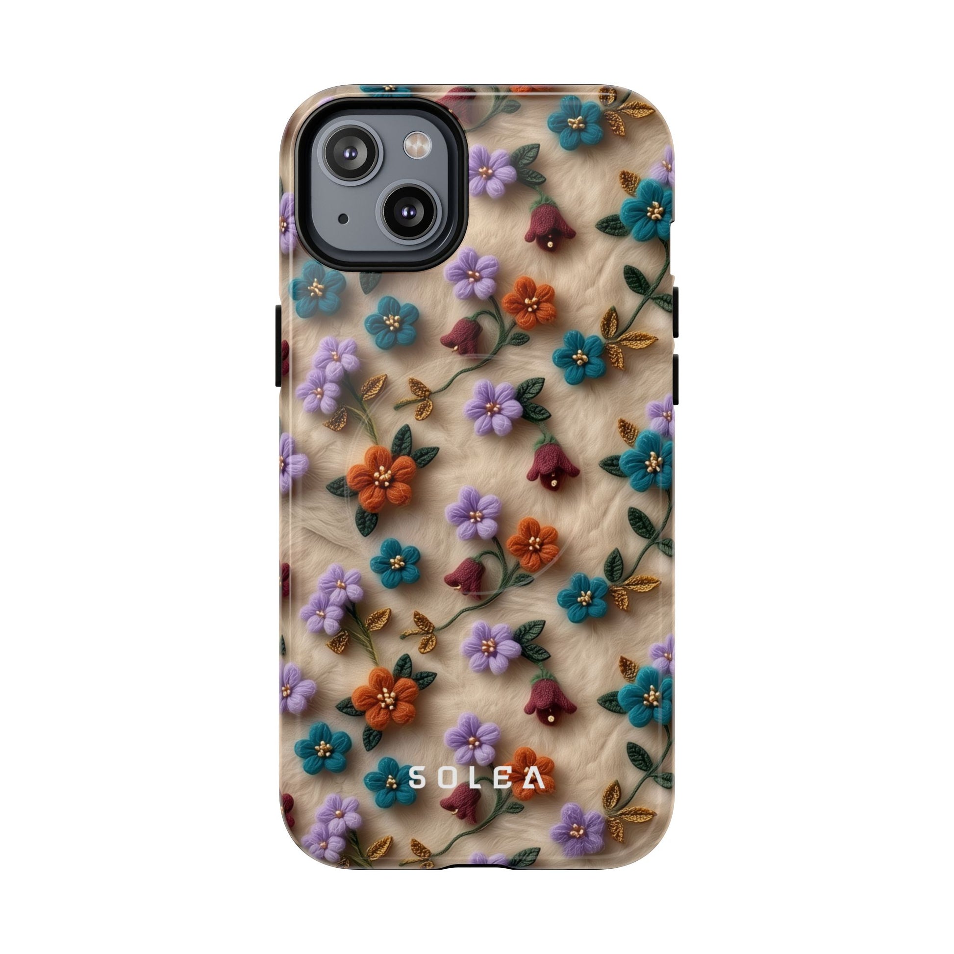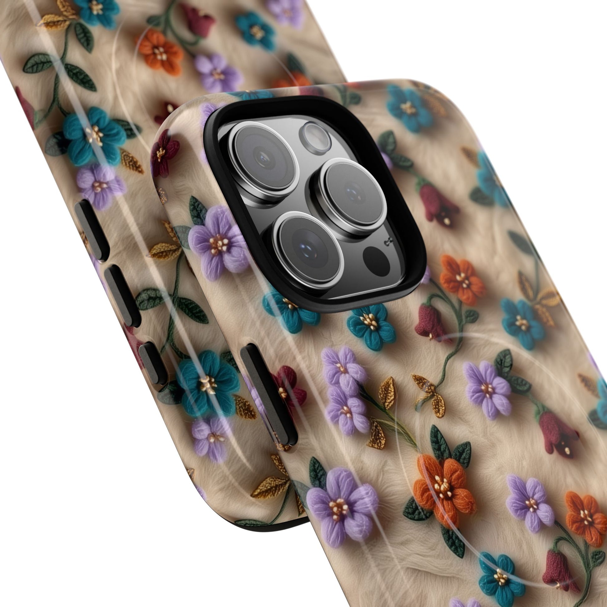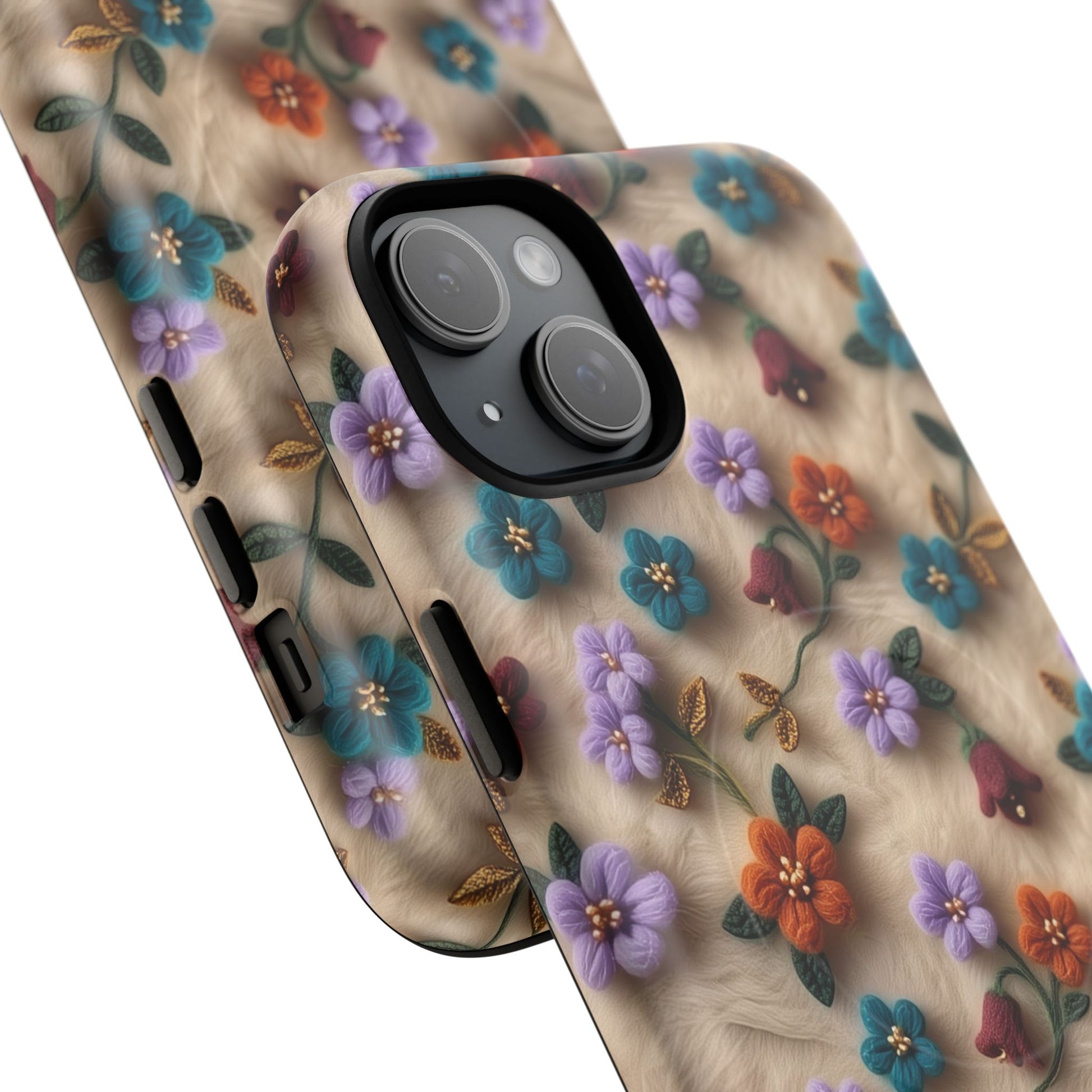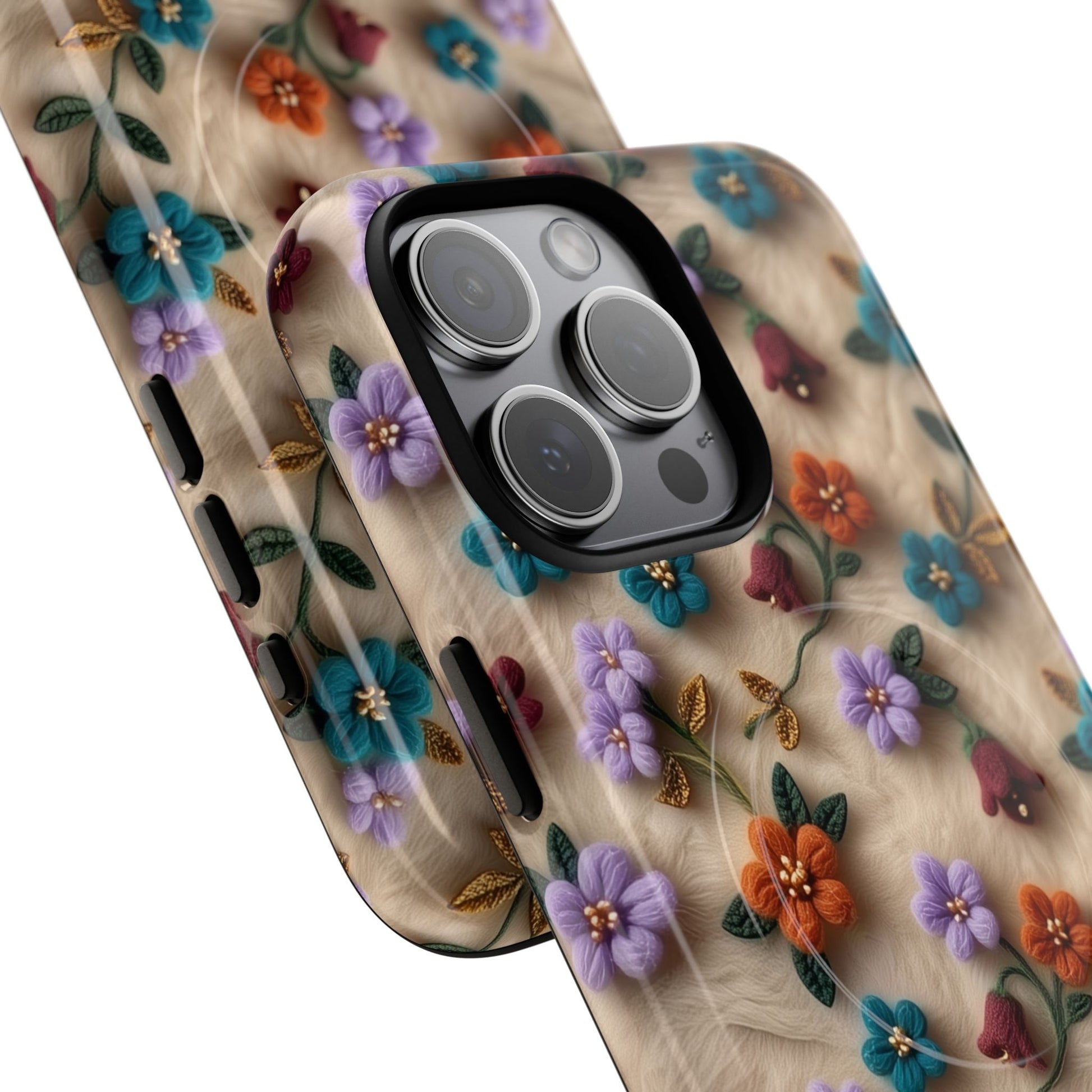 A slim, protective phone case featuring a soft embroidered floral pattern that blends delicate detail with a cozy, elegant aesthetic. Tiny blossoms in shades of pink, red, yellow, white, and light blue appear scattered across a creamy background, each flower connected by slender green stems that give the design a light, garden-inspired feel. The embroidered look adds subtle texture and charm while maintaining a clean, modern finish. Available in glossy or matte, the pattern remains crisp and vibrant while feeling smooth in hand. Built with a dual-layer shell and a shock-absorbing TPU liner, it helps protect your phone from everyday drops while staying slim and comfortable to hold. MagSafe® compatibility ensures your daily routine stays effortless—chargers, wallets, and grips attach instantly without removing the case. It’s a gentle blend of floral beauty and dependable protection.