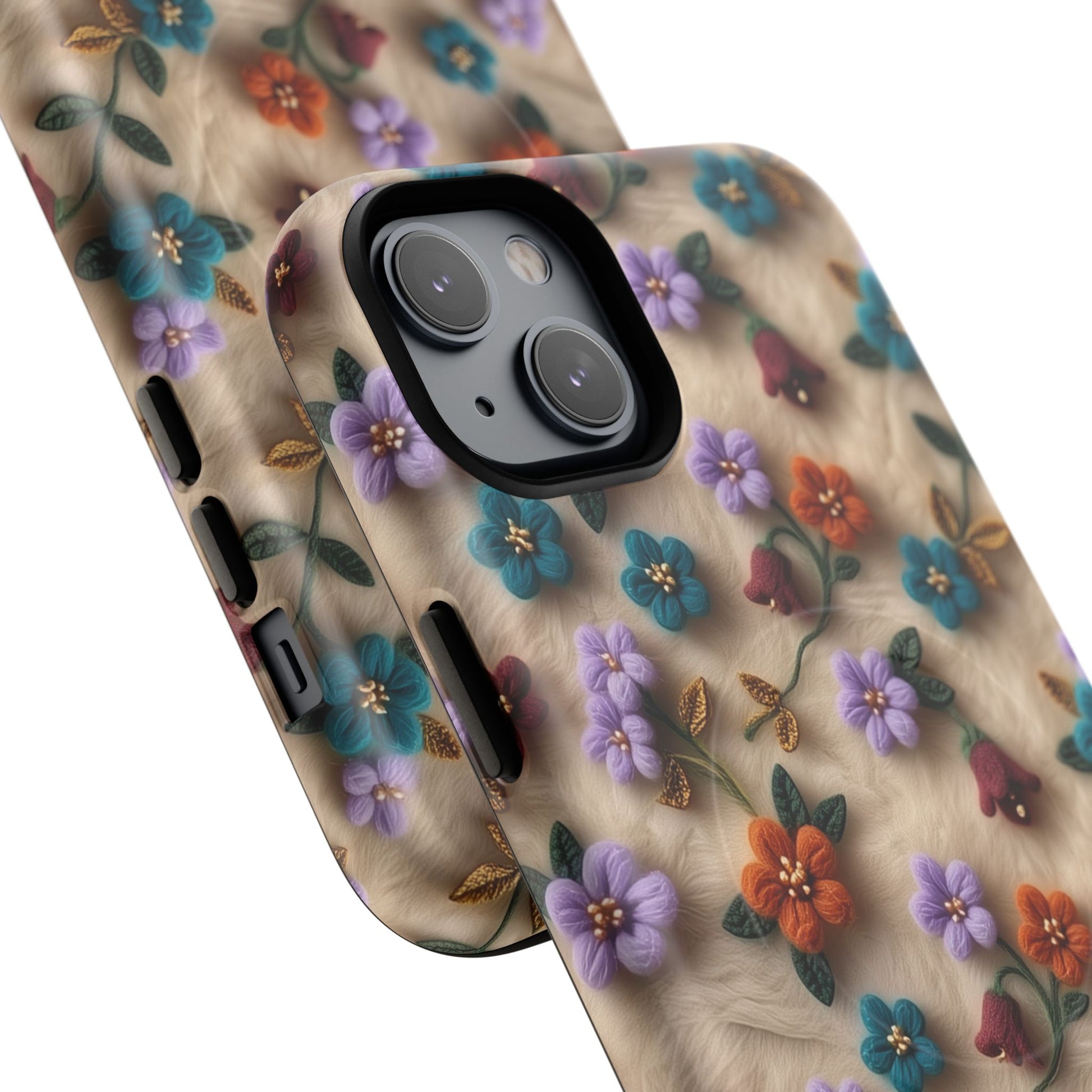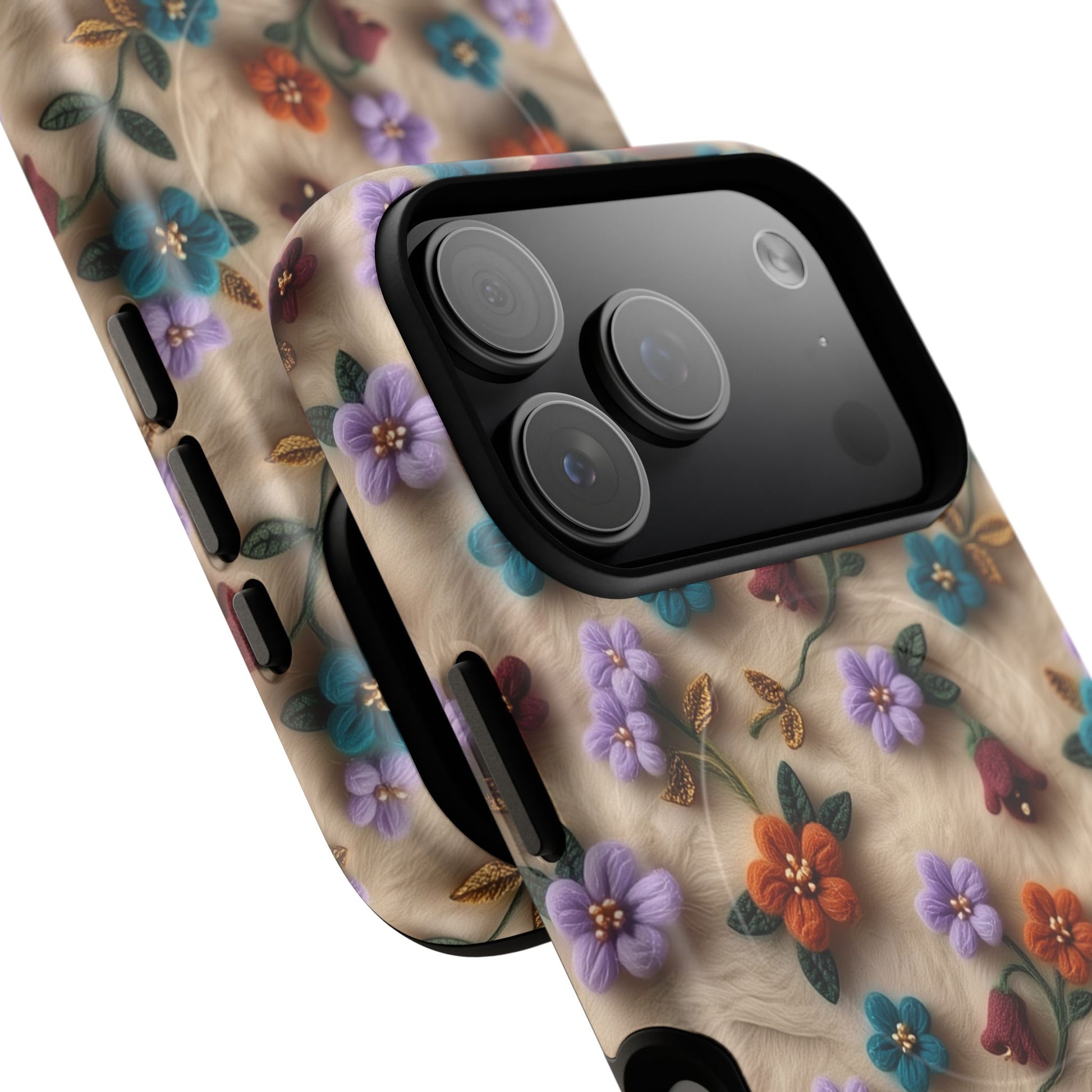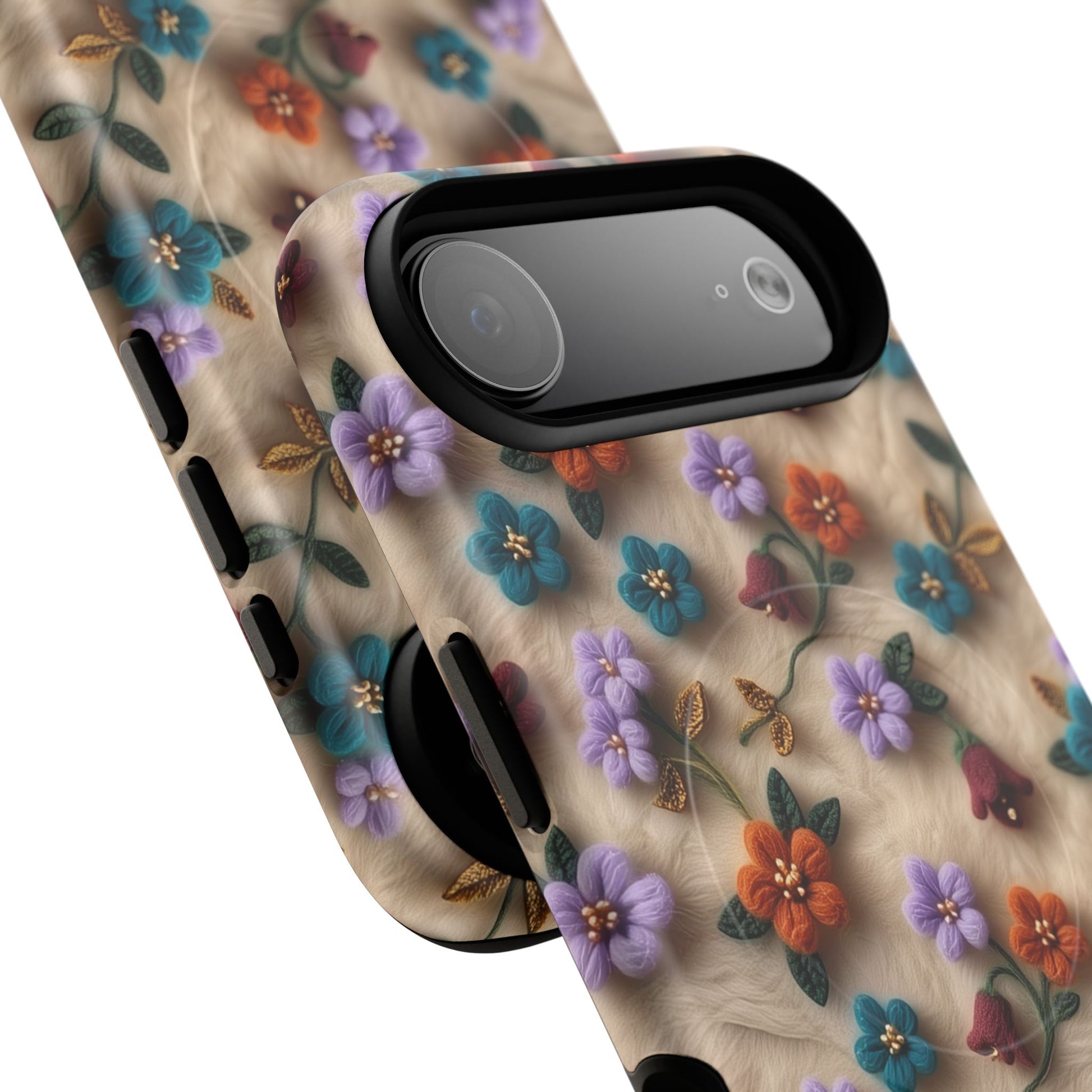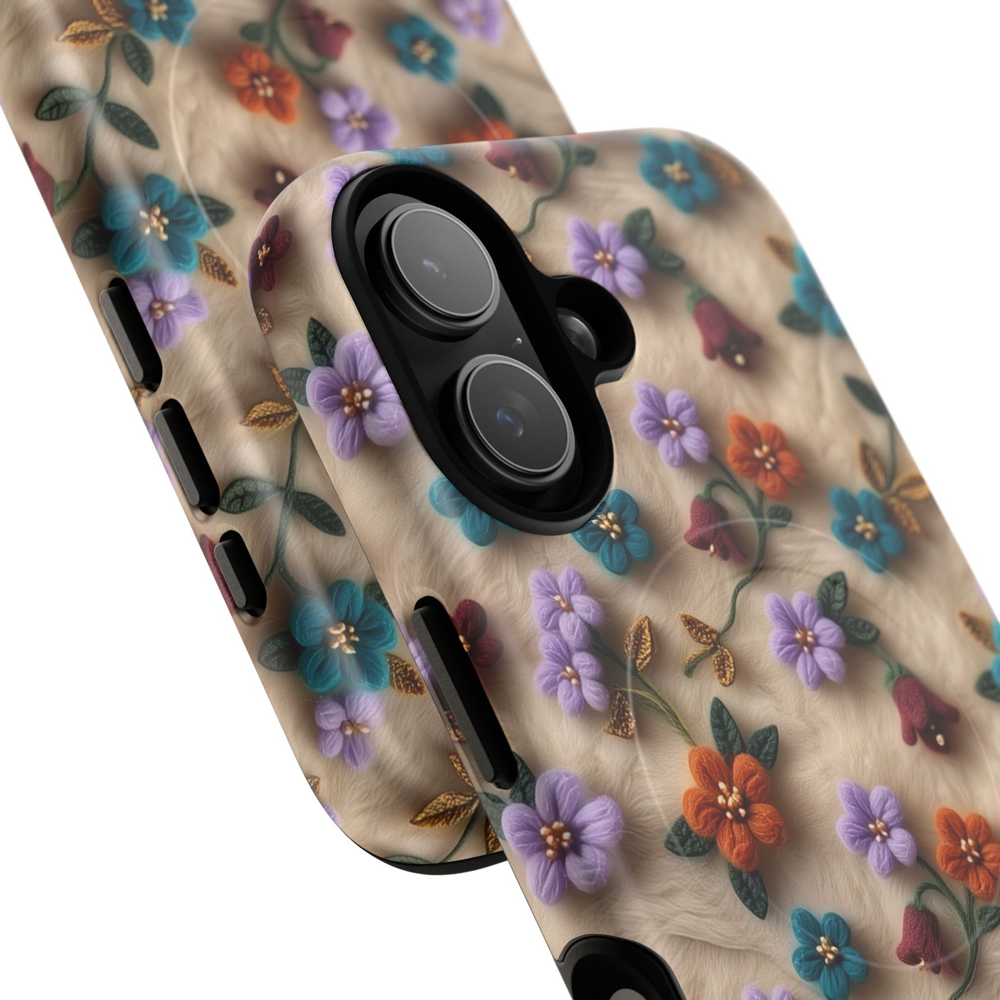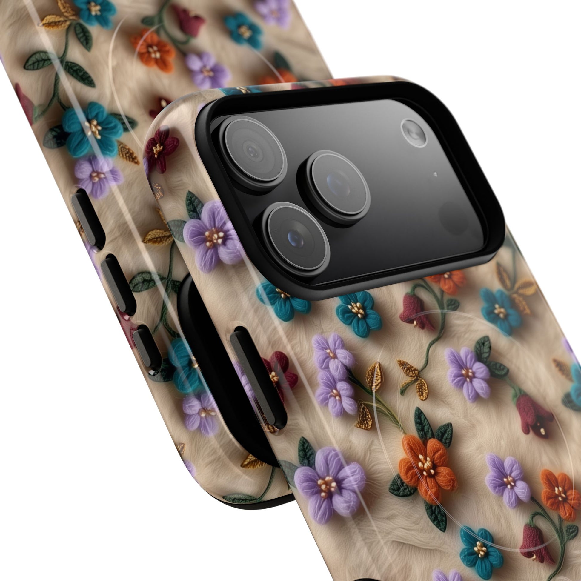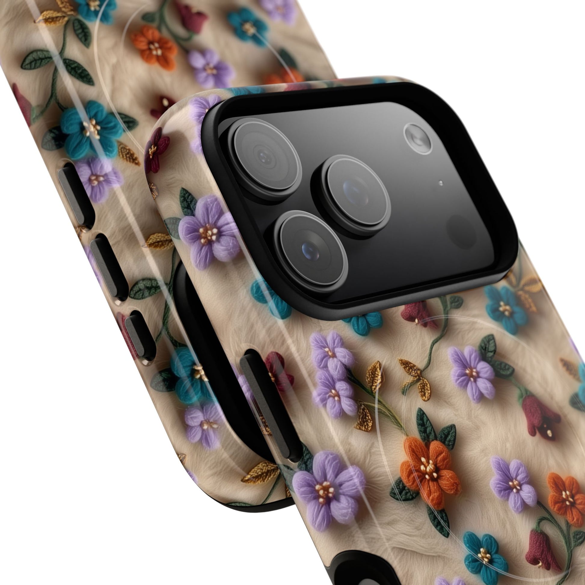 A slim, protective phone case featuring a soft embroidered floral pattern that blends delicate detail with a cozy, elegant aesthetic. Tiny blossoms in shades of pink, red, yellow, white, and light blue appear scattered across a creamy background, each flower connected by slender green stems that give the design a light, garden-inspired feel. The embroidered look adds subtle texture and charm while maintaining a clean, modern finish. Available in glossy or matte, the pattern remains crisp and vibrant while feeling smooth in hand. Built with a dual-layer shell and a shock-absorbing TPU liner, it helps protect your phone from everyday drops while staying slim and comfortable to hold. MagSafe® compatibility ensures your daily routine stays effortless—chargers, wallets, and grips attach instantly without removing the case. It’s a gentle blend of floral beauty and dependable protection.