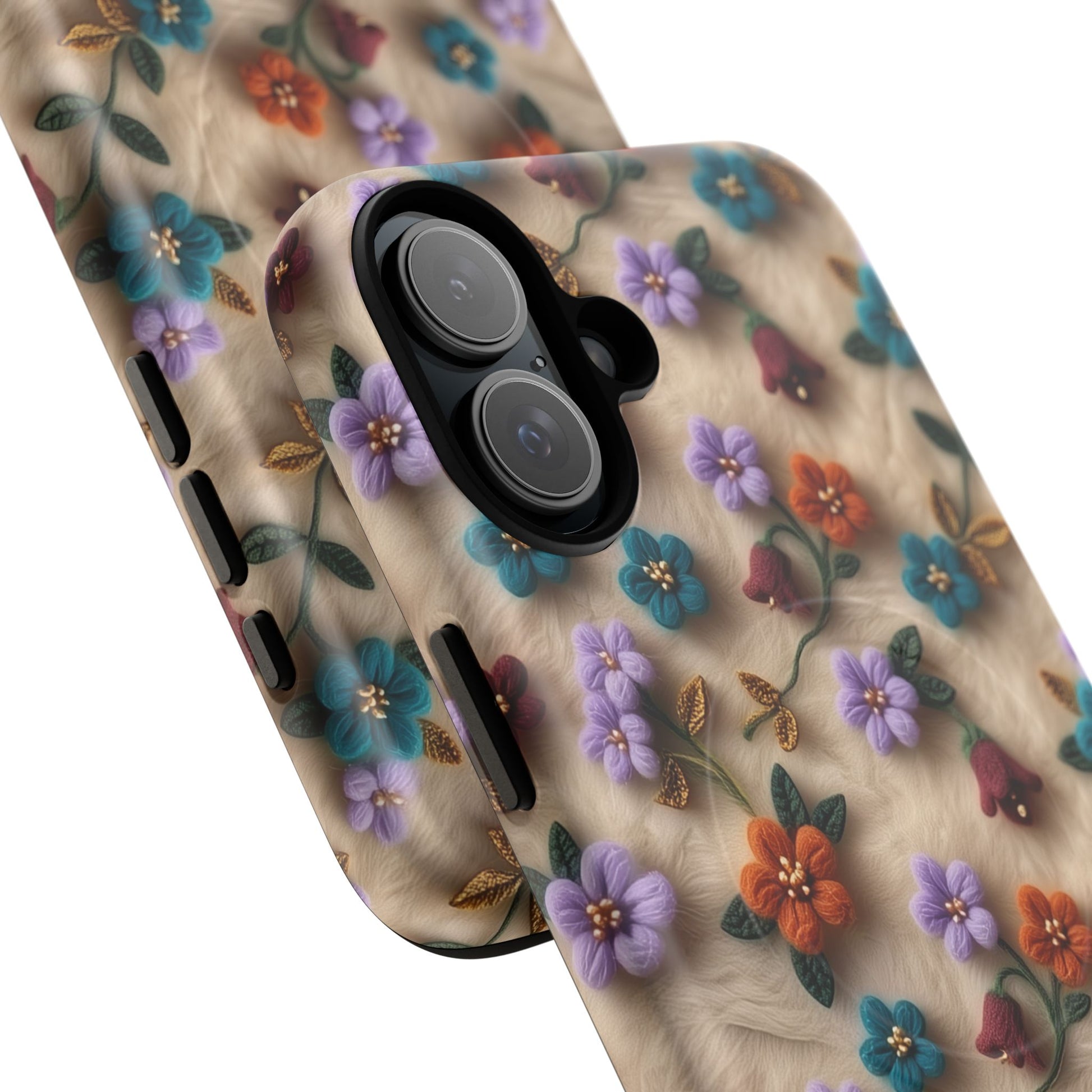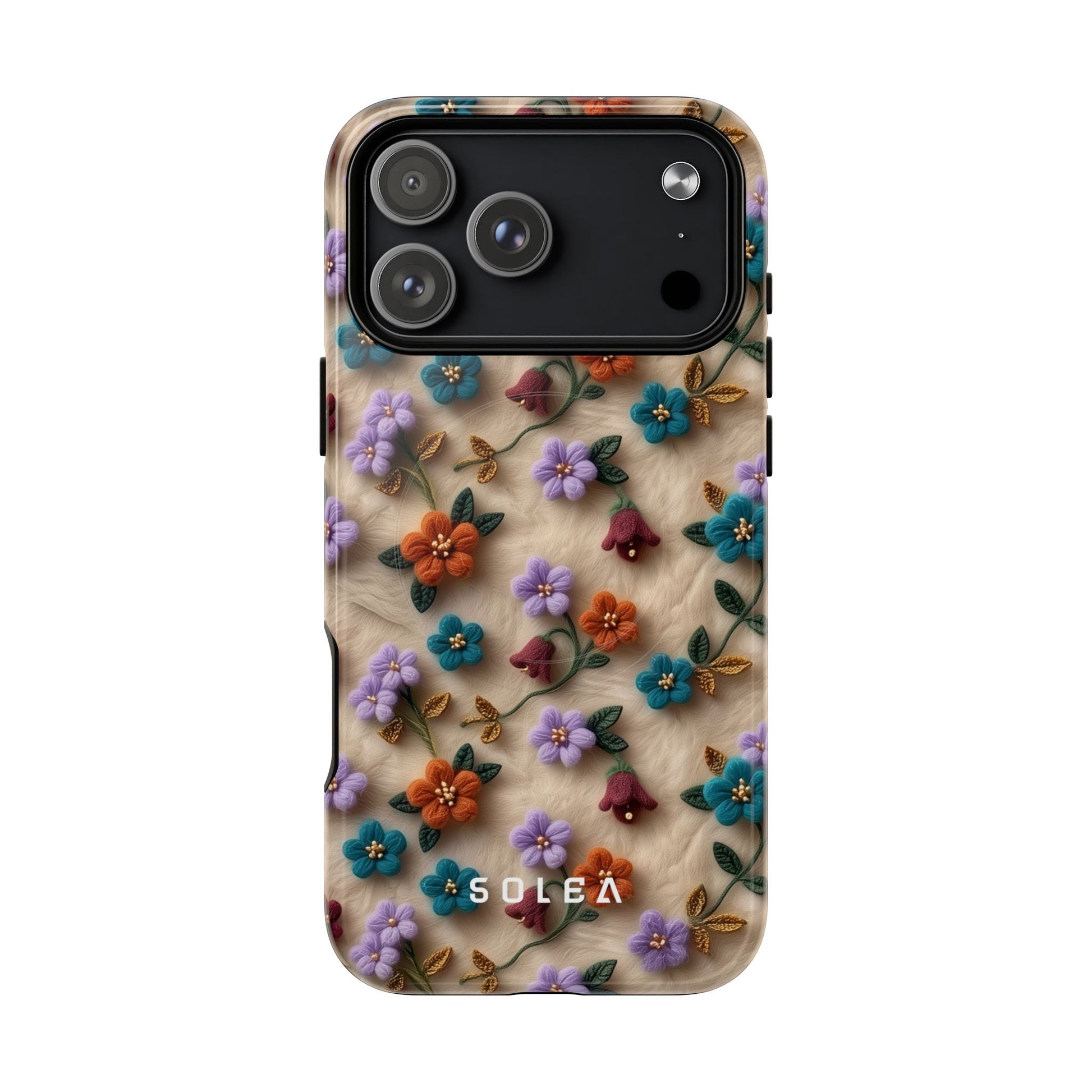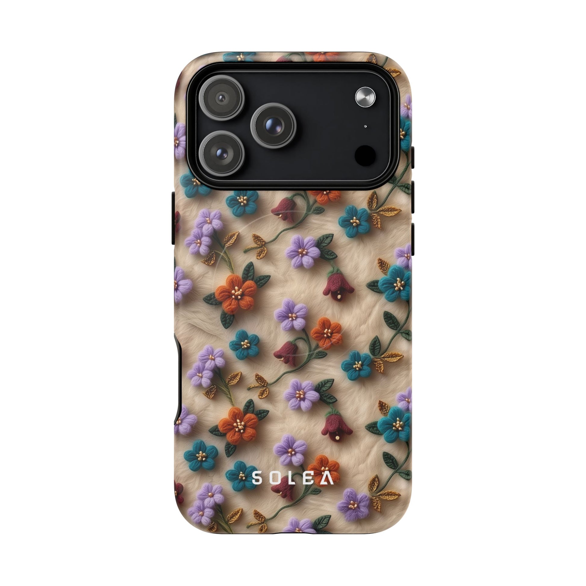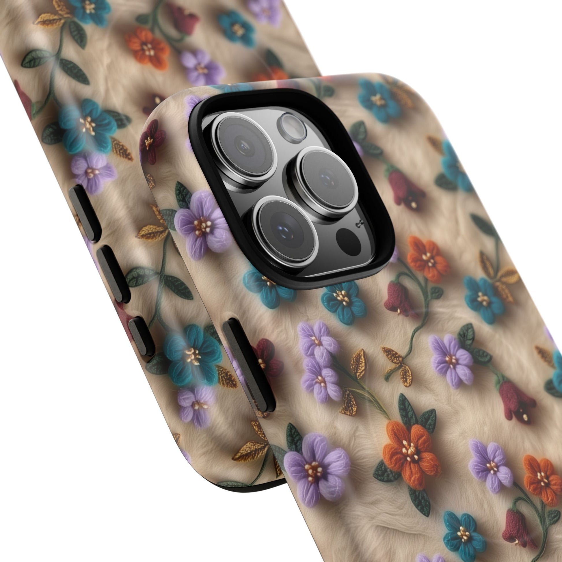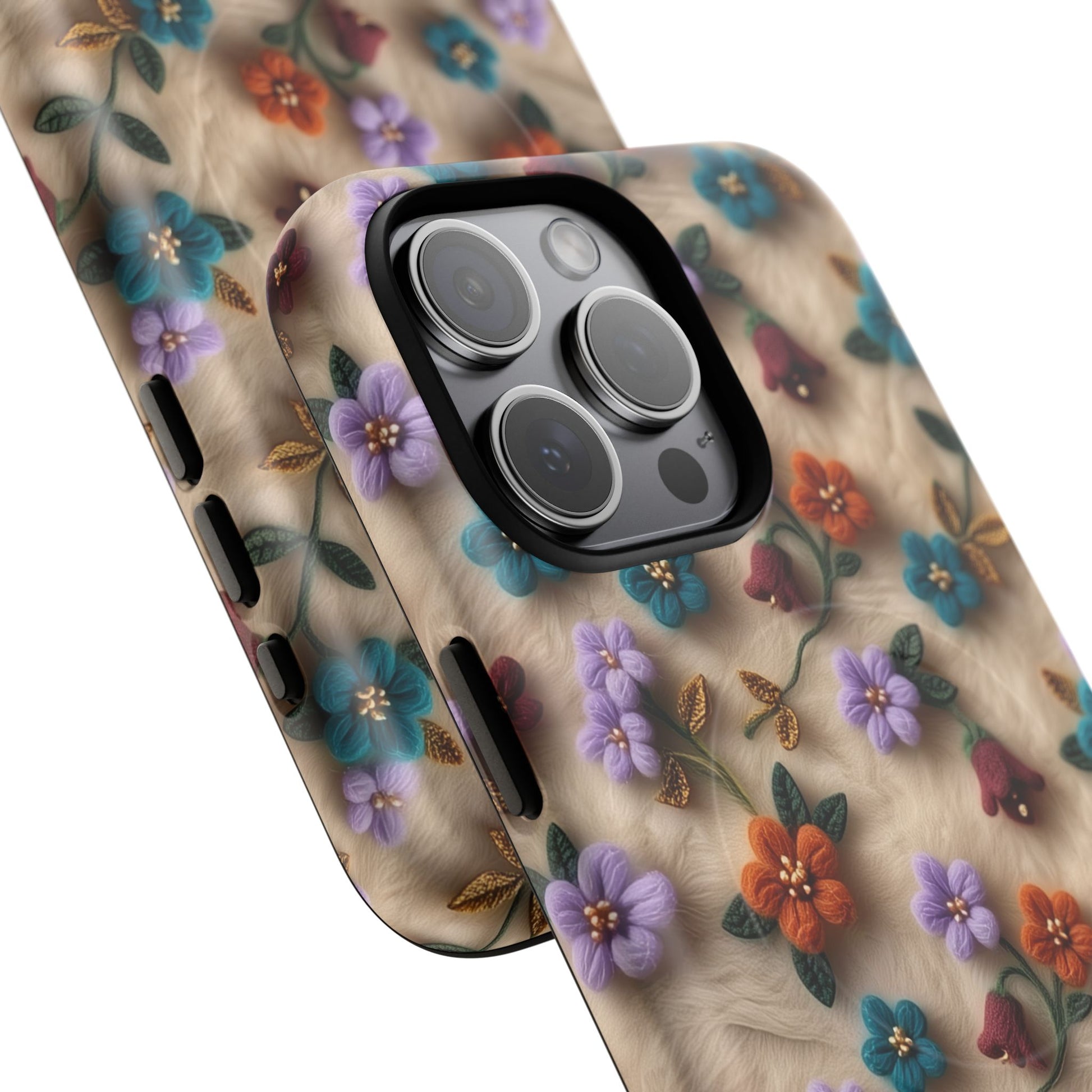 A slim, protective phone case featuring a soft embroidered floral pattern that blends delicate detail with a cozy, elegant aesthetic. Tiny blossoms in shades of pink, red, yellow, white, and light blue appear scattered across a creamy background, each flower connected by slender green stems that give the design a light, garden-inspired feel. The embroidered look adds subtle texture and charm while maintaining a clean, modern finish. Available in glossy or matte, the pattern remains crisp and vibrant while feeling smooth in hand. Built with a dual-layer shell and a shock-absorbing TPU liner, it helps protect your phone from everyday drops while staying slim and comfortable to hold. MagSafe® compatibility ensures your daily routine stays effortless—chargers, wallets, and grips attach instantly without removing the case. It’s a gentle blend of floral beauty and dependable protection.