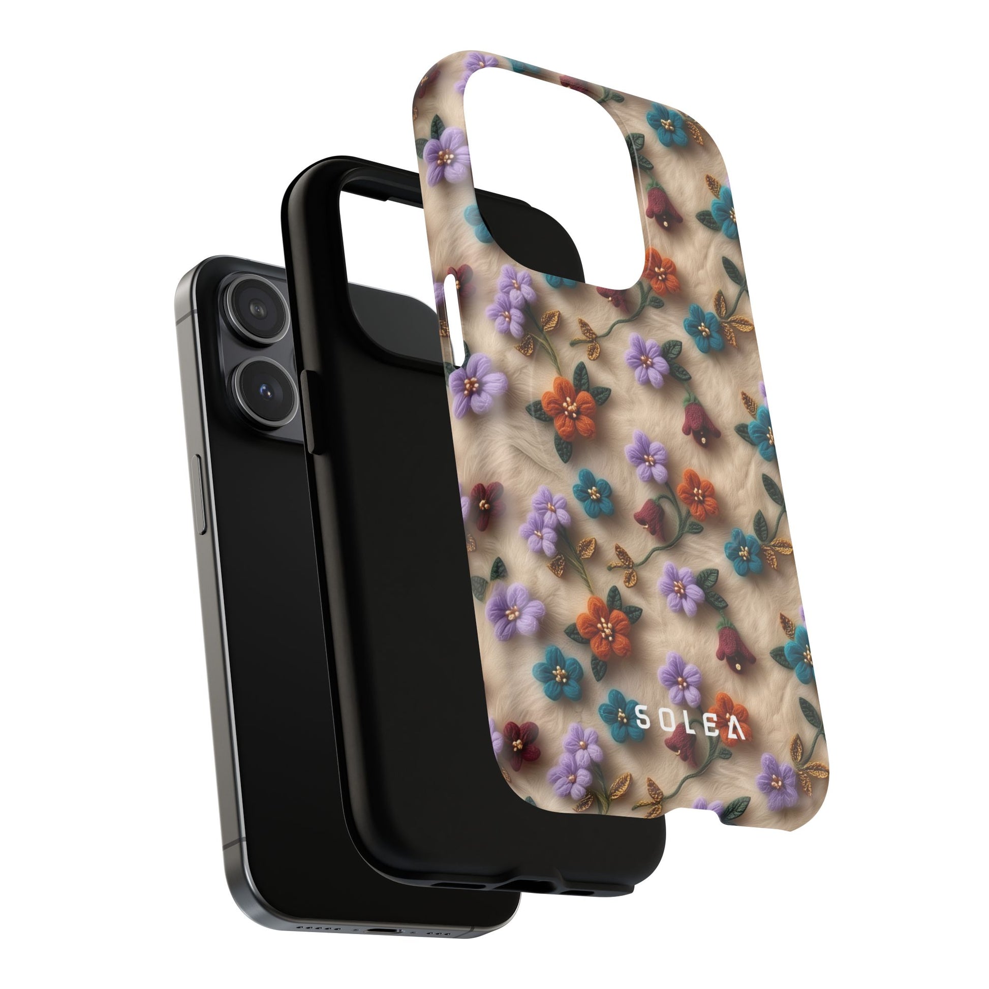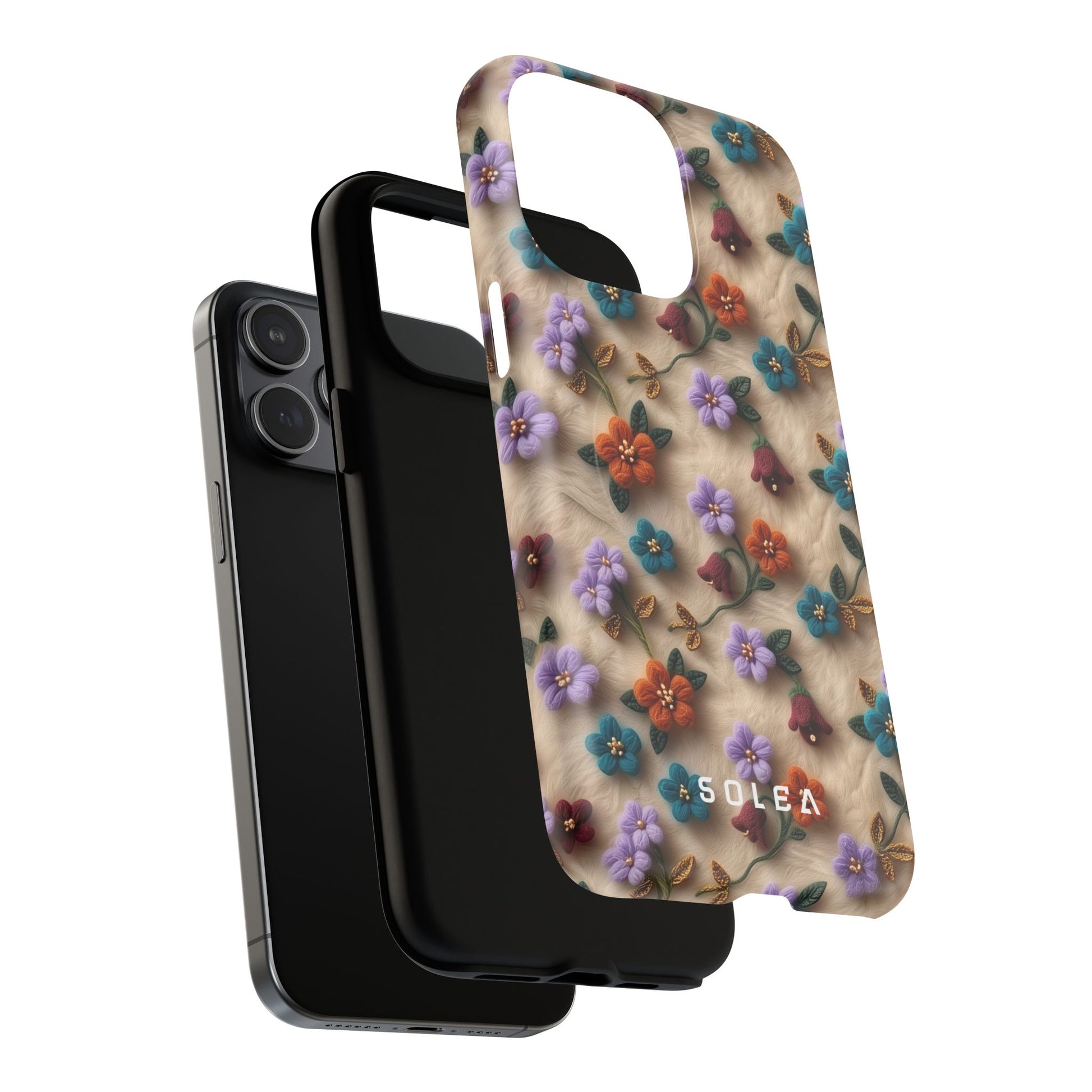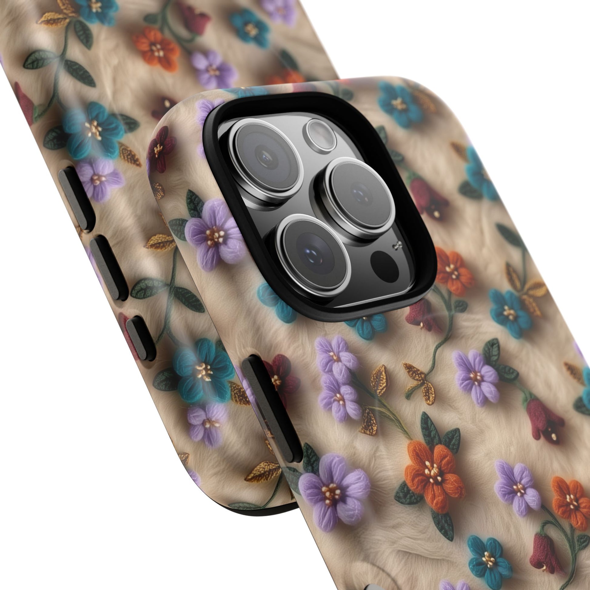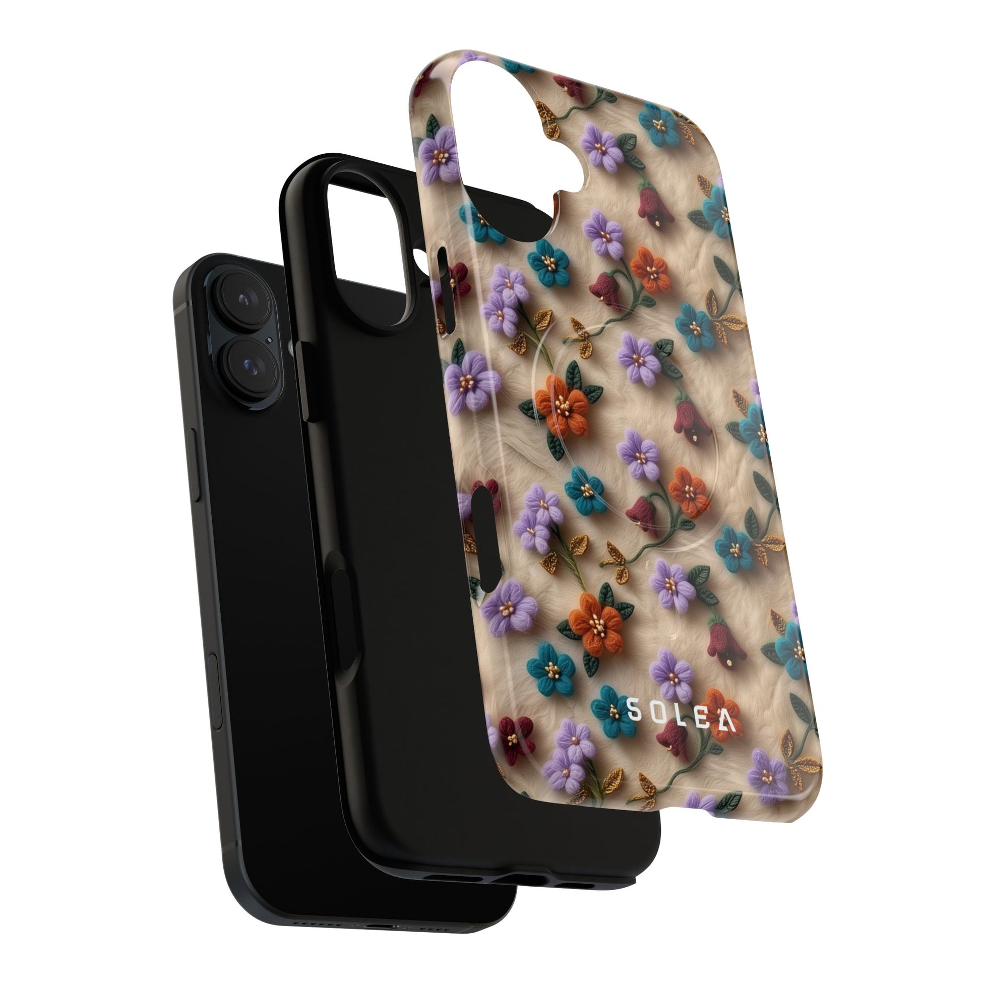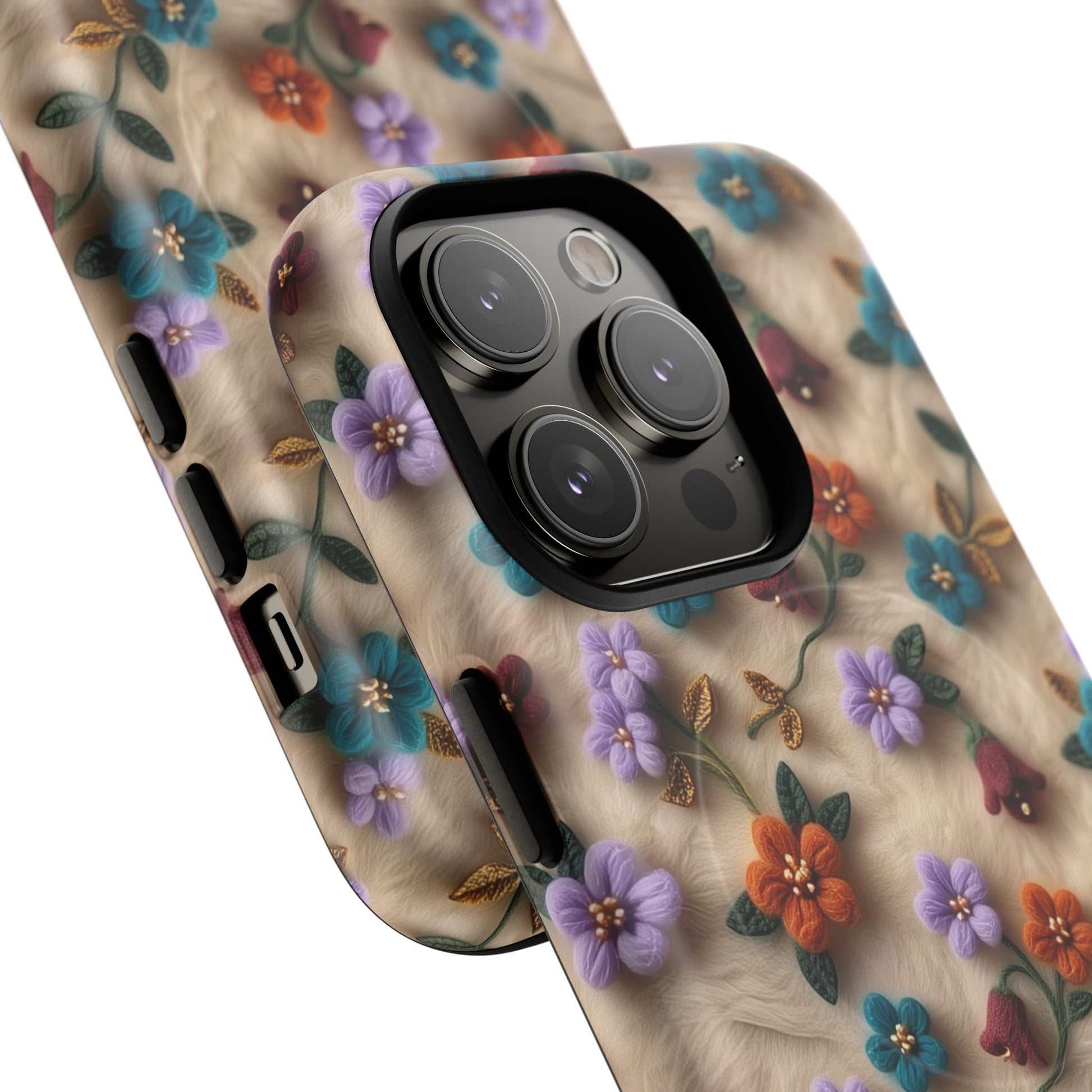 A slim, protective phone case featuring a soft embroidered floral pattern that blends delicate detail with a cozy, elegant aesthetic. Tiny blossoms in shades of pink, red, yellow, white, and light blue appear scattered across a creamy background, each flower connected by slender green stems that give the design a light, garden-inspired feel. The embroidered look adds subtle texture and charm while maintaining a clean, modern finish. Available in glossy or matte, the pattern remains crisp and vibrant while feeling smooth in hand. Built with a dual-layer shell and a shock-absorbing TPU liner, it helps protect your phone from everyday drops while staying slim and comfortable to hold. MagSafe® compatibility ensures your daily routine stays effortless—chargers, wallets, and grips attach instantly without removing the case. It’s a gentle blend of floral beauty and dependable protection.